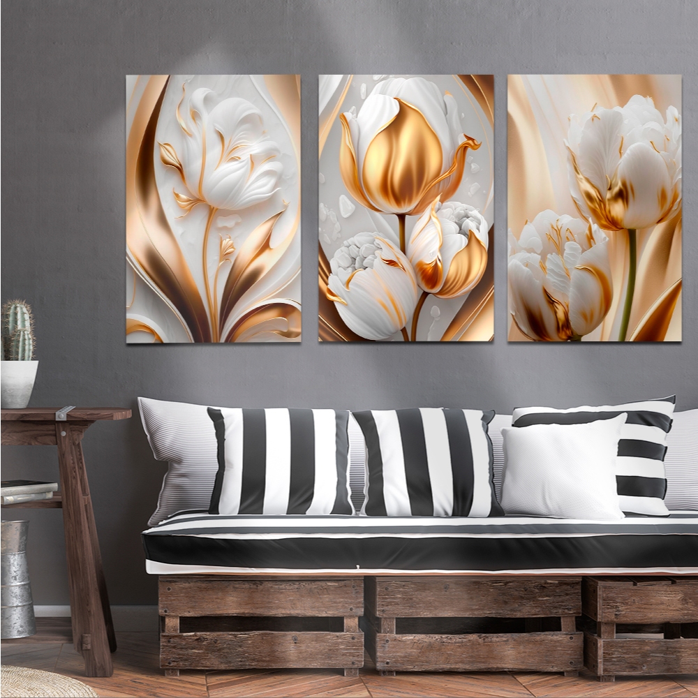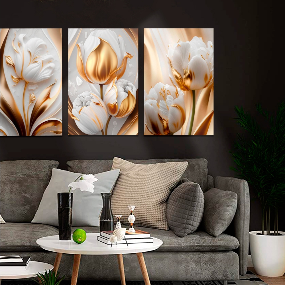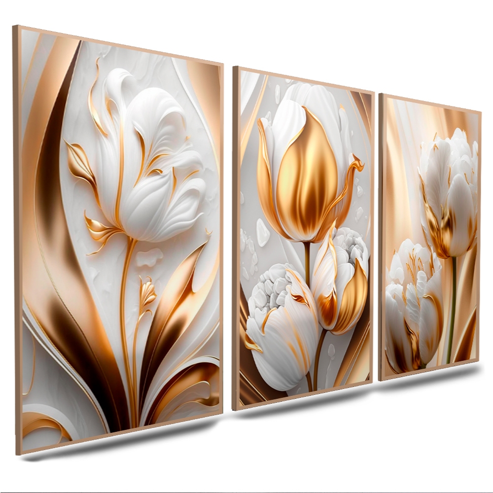 Kit Quadros Decorativos 3 Peças Flores Douradas Luxo Para Sala Quartos Tulipas Brilhantes Importada 120x60cm (010 bd)