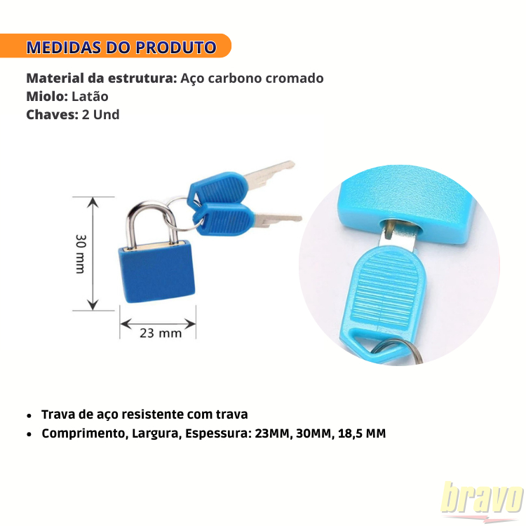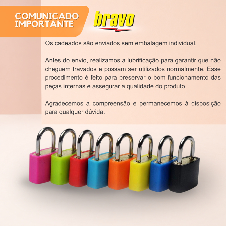 Cadeado Bravo Colorido com Chave | Trava Segura e Estilosa | Mochila, Armário, Malas