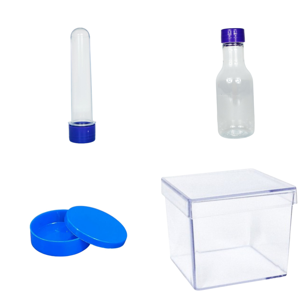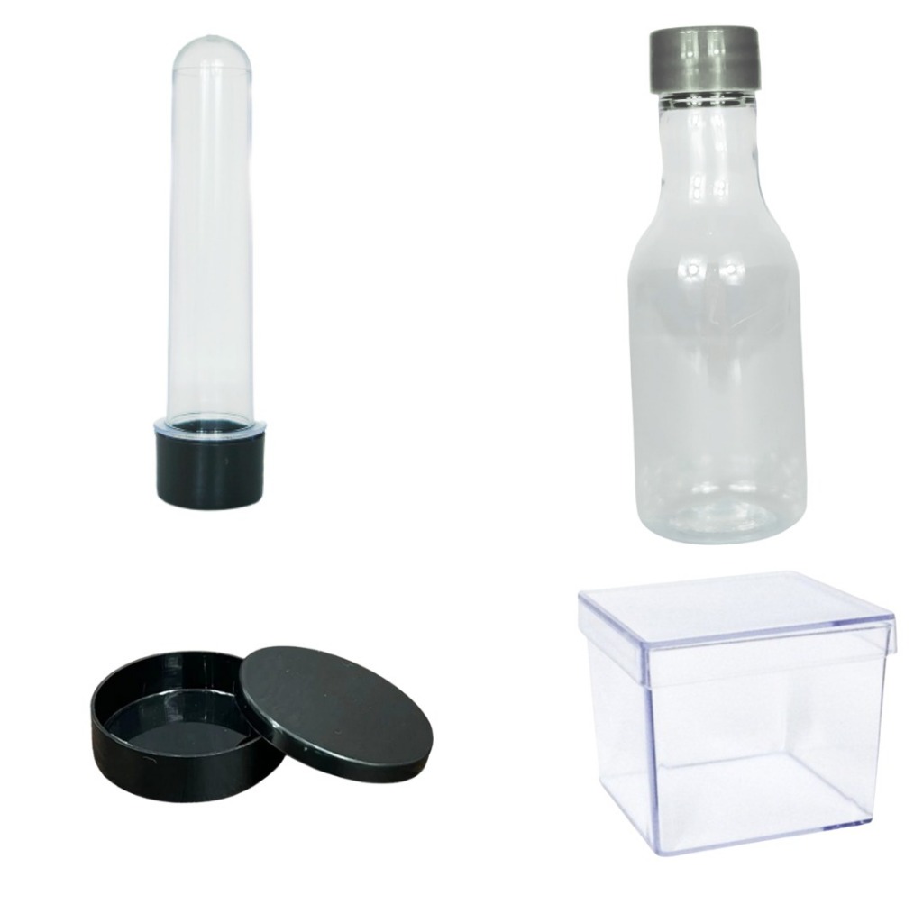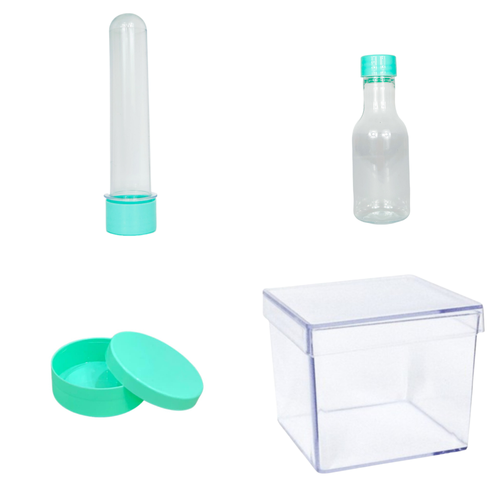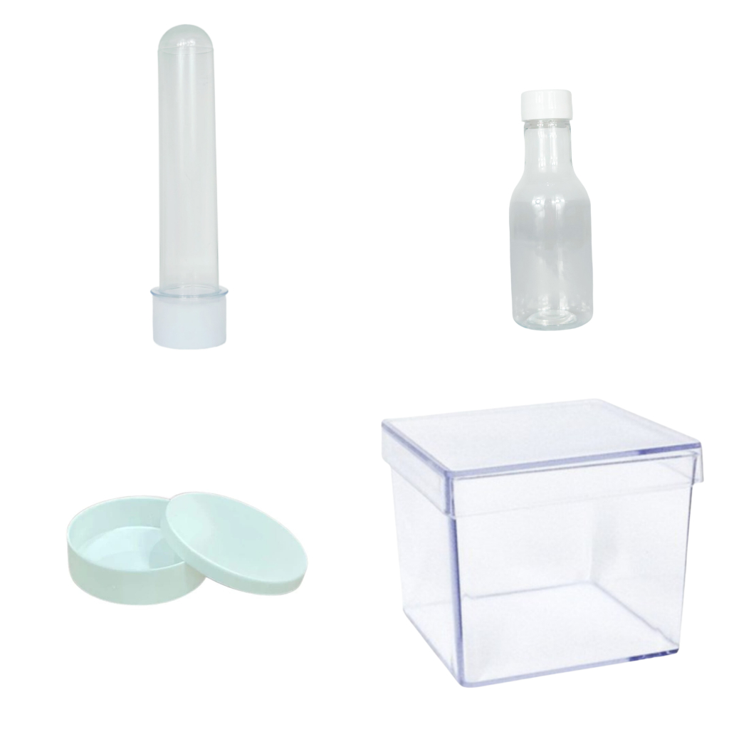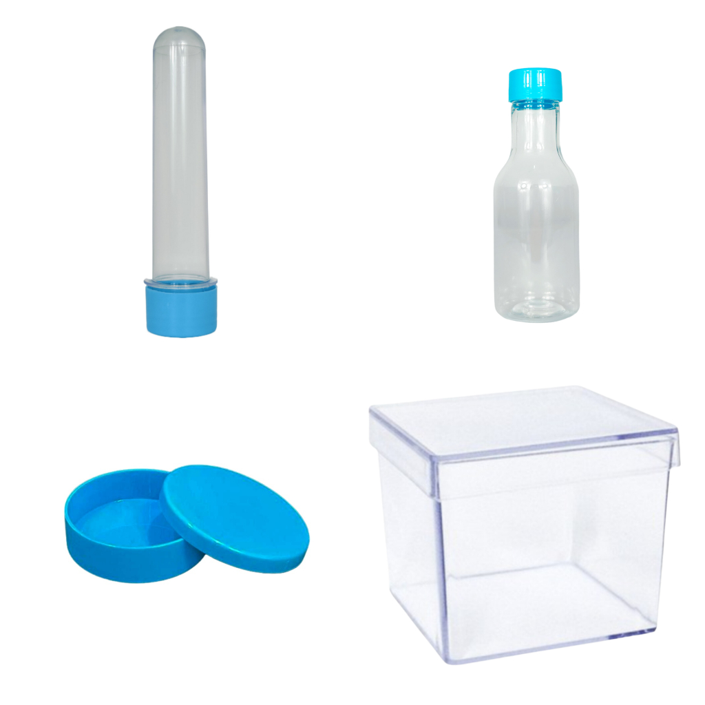 Kit Festas 10 Caixas acrilicas 5x5 10 Tubetes 13 cm 10 Latinhas 5x1 -e 10 Garrafinhas- lembrancinhas