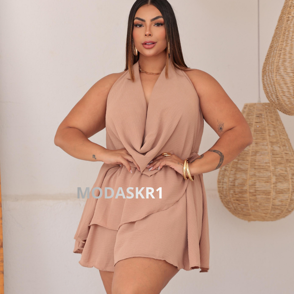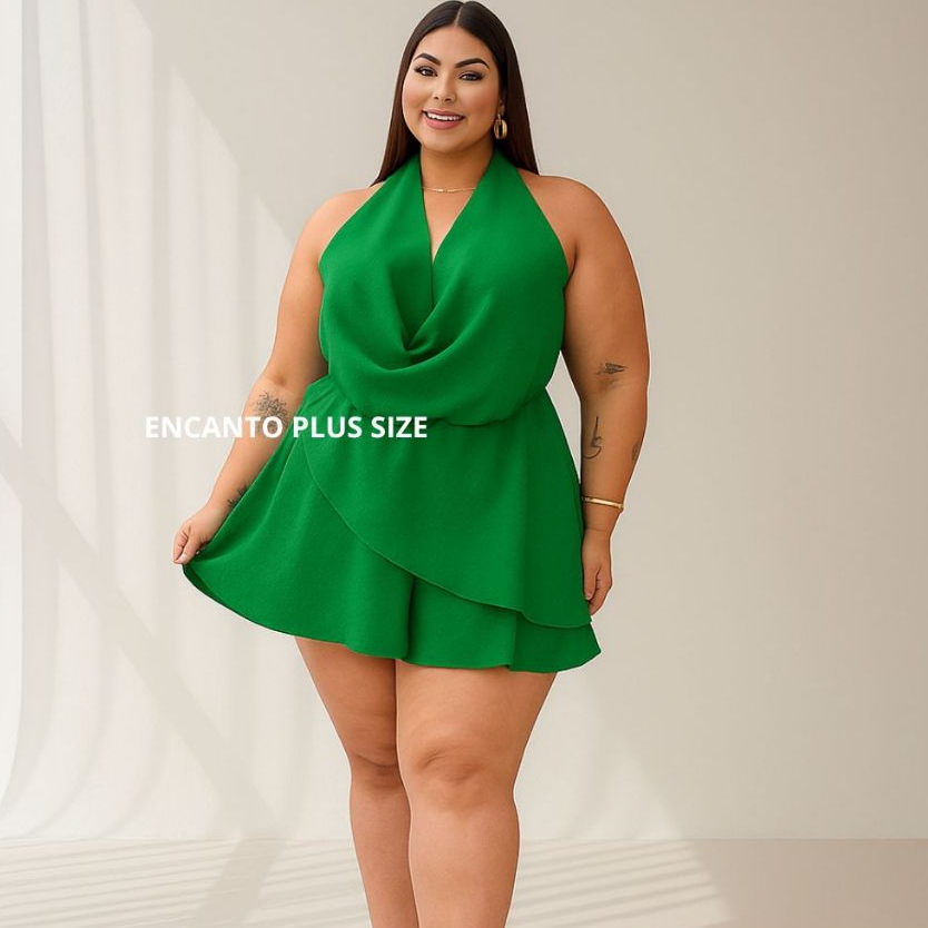 Macaquinho Feminino Duna Plus Size Frente Única Chic Gola Boba Ajustável Tendençia Estiloso Decotado Moderno veste 44-48