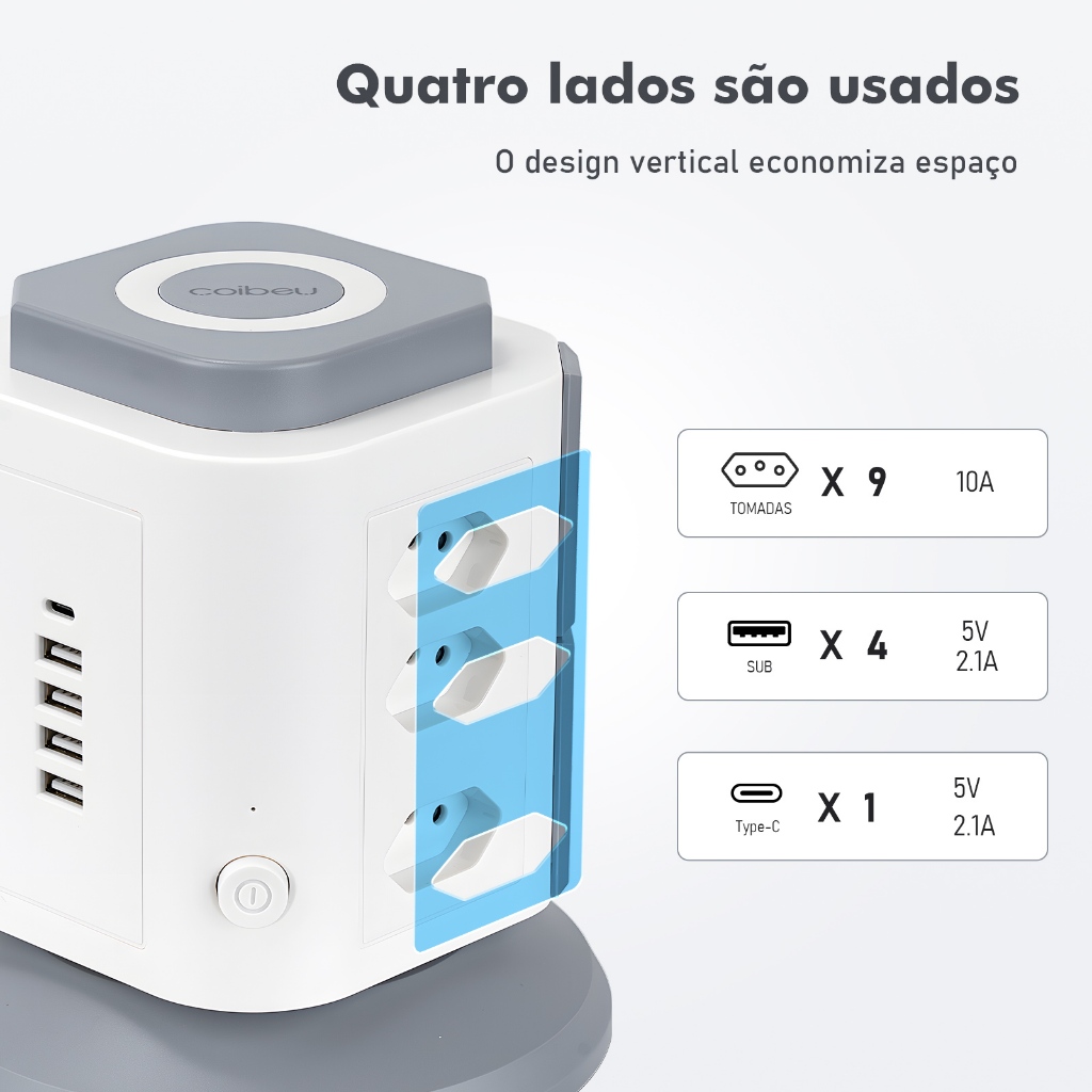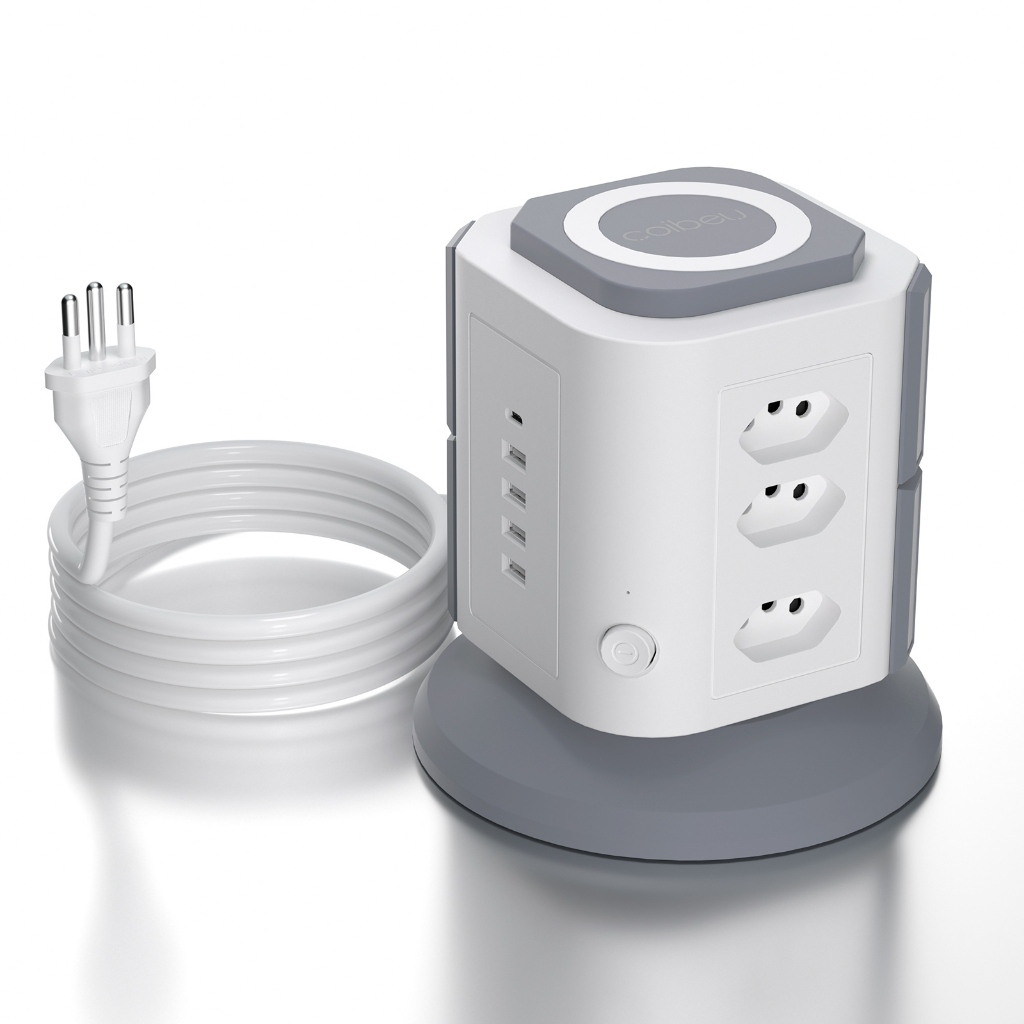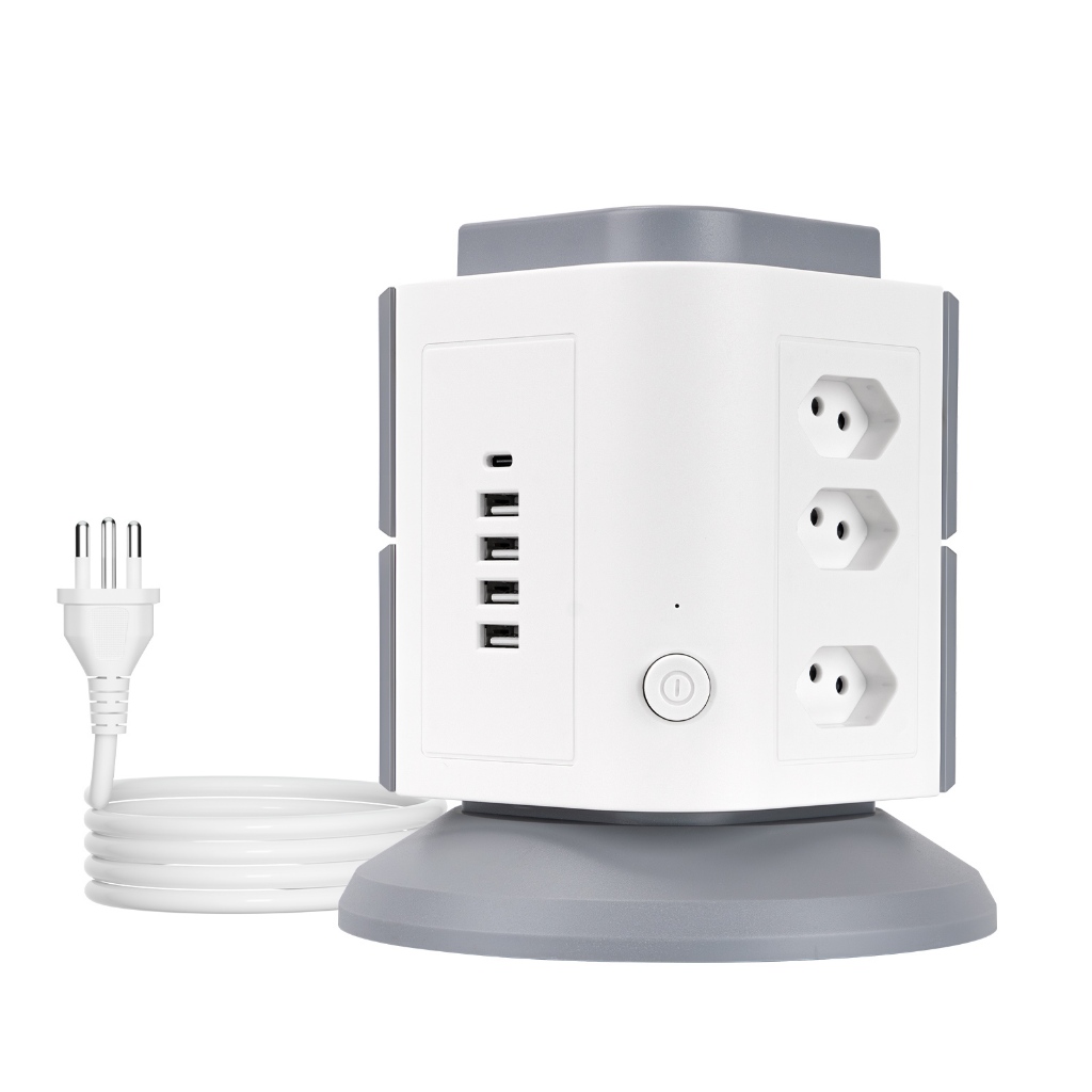 COIBEU Torre de Tomadas Branca 9+4+1 - 9 Tomadas + 4 USB + 1 Type-C Cabo 2m Proteção Contra Sobrecarga