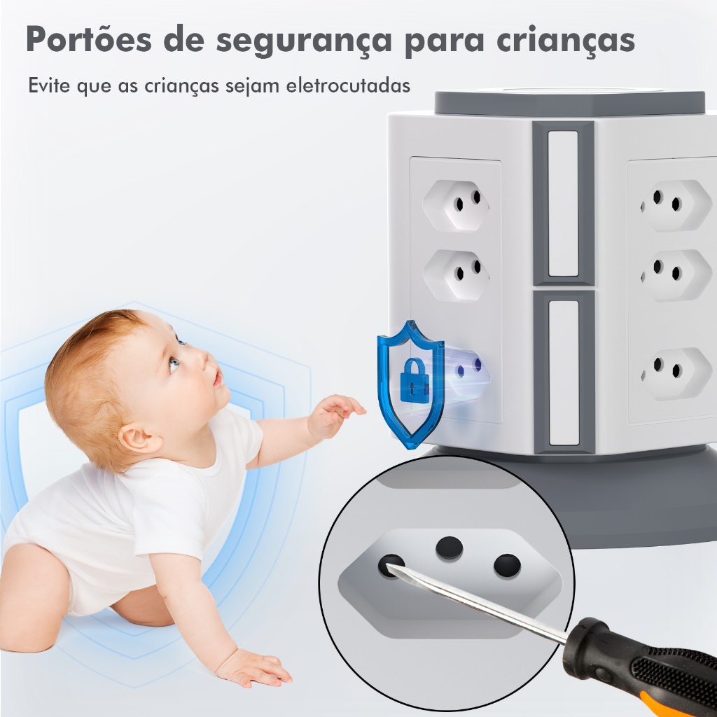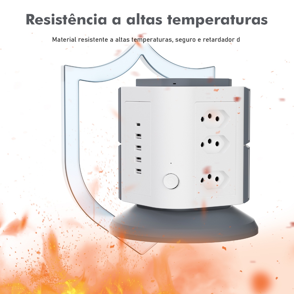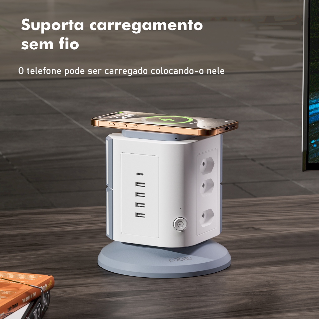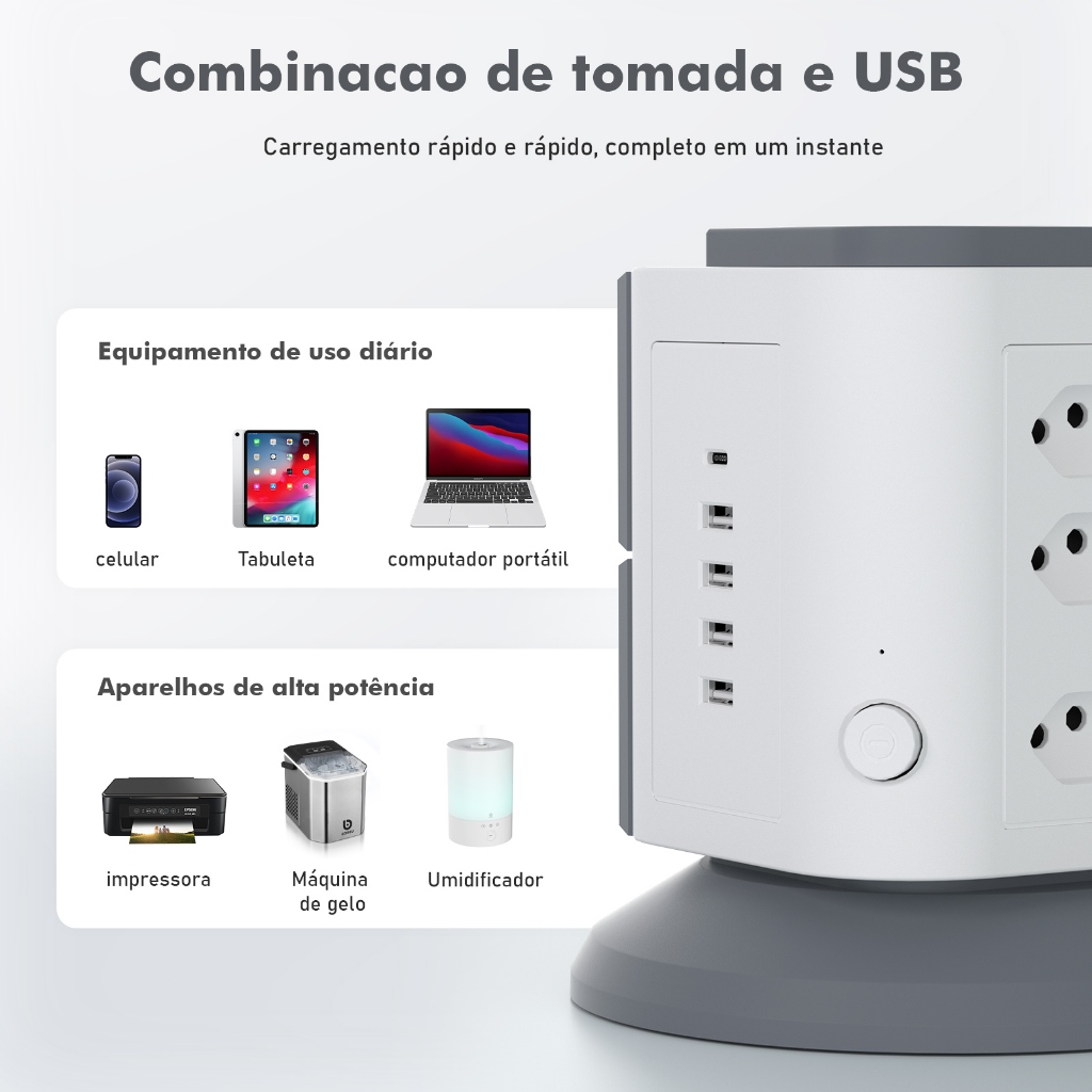 COIBEU Torre de Tomadas Branca 9+4+1 - 9 Tomadas + 4 USB + 1 Type-C Cabo 2m Proteção Contra Sobrecarga