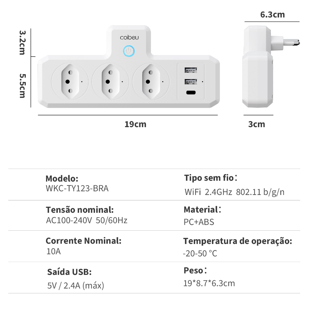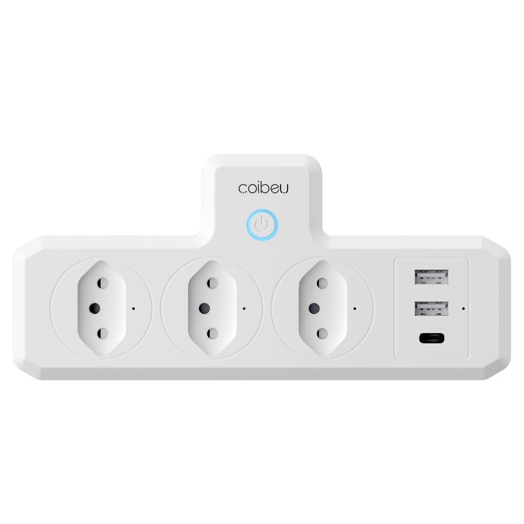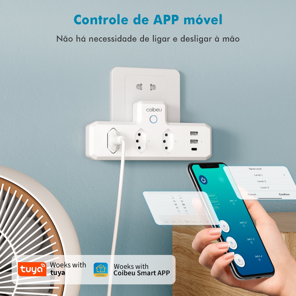 COIBEU Extensão Inteligente Tuya com USB Type-C Plug Universal Carregador Rápido e Controle por App
