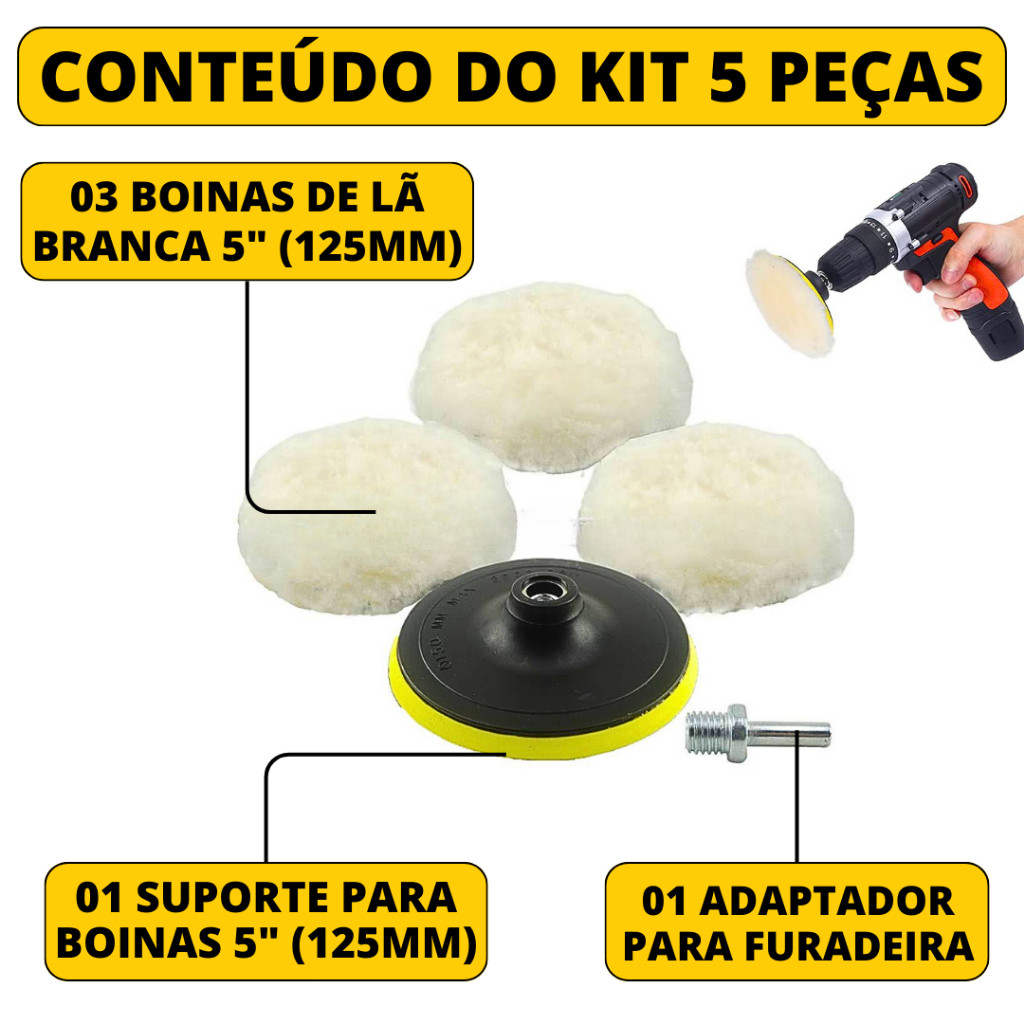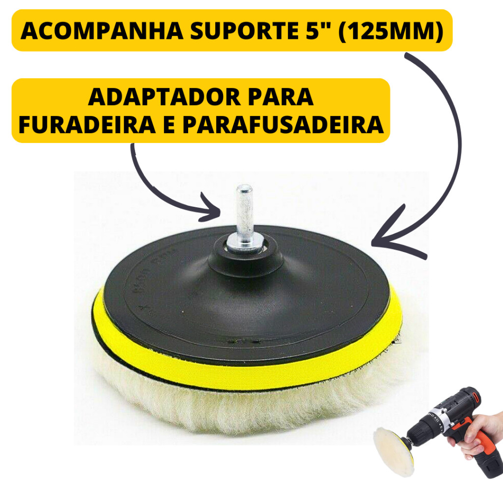 haosin Kit Boina de Lã Polimento Com Suporte Velcro Para Politriz Furadeira e Parafusadeira Automotivo 125mm 5 Polegadas