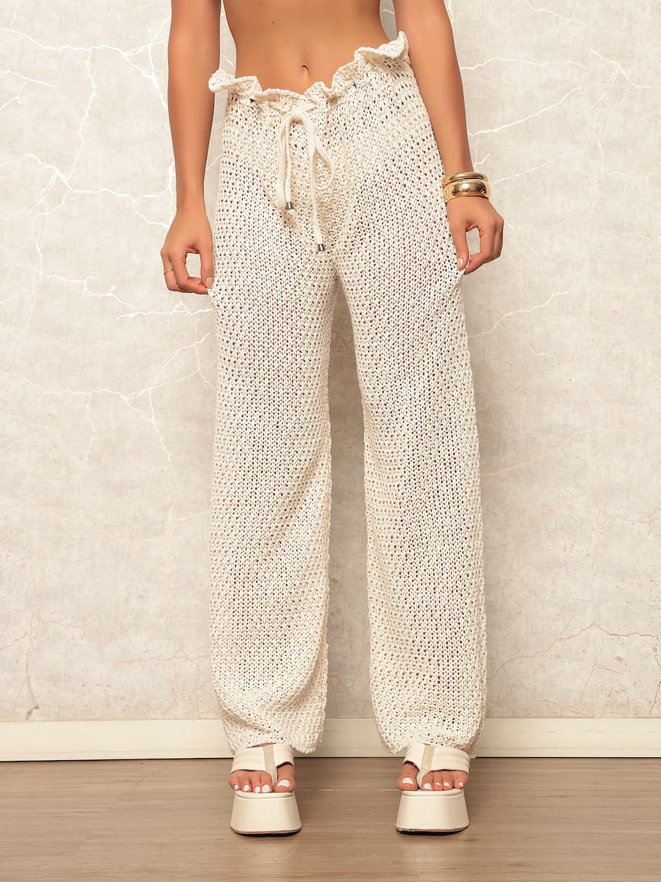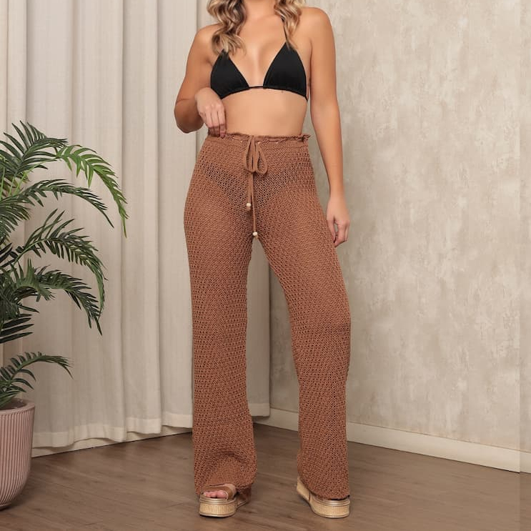 Calça Feminina Saída De Praia Lisa Tricot Crochê Tendência Moda Praia