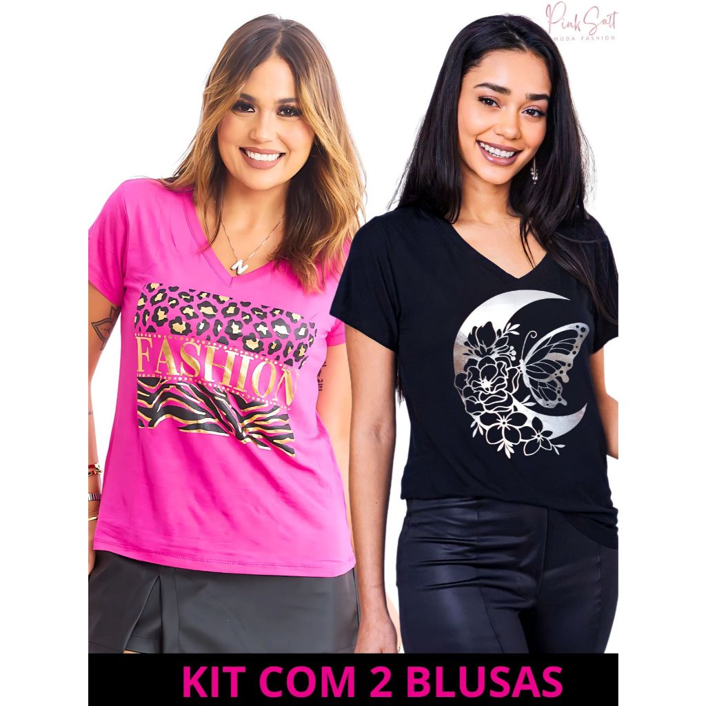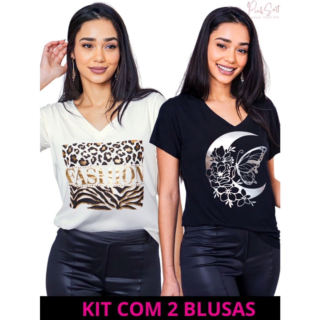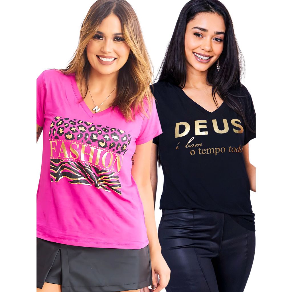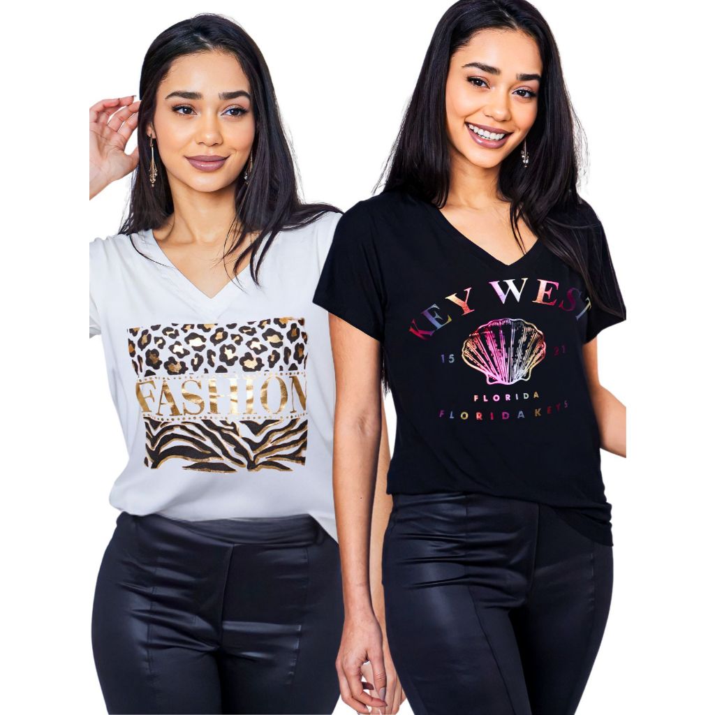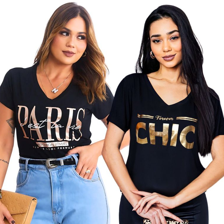 Kit 2 Blusa Feminina Estilosa Camiseta Tamanho M ao G2 Pluz Size Viscolycra Premium T-Shirt Estampa Exclusiva