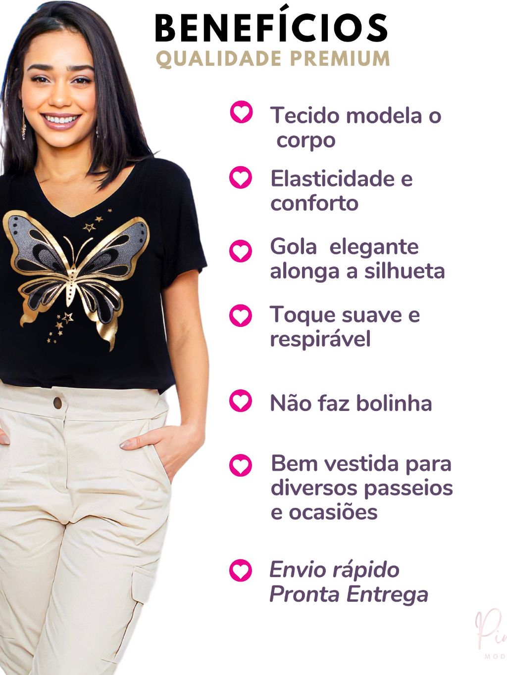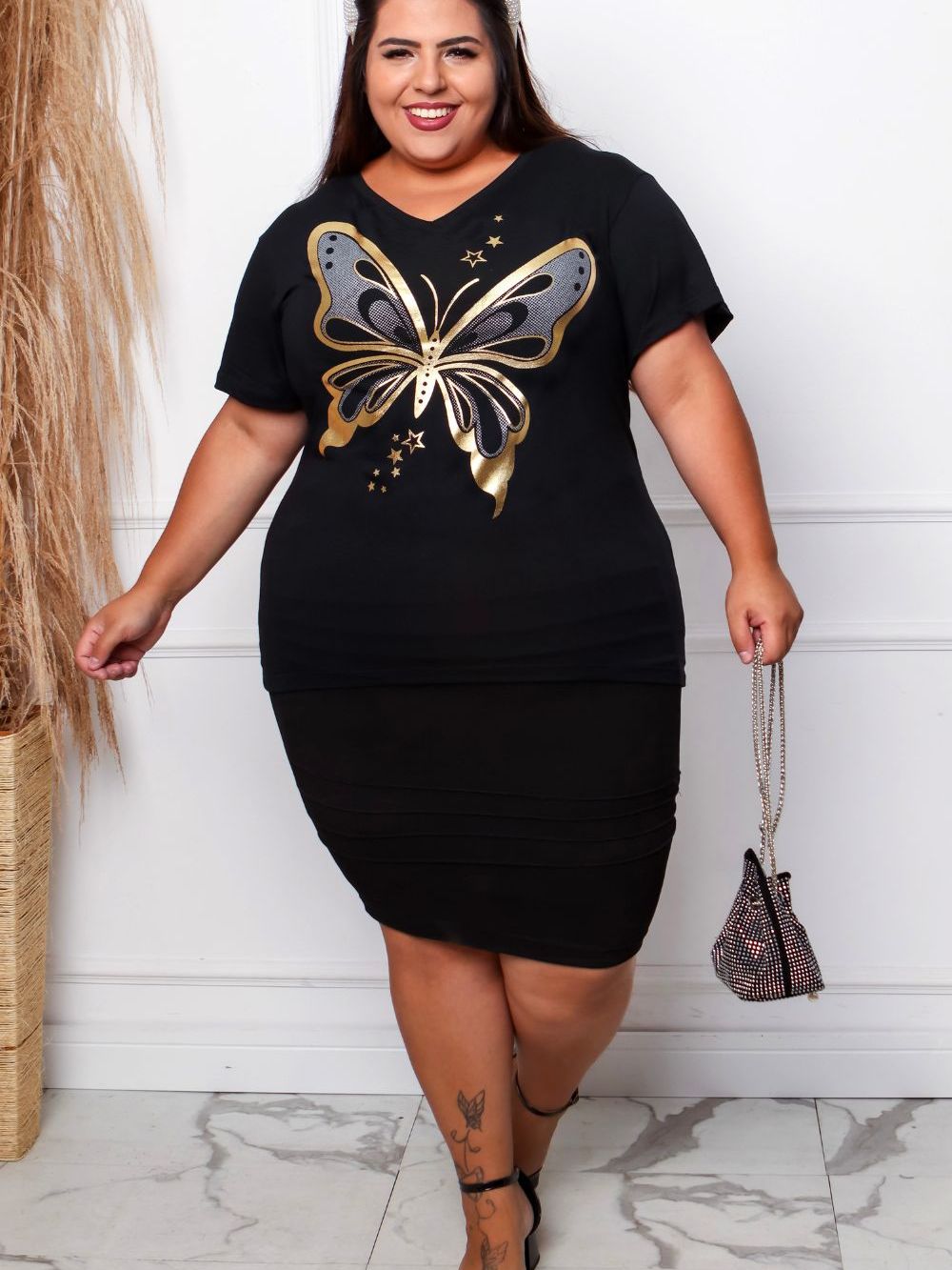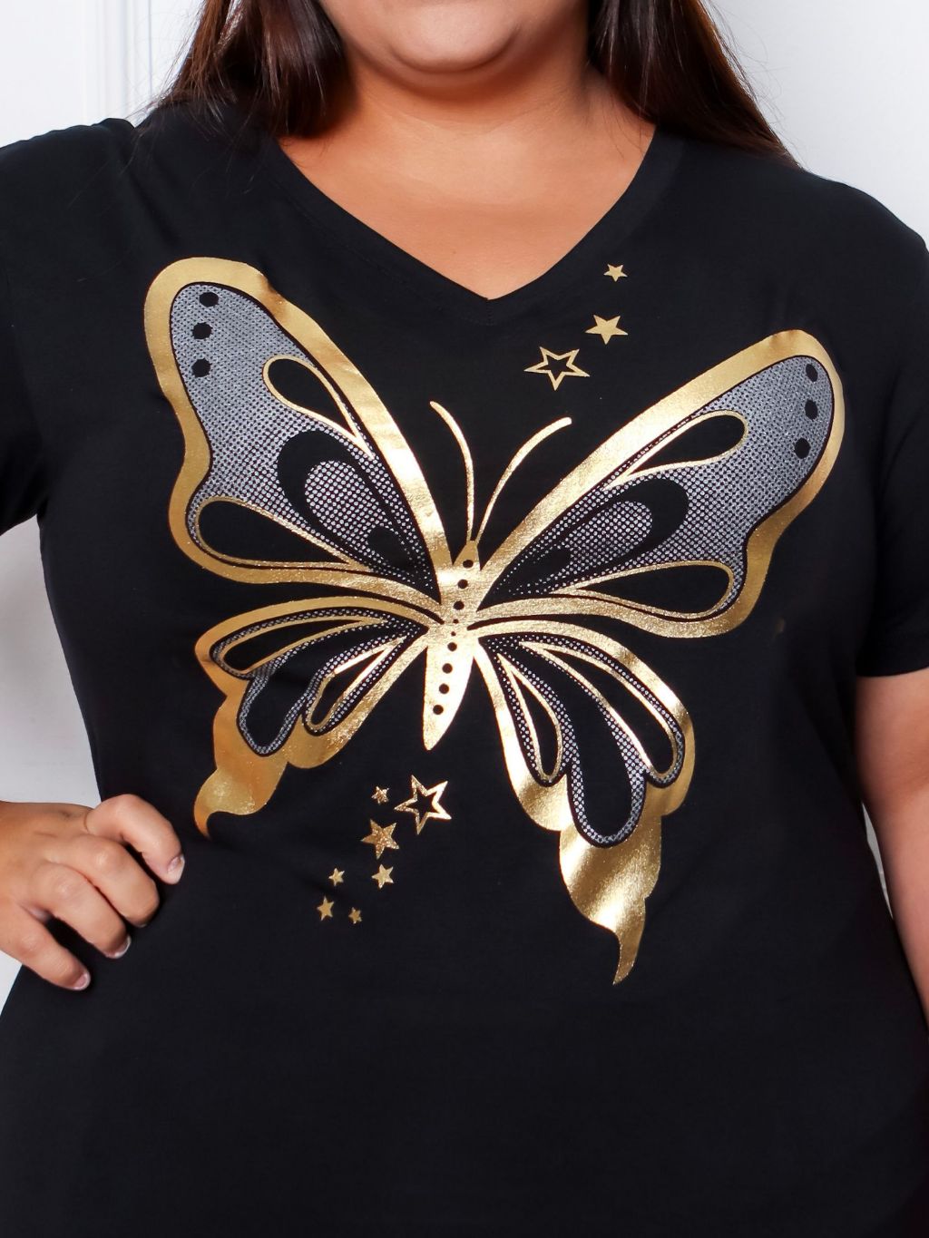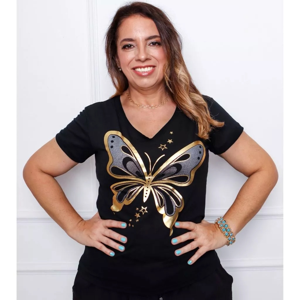 Blusa Feminina Estilosa Pluz size Estampa Borboleta Dourado Fashion Tecido Vicolycra Confortável