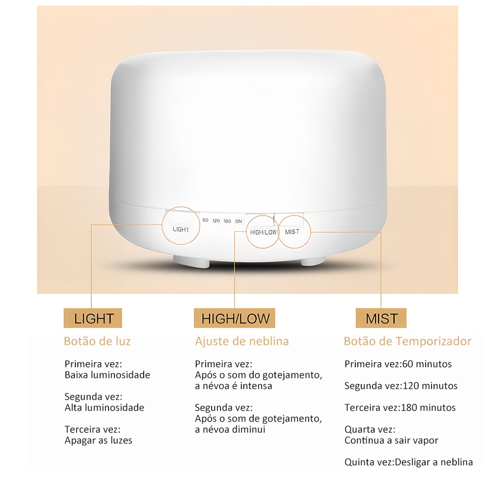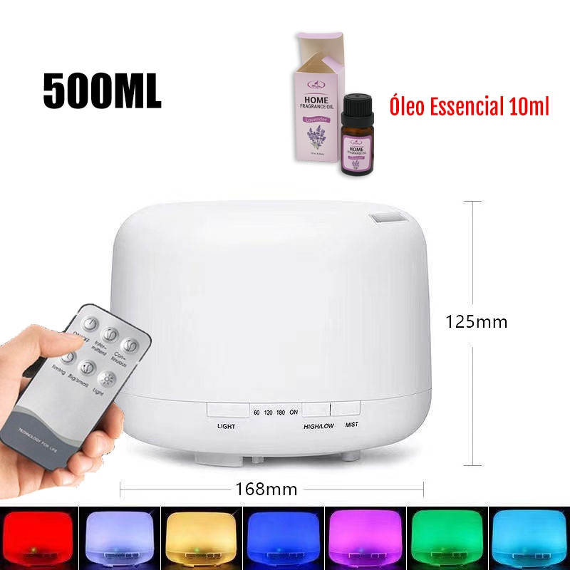 Umidificador Difusor Aromatizador 500ml Ultrassônico Estilo Branco com Led 7 cores com controle