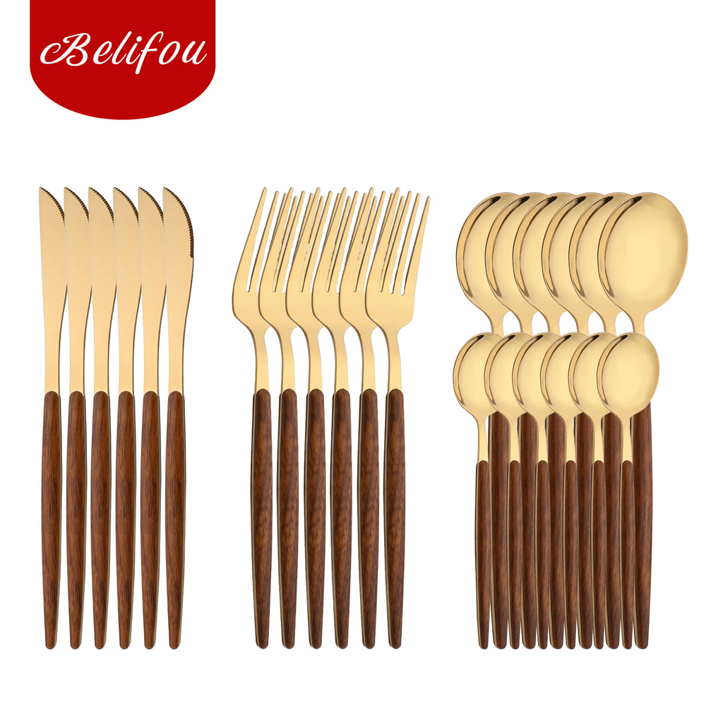 Belifou Kit 24 Jogo De Talheres Aço Inoxidável 416 Ouro Alças De Madeira - Diana