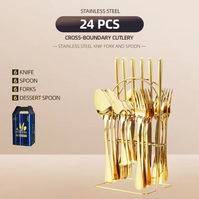 Belifou Kit 24 Conjunto De Talheres De 24 Peças Conjunto De Faca E Garfo Dourado Com Suporte