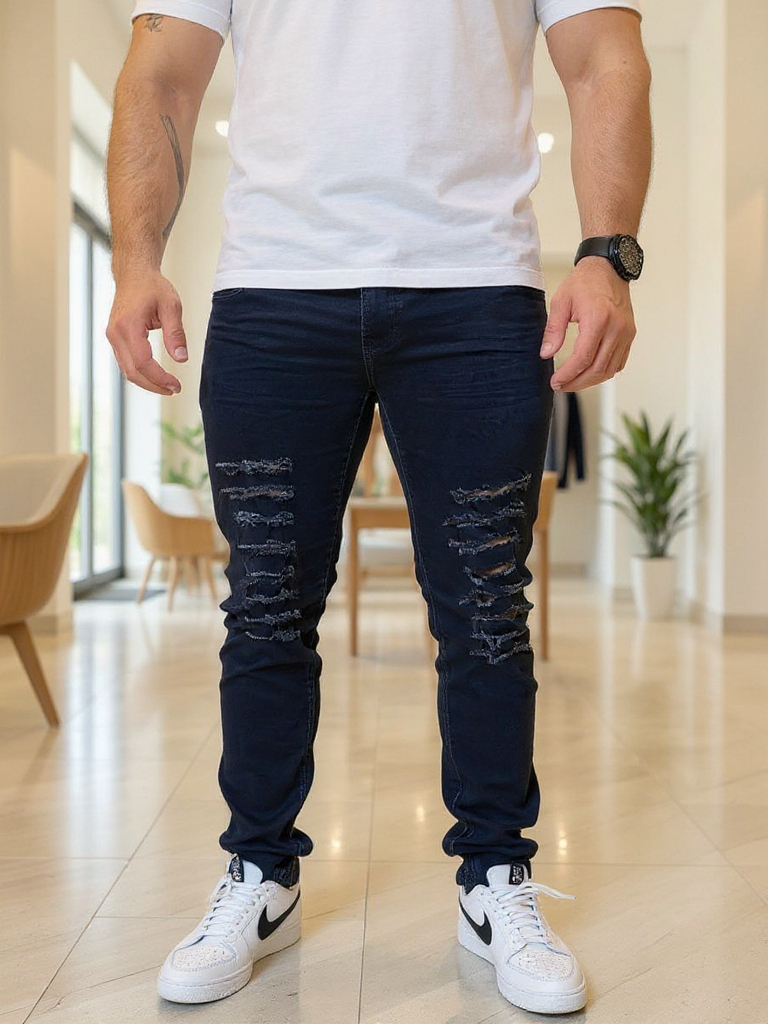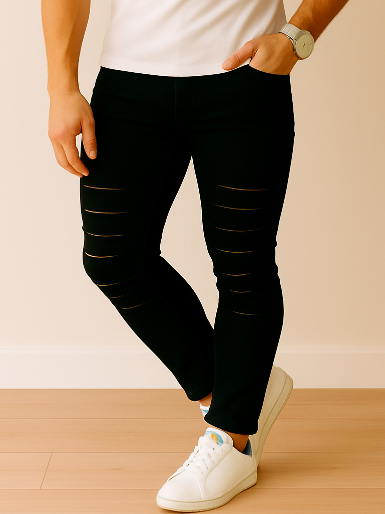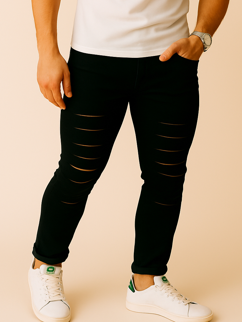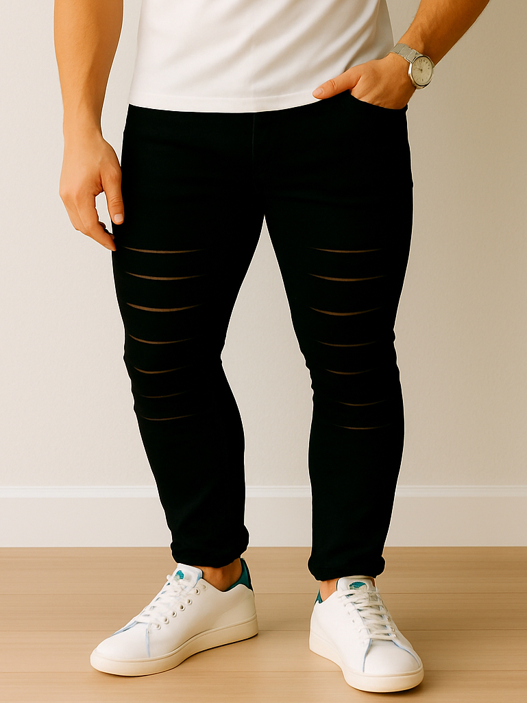Calca Jeans Destroyed Rasgada Slim Preta Barra Feita com Lycra Elastano Calças Estilosas Moda 2025 Dias dos Pais