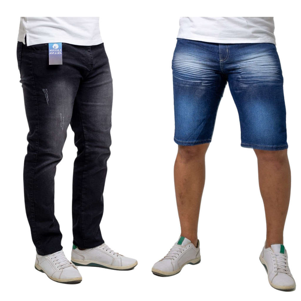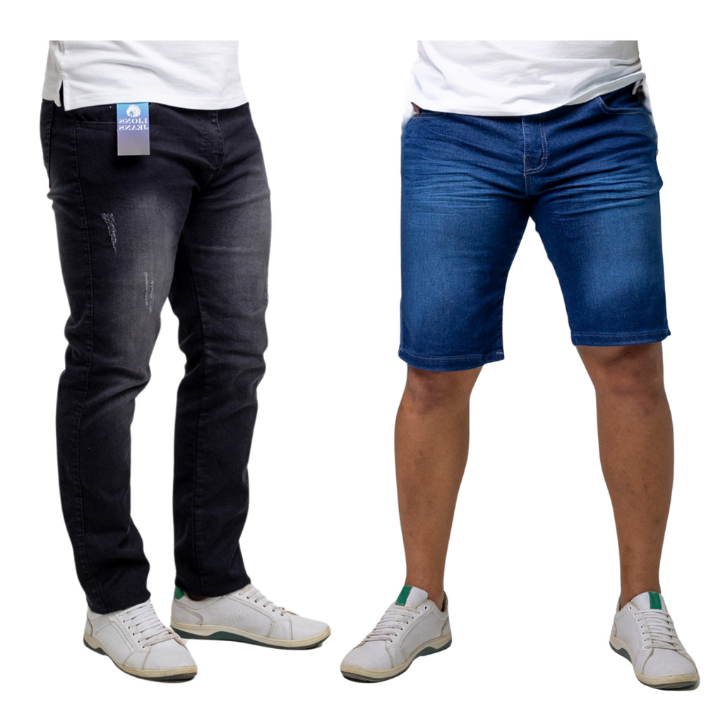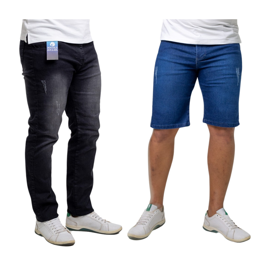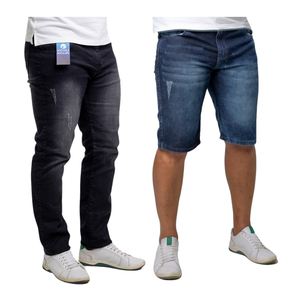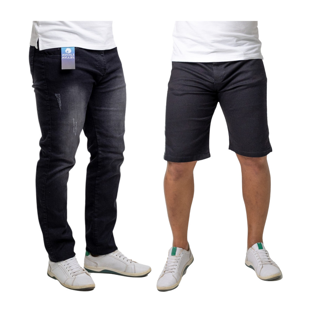 KIT Calça Preta Com Puído Padrão Slim +Bermuda Lycra | Escolha A Variação - Outlet Jeans Dias dos Pais