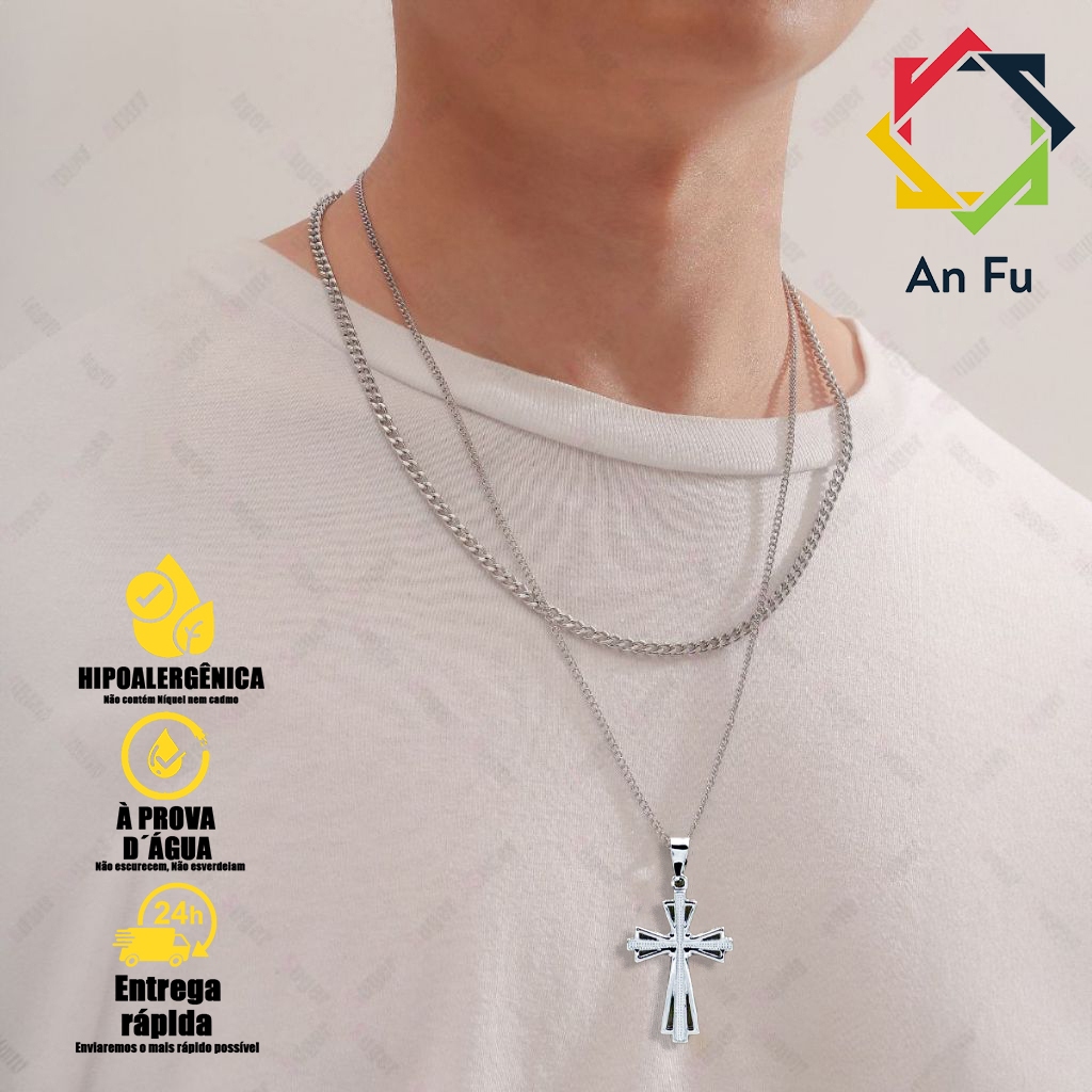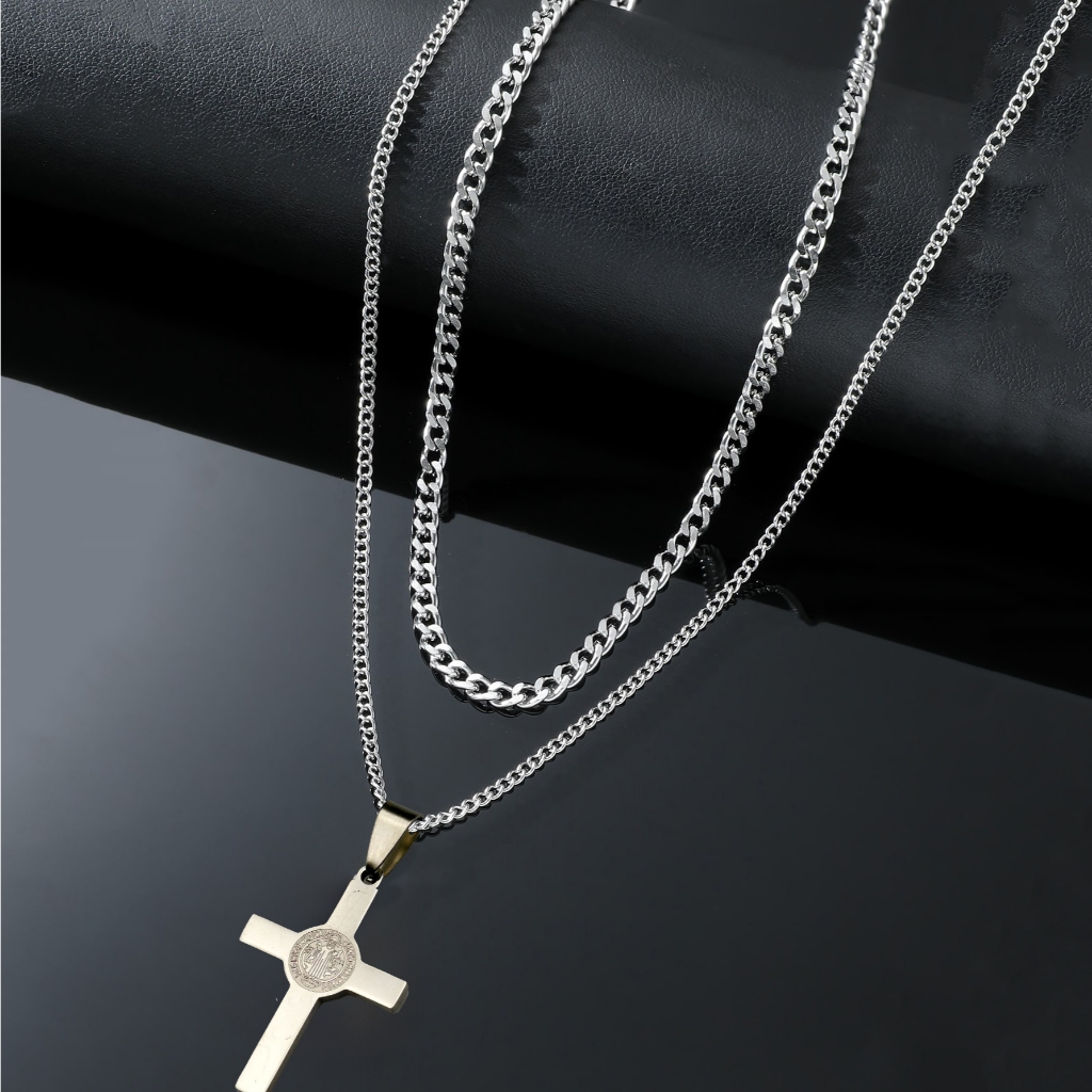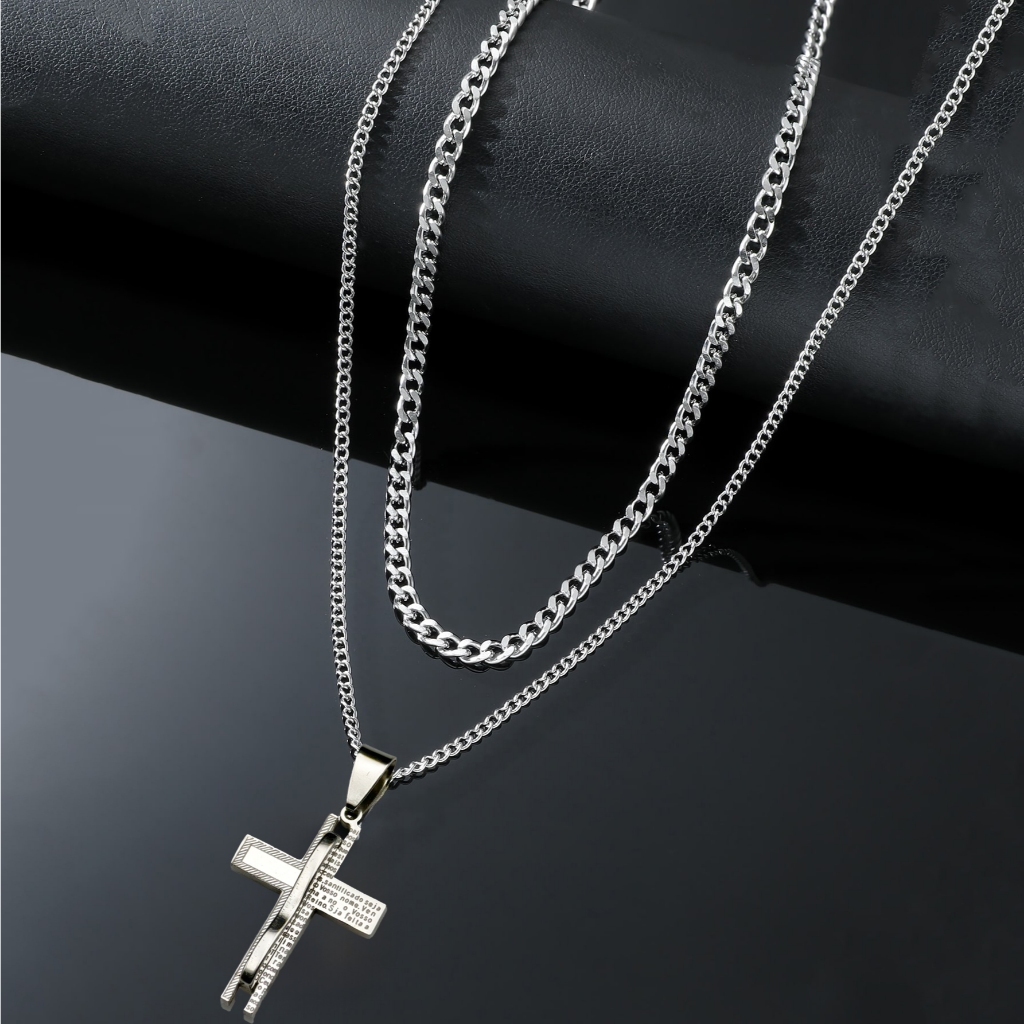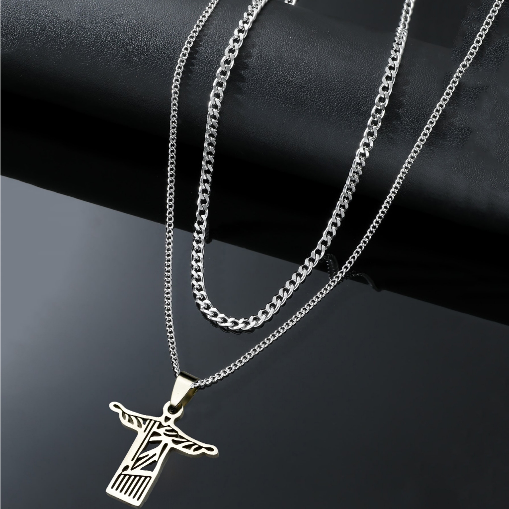 Kit com 2 Correntes Masculinas com Pingente Cruz Palito - Colares Banhados a Prata em Aço Inoxidável