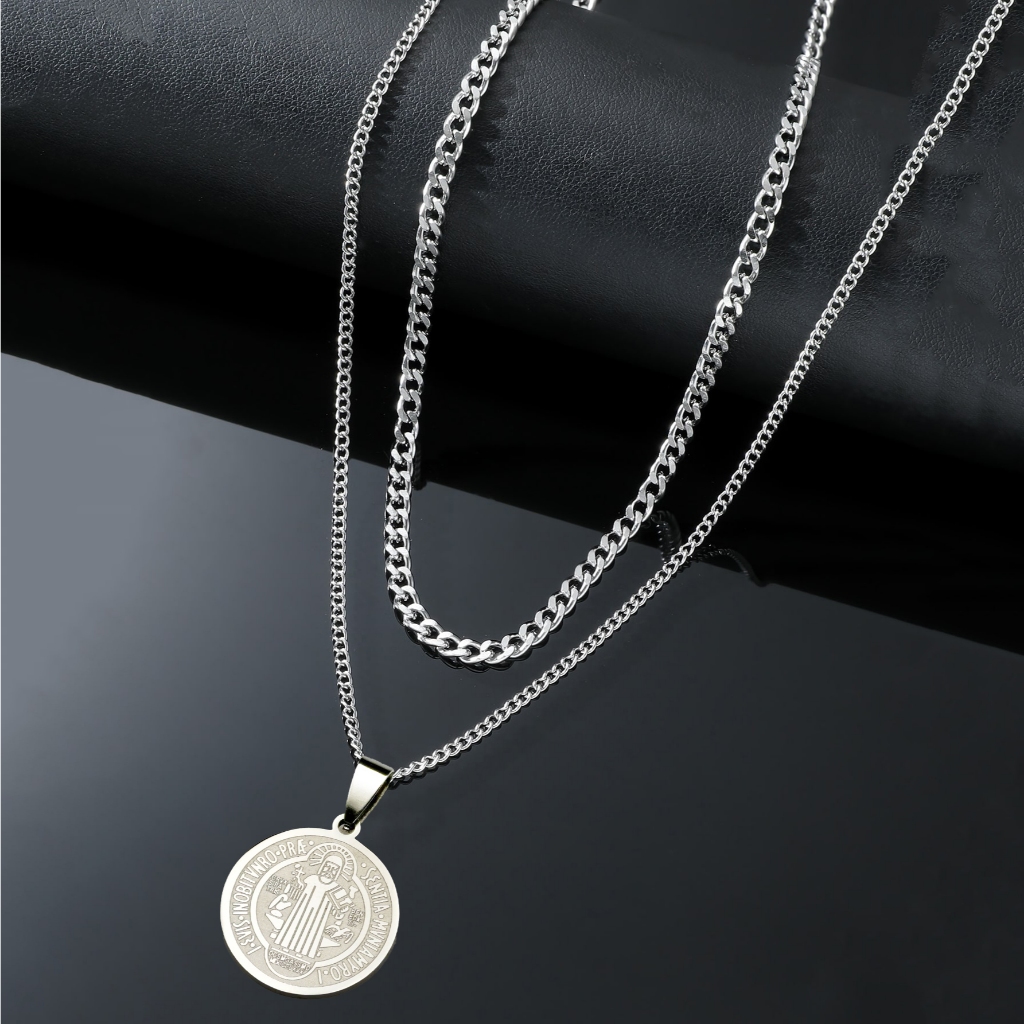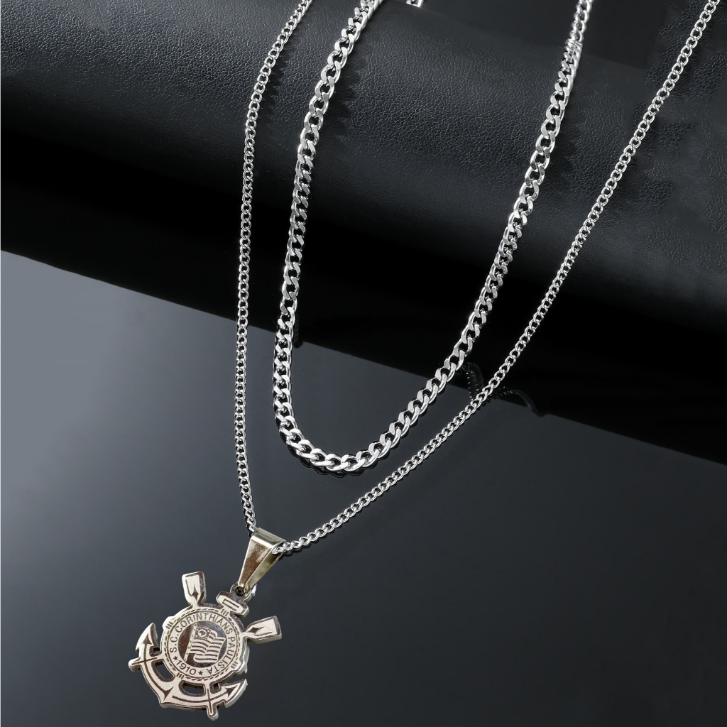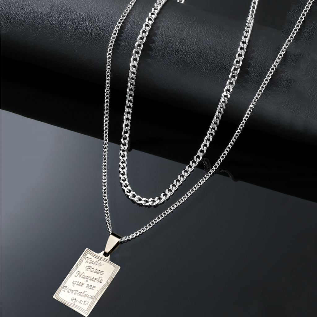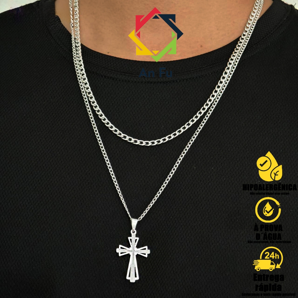Kit com 2 Correntes Masculinas com Pingente Cruz Palito - Colares Banhados a Prata em Aço Inoxidável