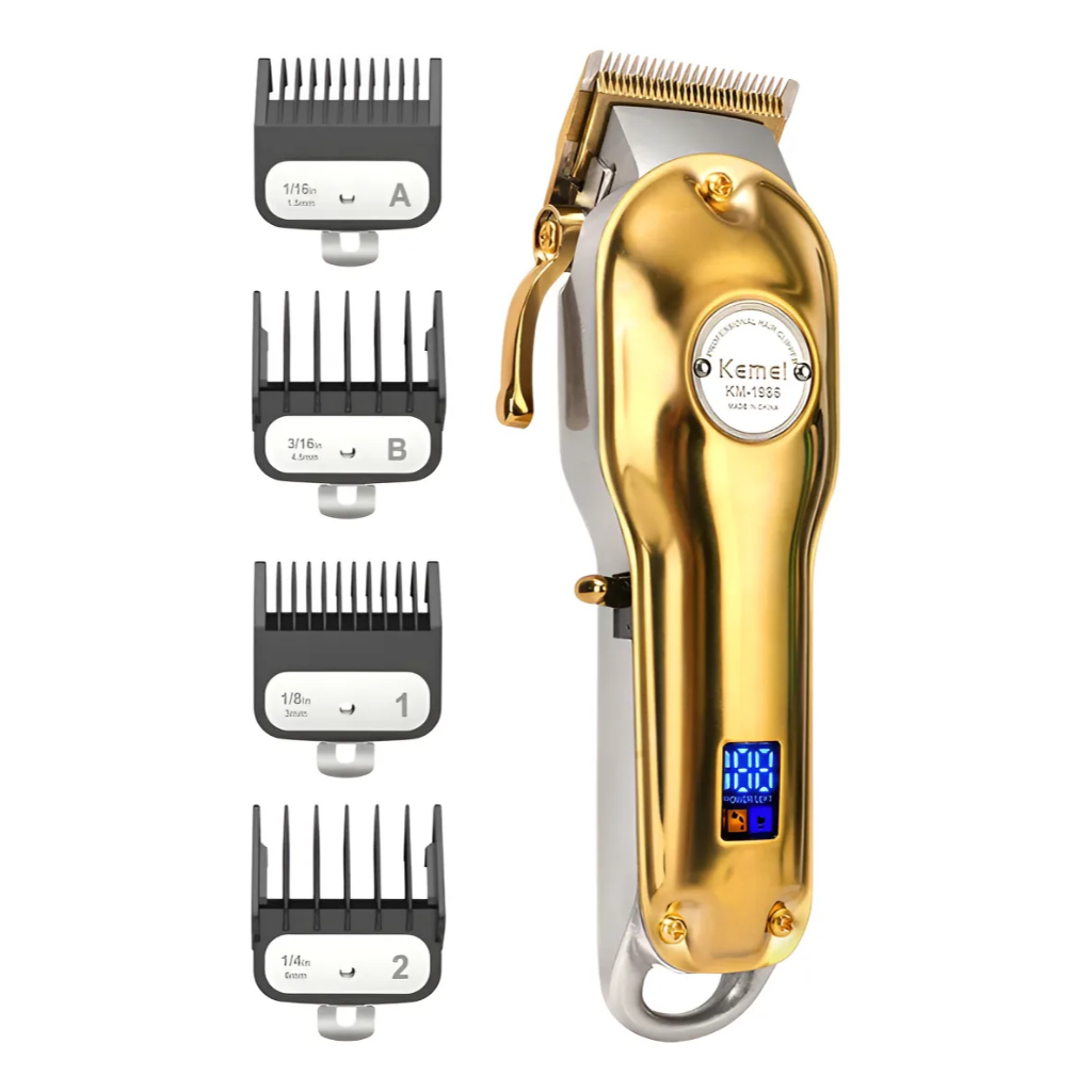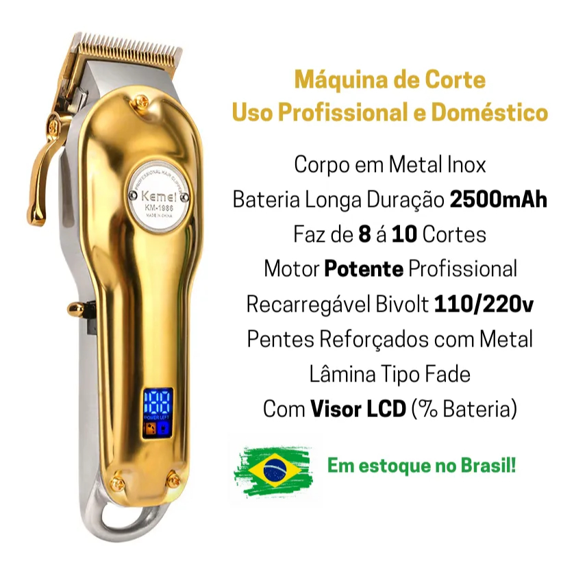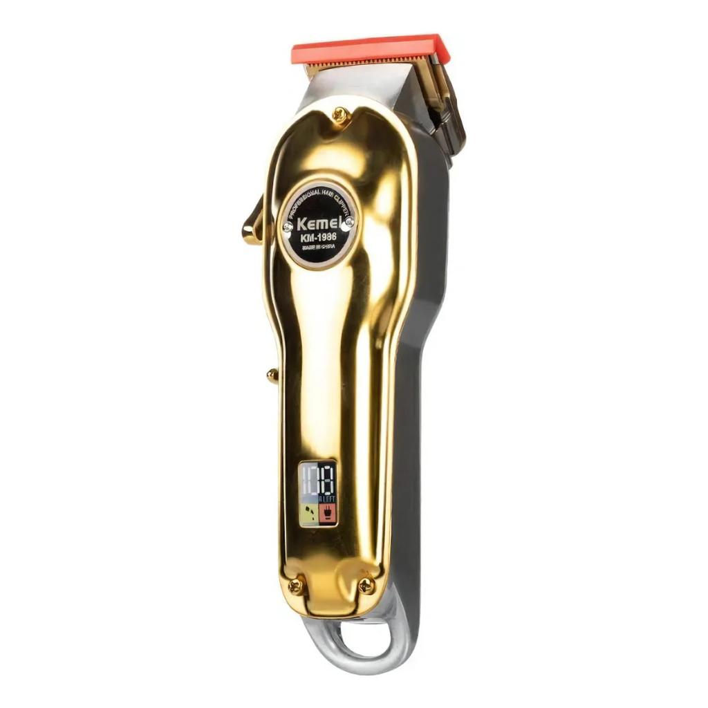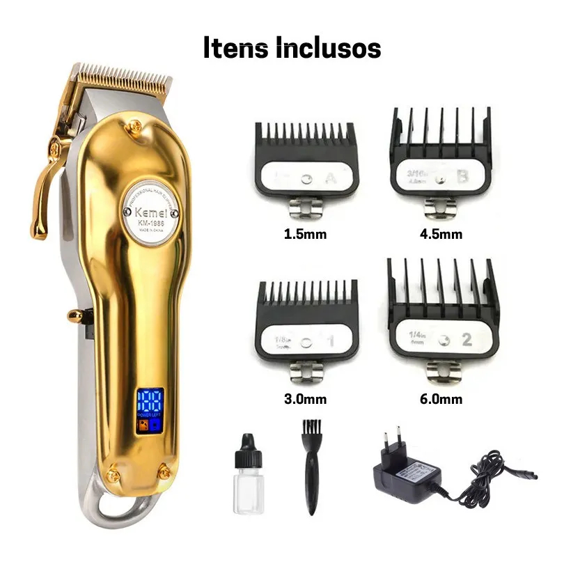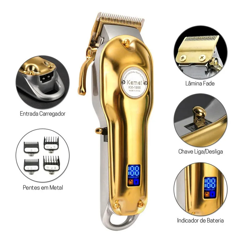 Máquina Cortar Cabelo Profissional Kemei Km-1986 Em Metal Dourado Com Visor Lcd