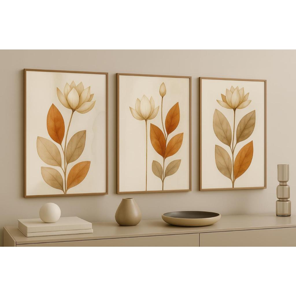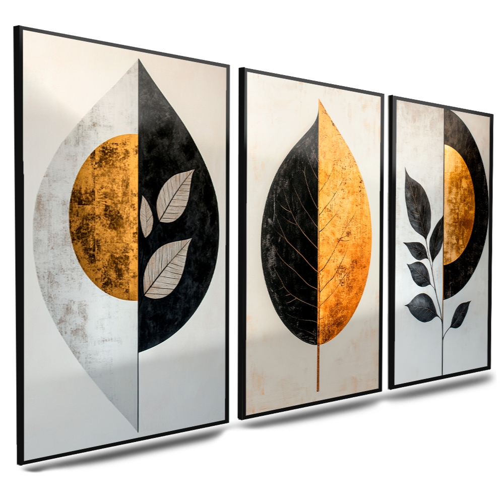 Quadros Decorativos 3 Peças Mosaico Trio Folhagem Folhas Neutro Moderno