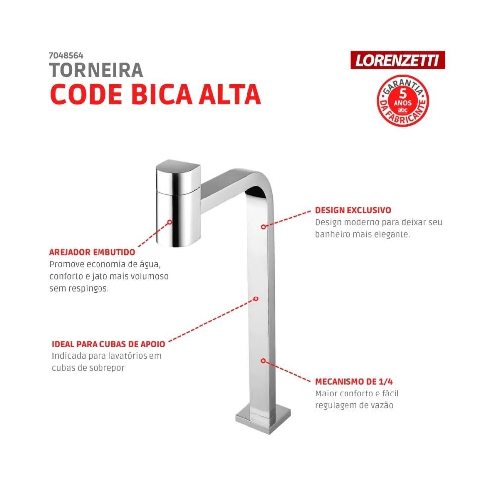 Torneira Para Lavatório De Mesa Code Bica Alta C55 Cromada Lorenzetti
