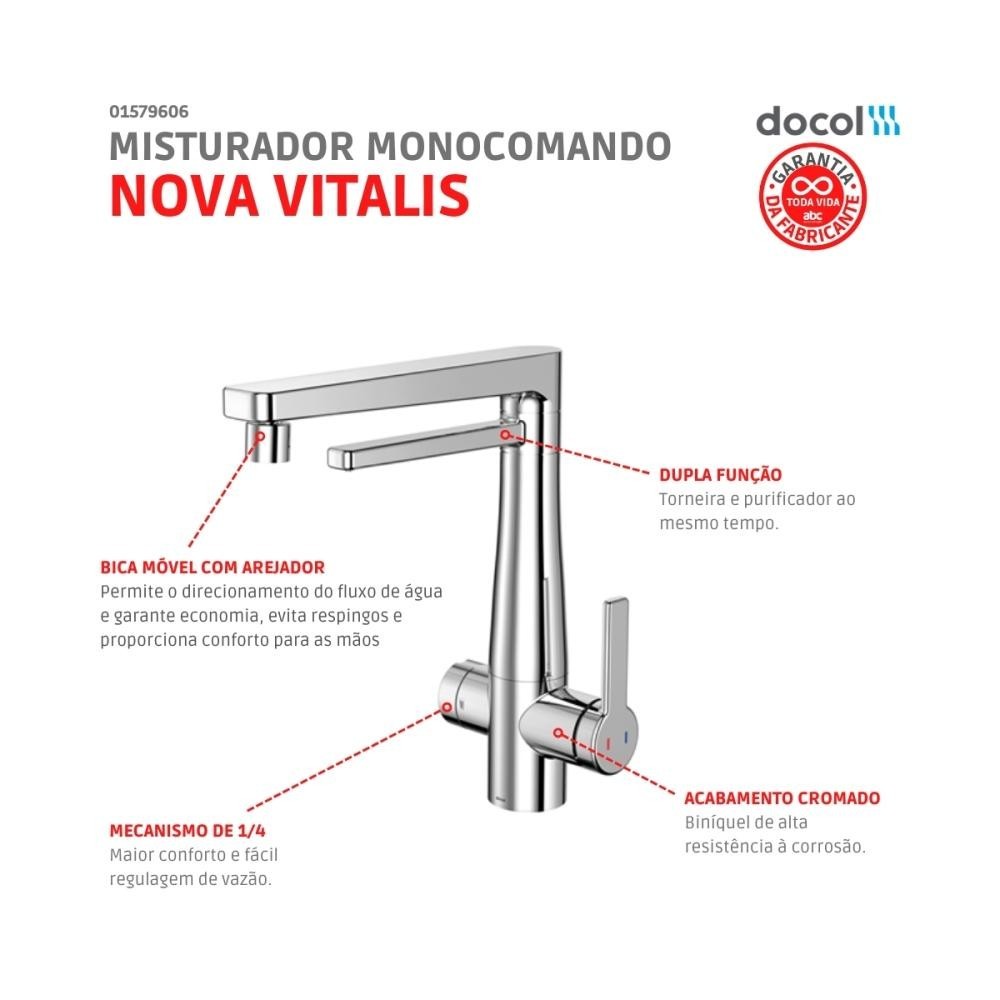 Misturador Monocomando de Mesa Para Cozinha Com Filtro Purificador de Água Nova Vitalis Cromado Docol