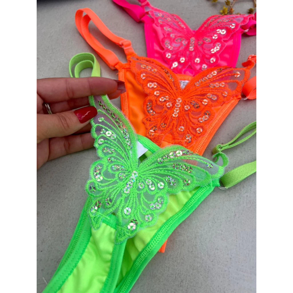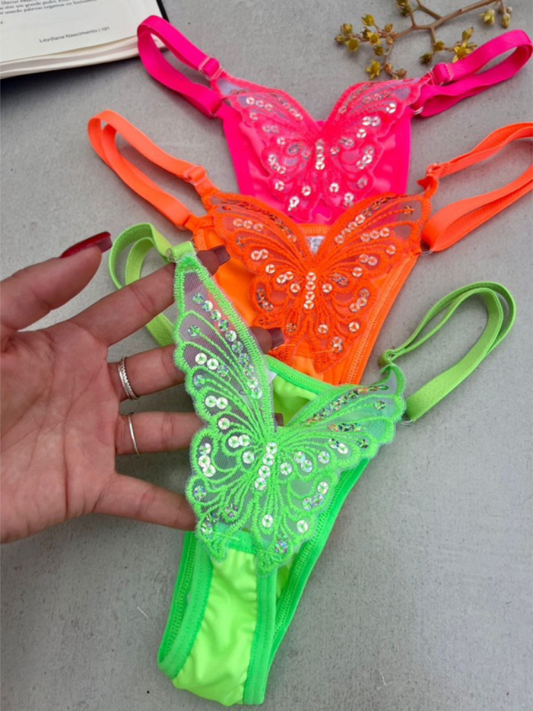 Calcinha Borboleta Neon | KIT 3 | Fio Dental Sexy Lingerie Tanga Feminina Sensual com Regulagem
