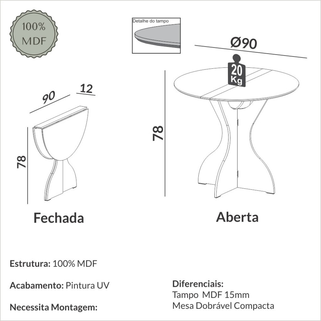 Mesa de Jantar Redonda Dobrável 4 Lugares Off White/Freijó - Dalla Costa