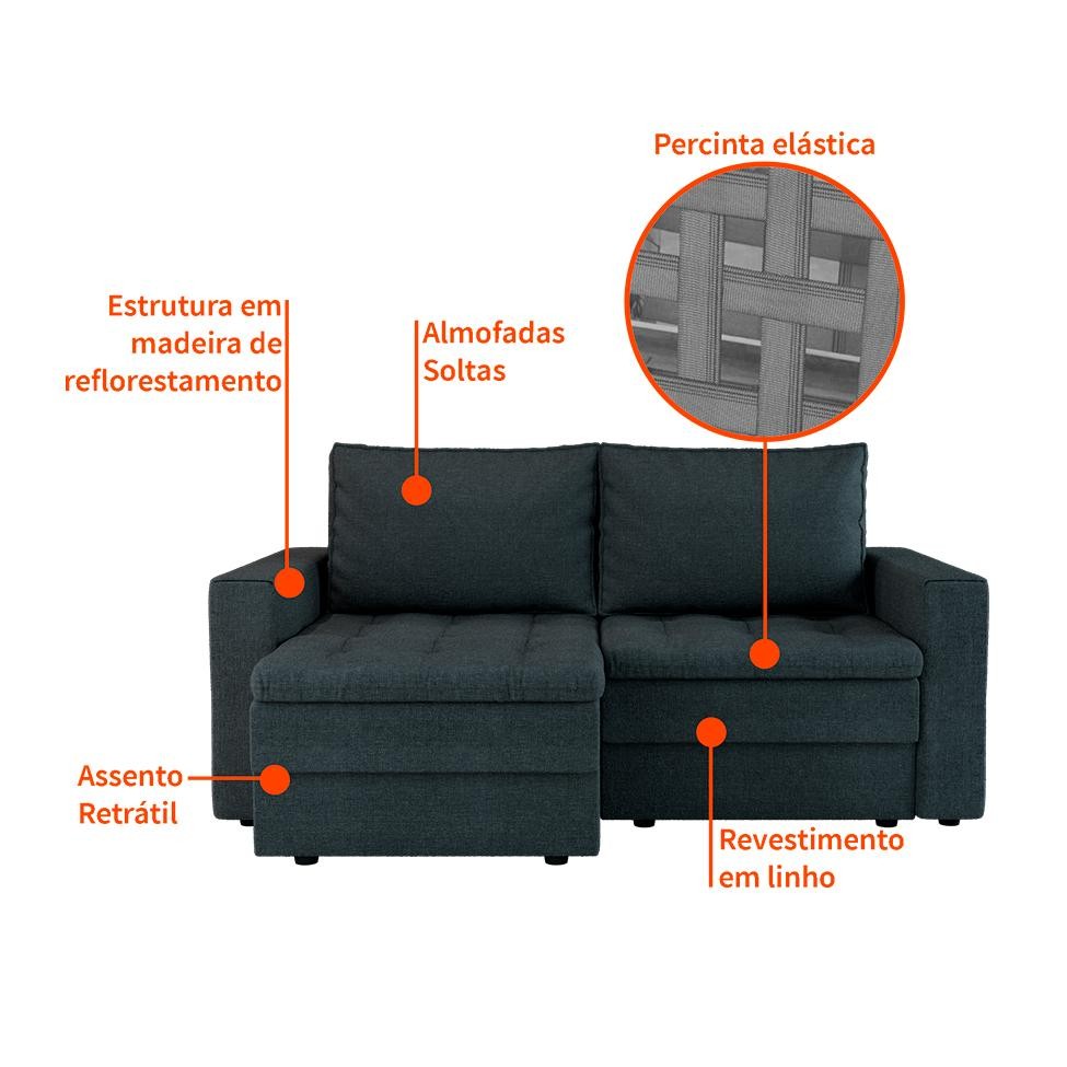 Sofá 3 Lugares Retrátil Berna Linho Grafite 180 cm