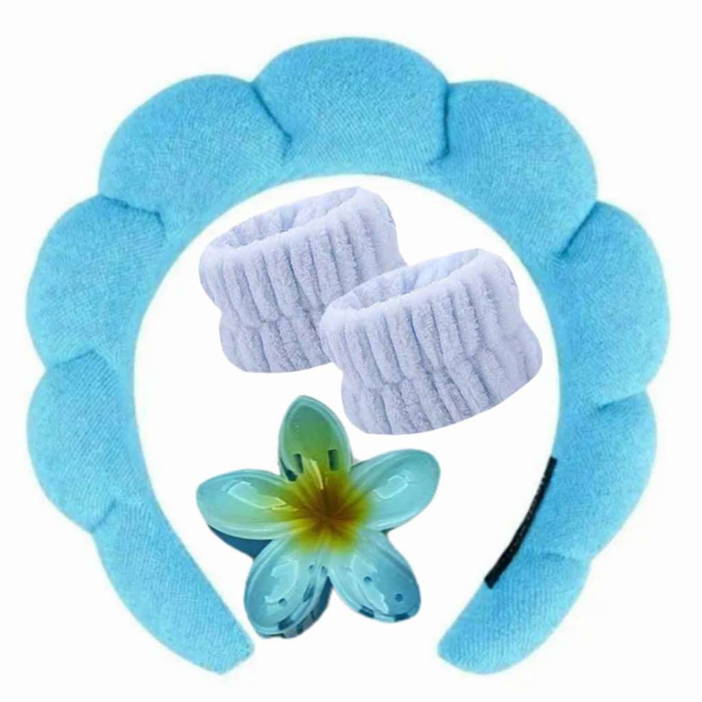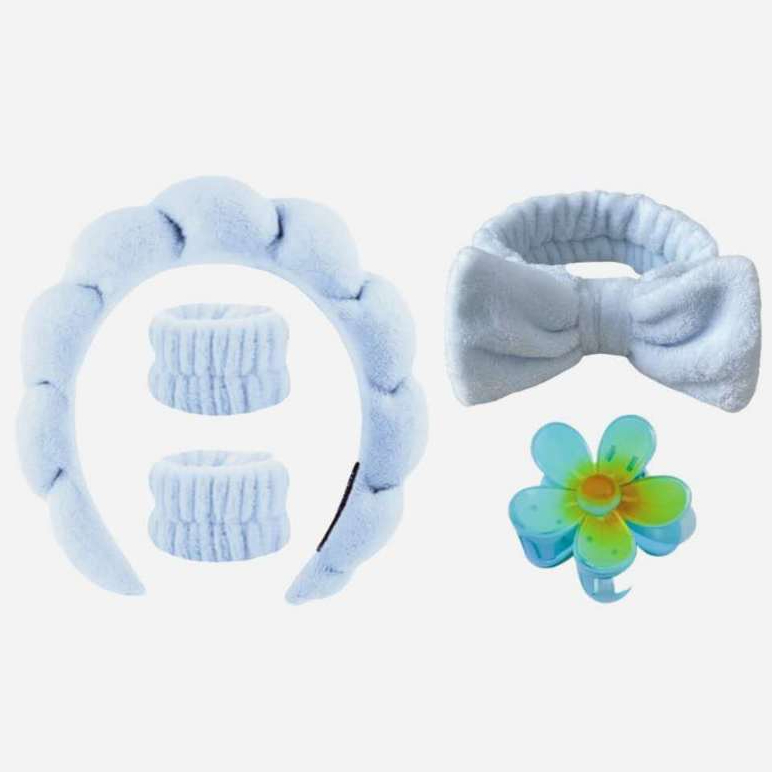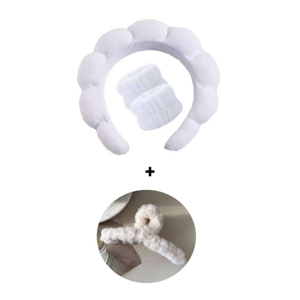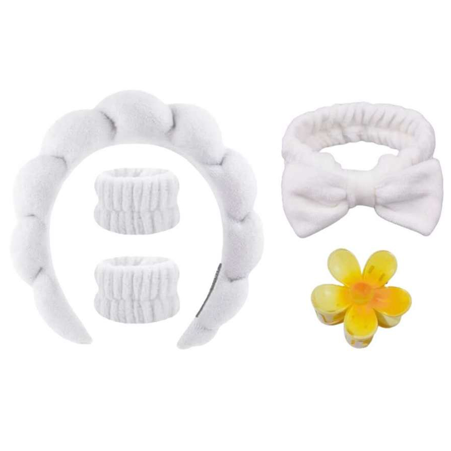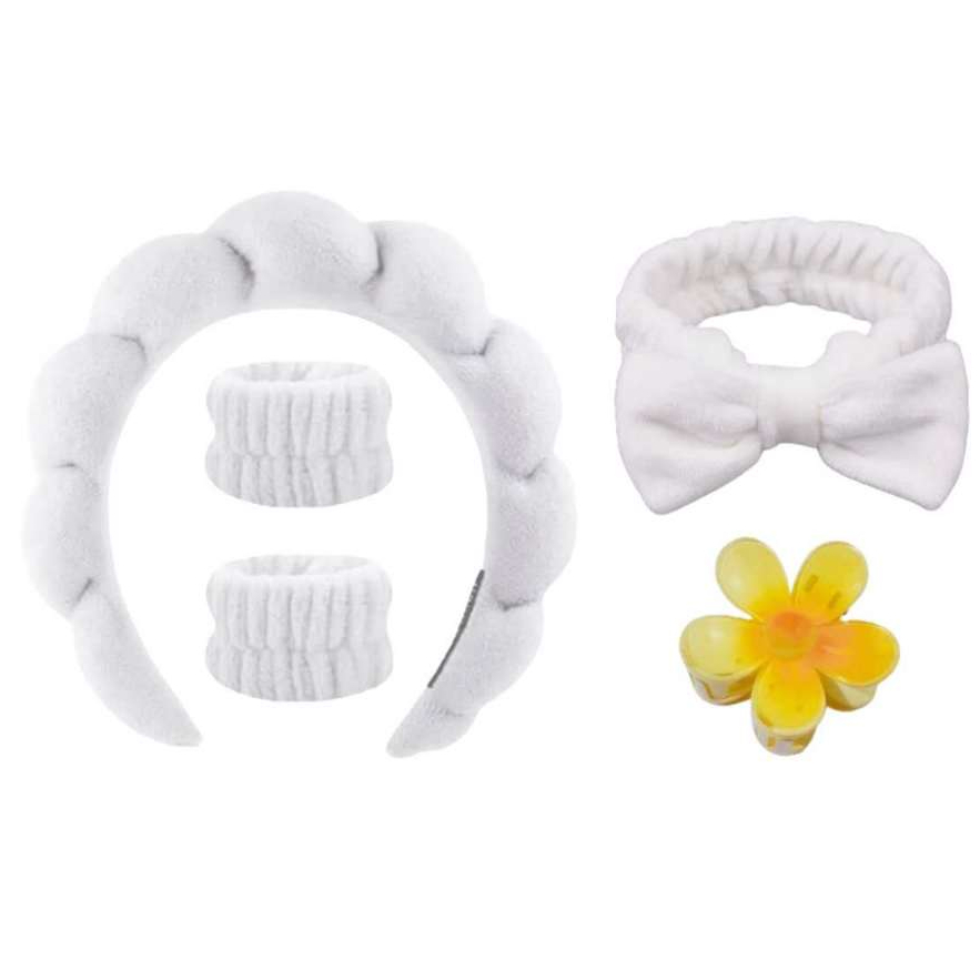 KIT Acessórios de Skincare Spa Feminino - Tiara Nuvem, Faixa de Pulso, Presilha de Flor