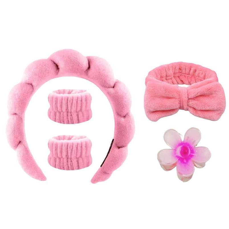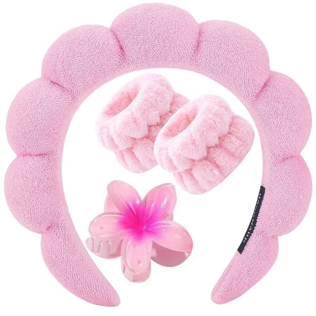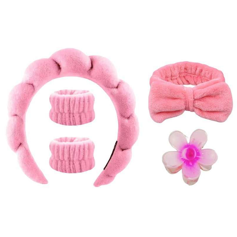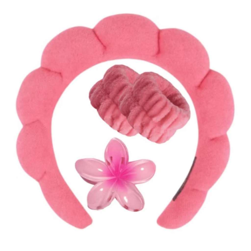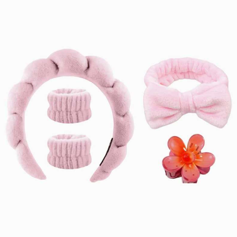 KIT Acessórios de Skincare Spa Feminino - Tiara Nuvem, Faixa de Pulso, Presilha de Flor