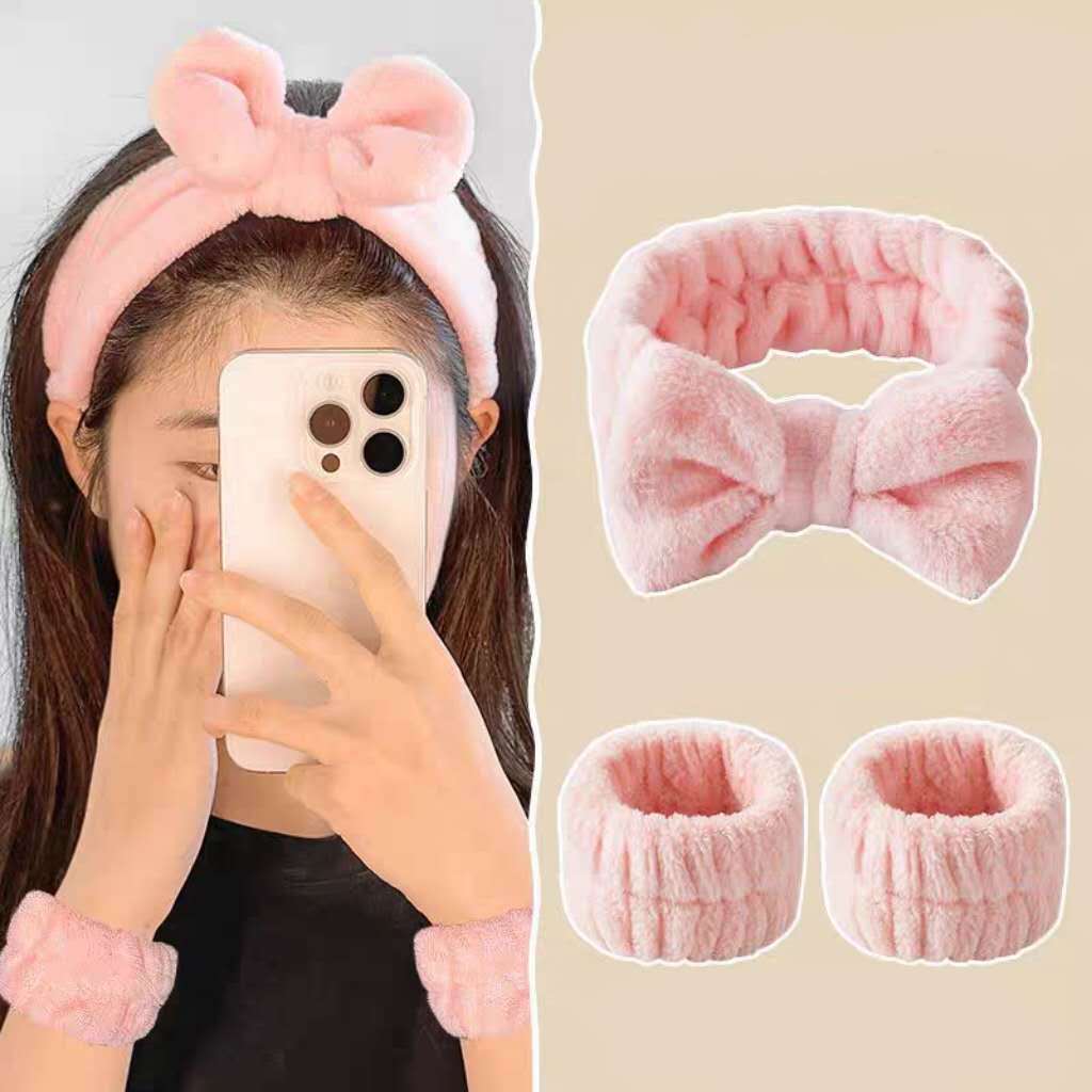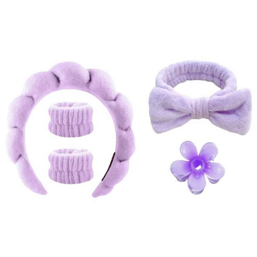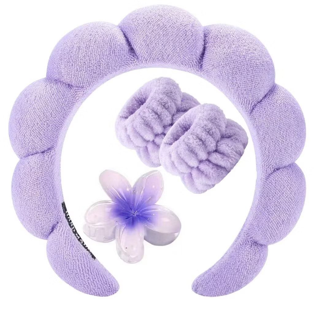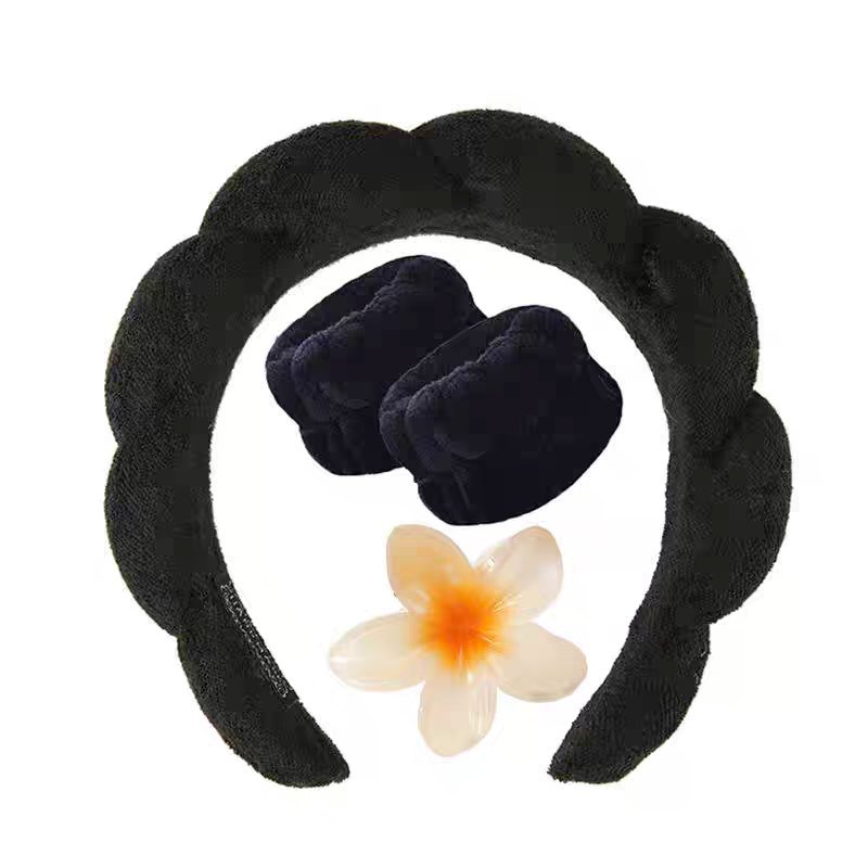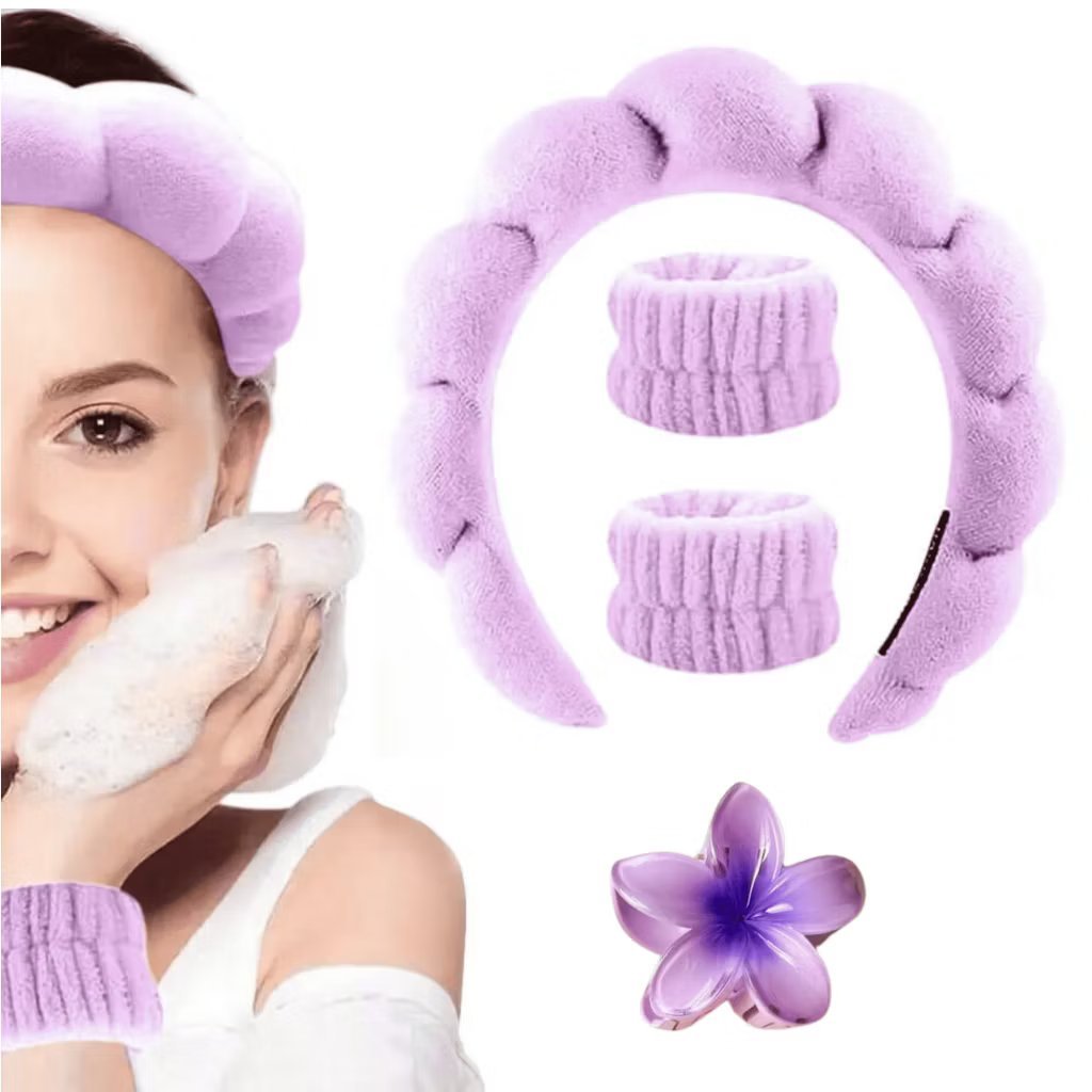 KIT Acessórios de Skincare Spa Feminino - Tiara Nuvem, Faixa de Pulso, Presilha de Flor