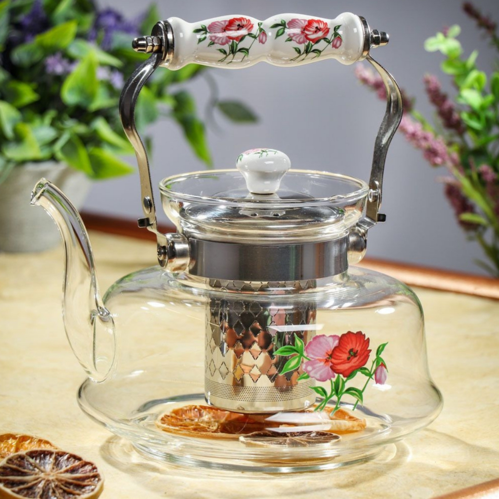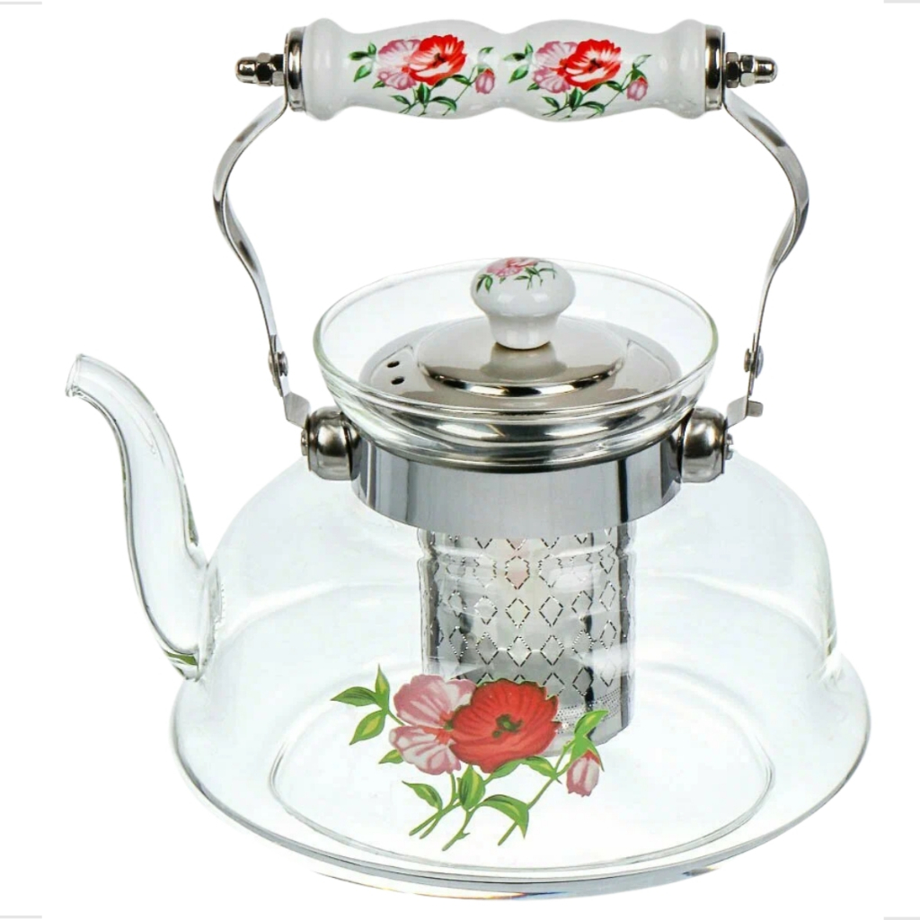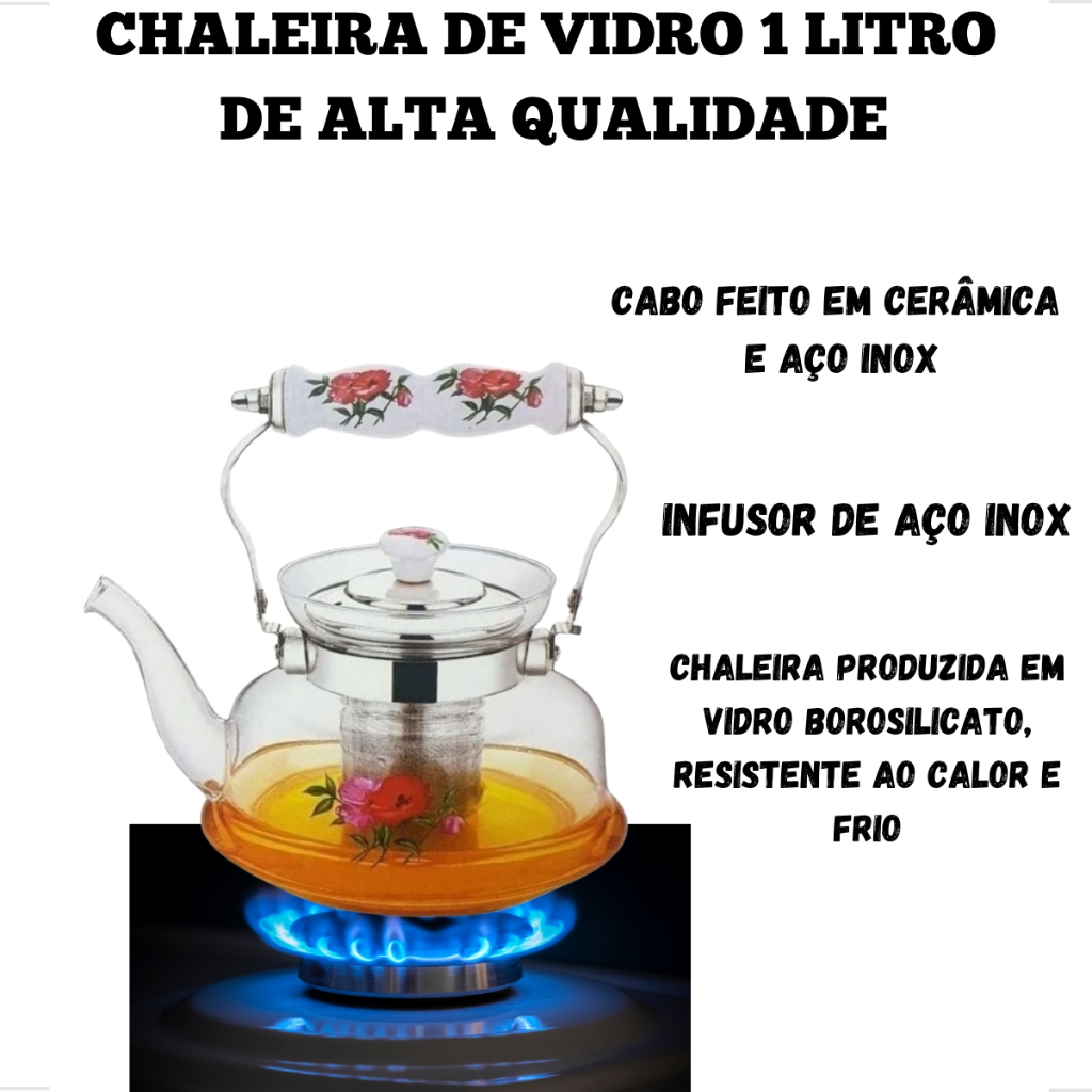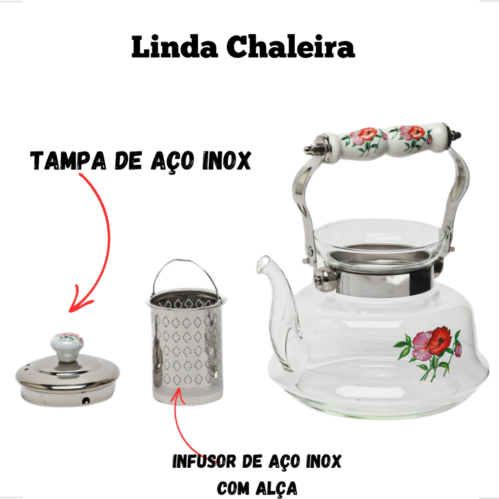 Chaleira Com Infusor De Inox Decorada Com Flor Decorada Chá Café Leite 1 Litro Vidro Vai Ao Fogo