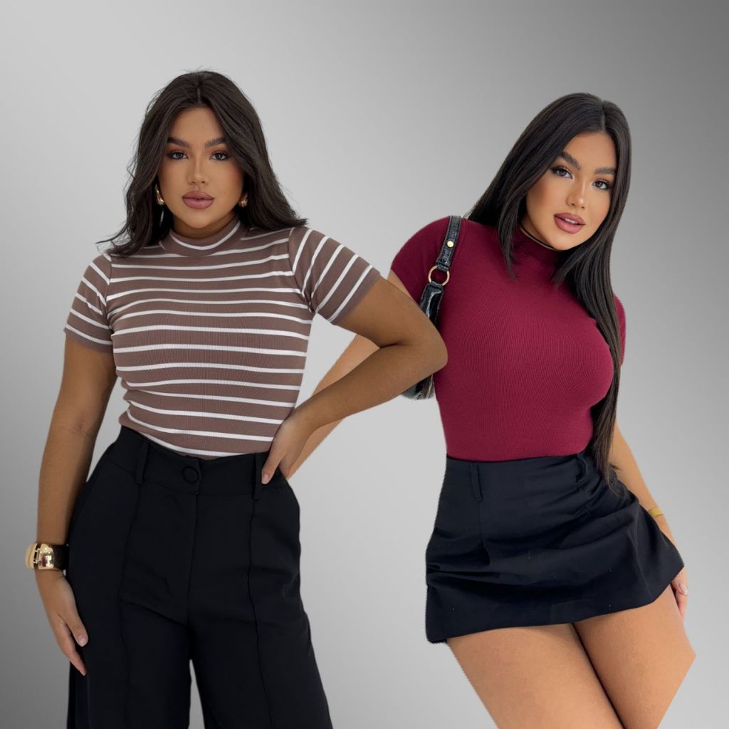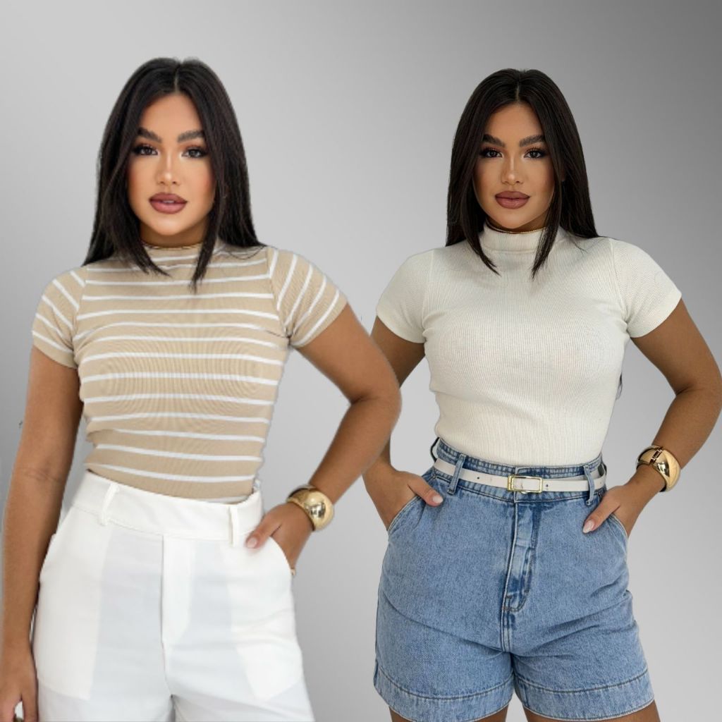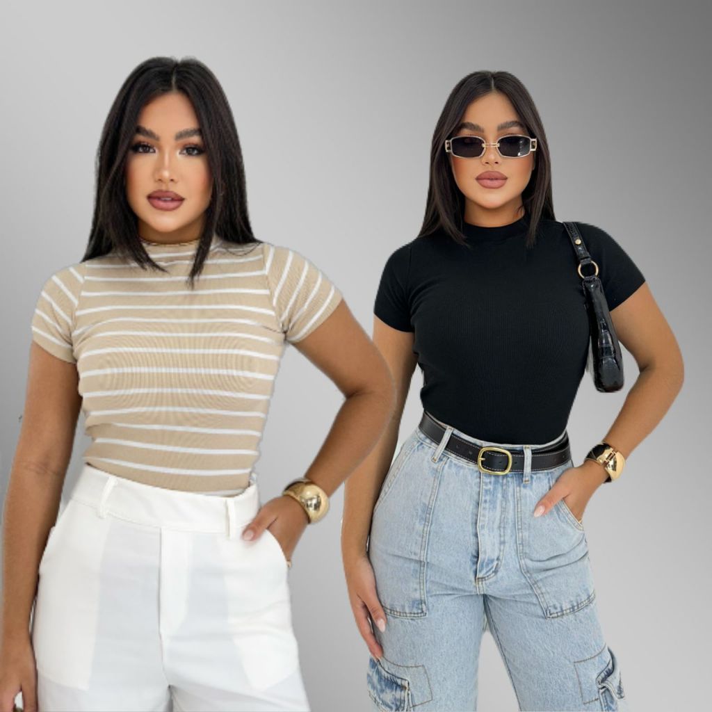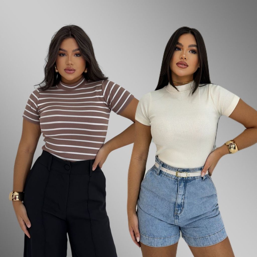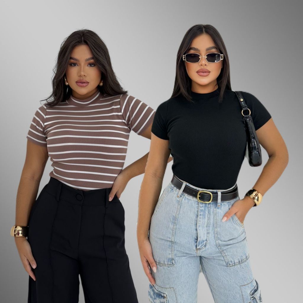 KIT 2 Blusa Básica Listrada e Lisa Ribana Canelado Premium Casual Moda Basico Camiseta T-Shirt