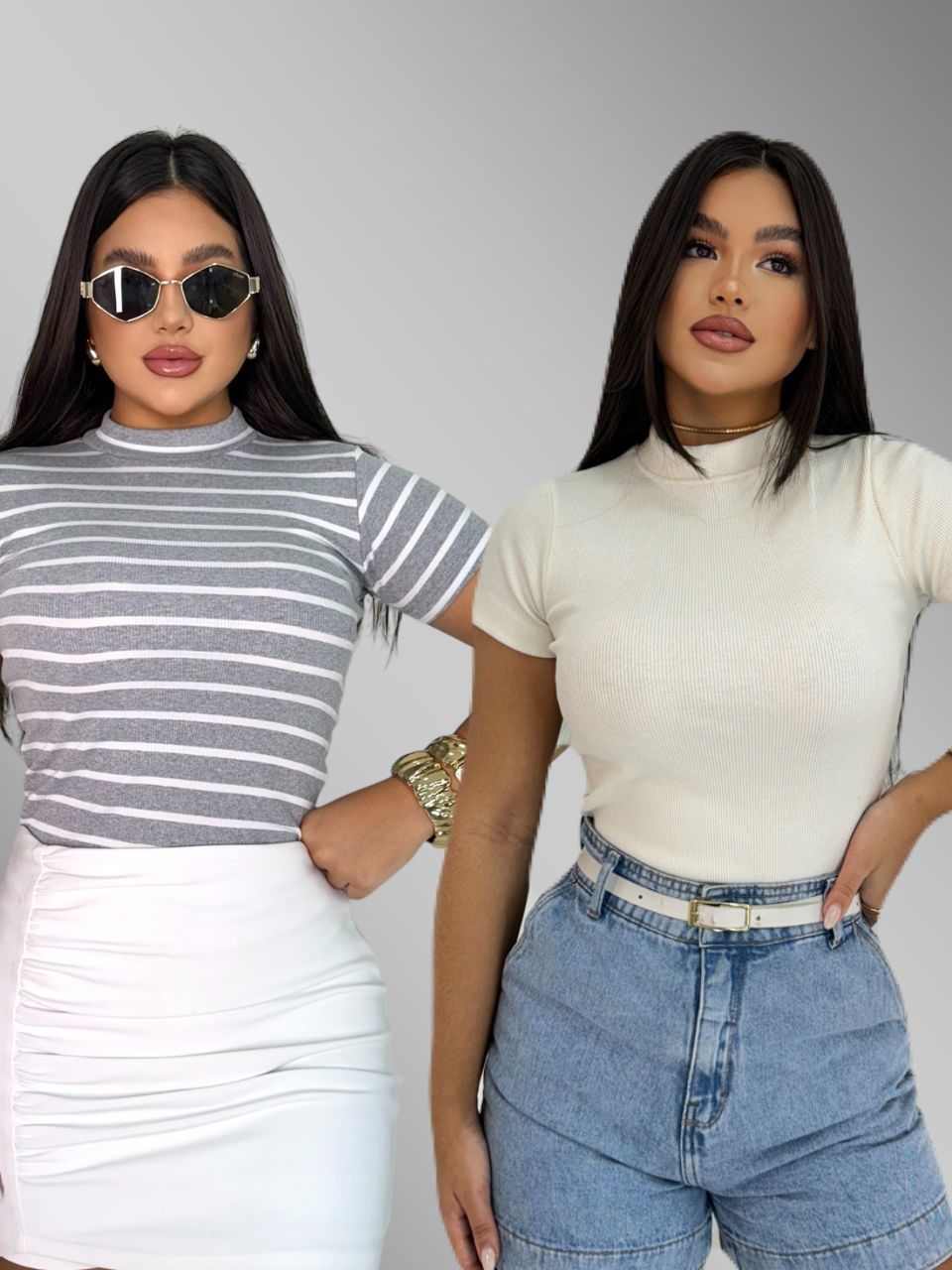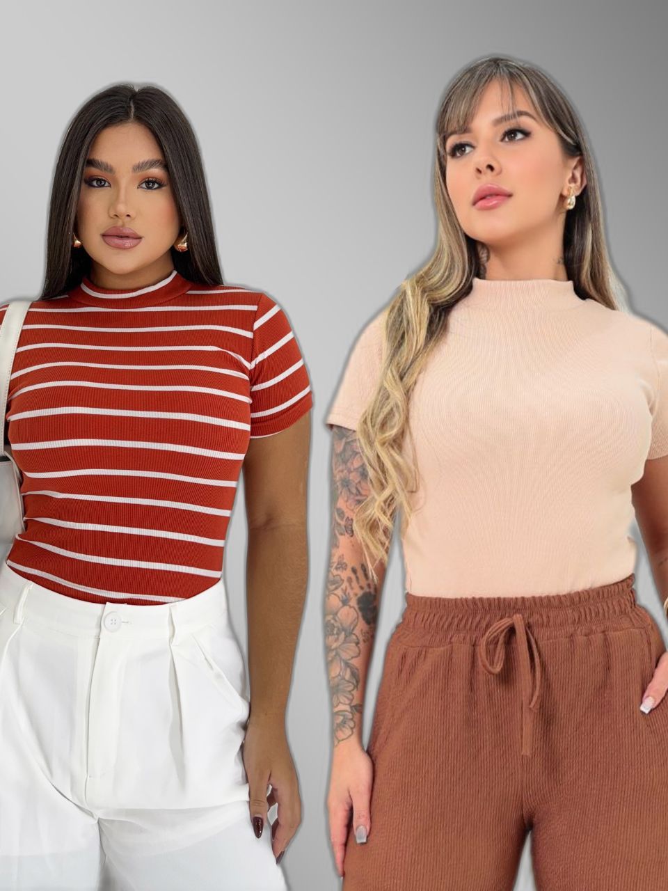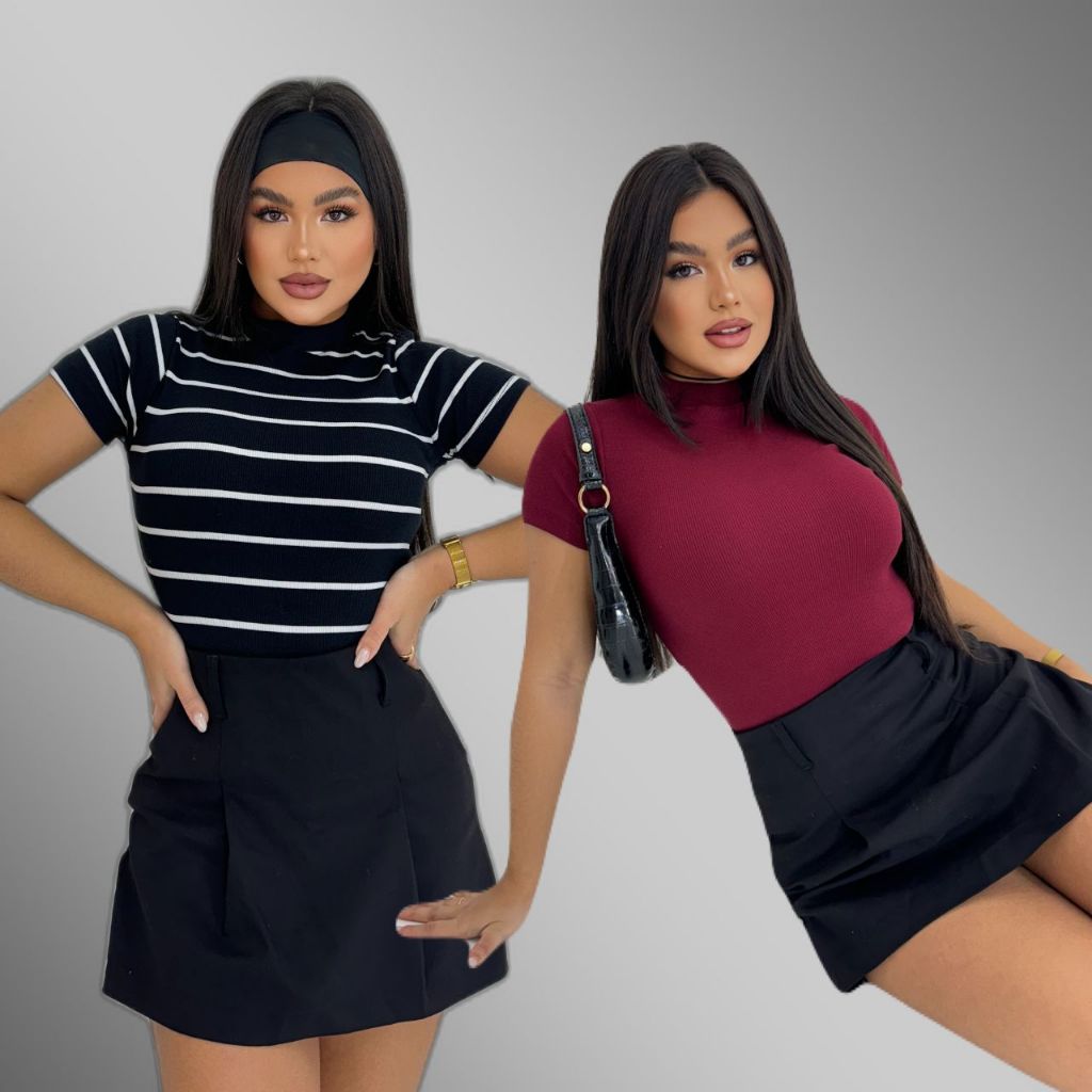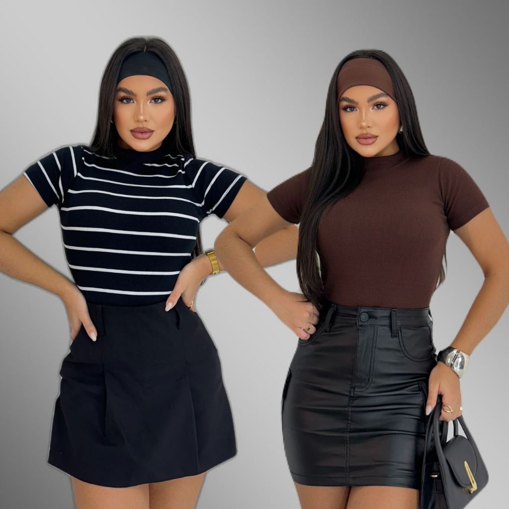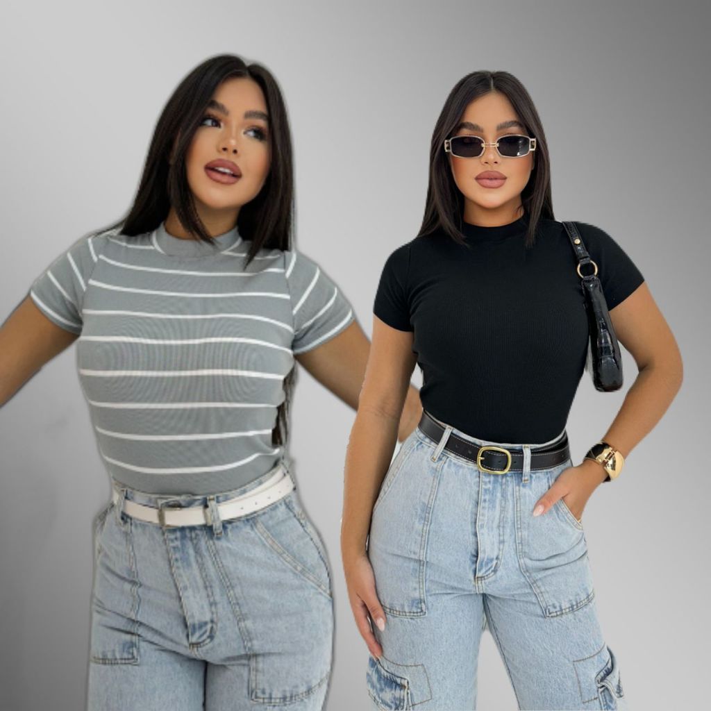 KIT 2 Blusa Básica Listrada e Lisa Ribana Canelado Premium Casual Moda Basico Camiseta T-Shirt