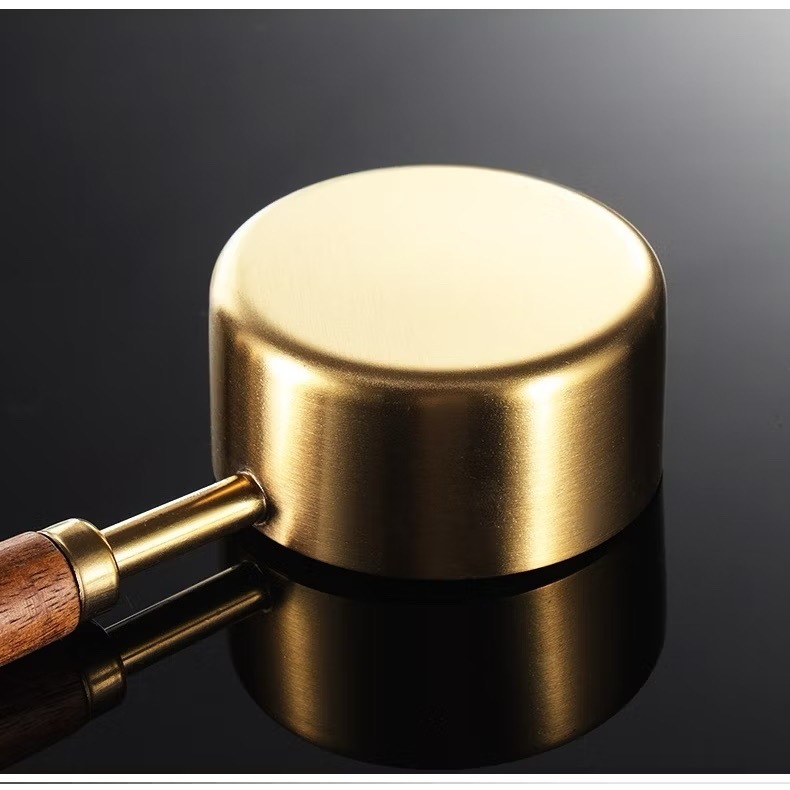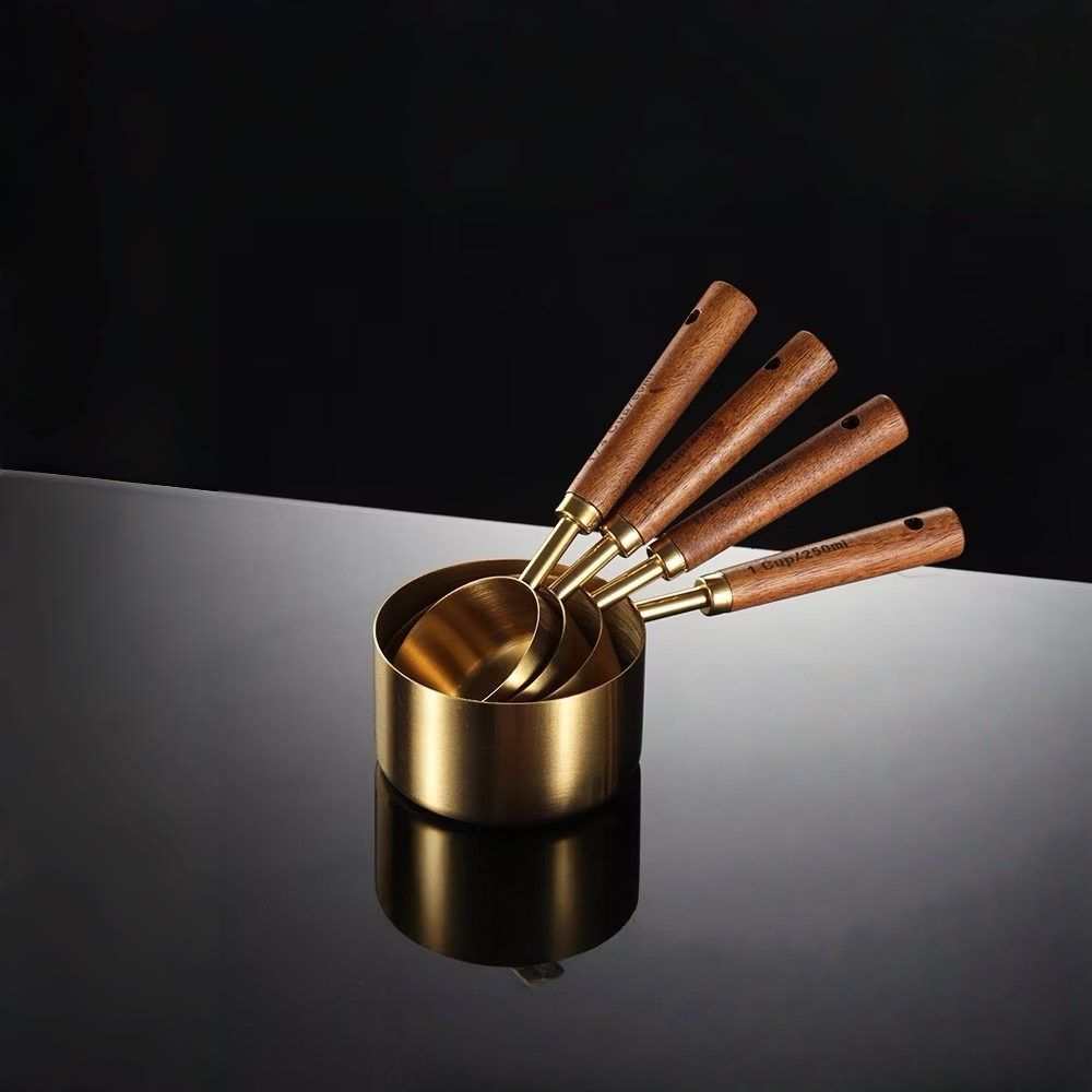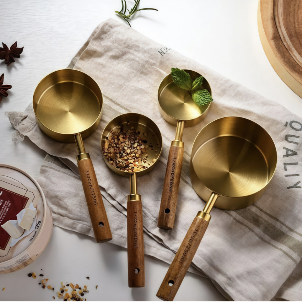 Jogo de Colheres e Copos Medidores em Aço Inoxidável com Cabo de Madeira – Dourado Luxo para Cozinha