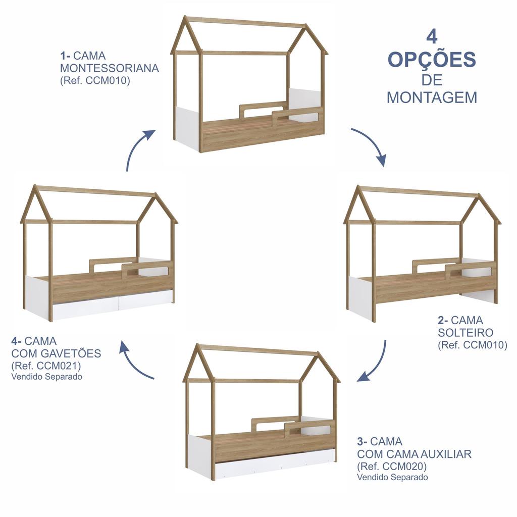 Cama Infantil Montessoriana Casa Solteiro Menino/a Proteção Lateral Gaveta com Roda Aveiro/Branco
