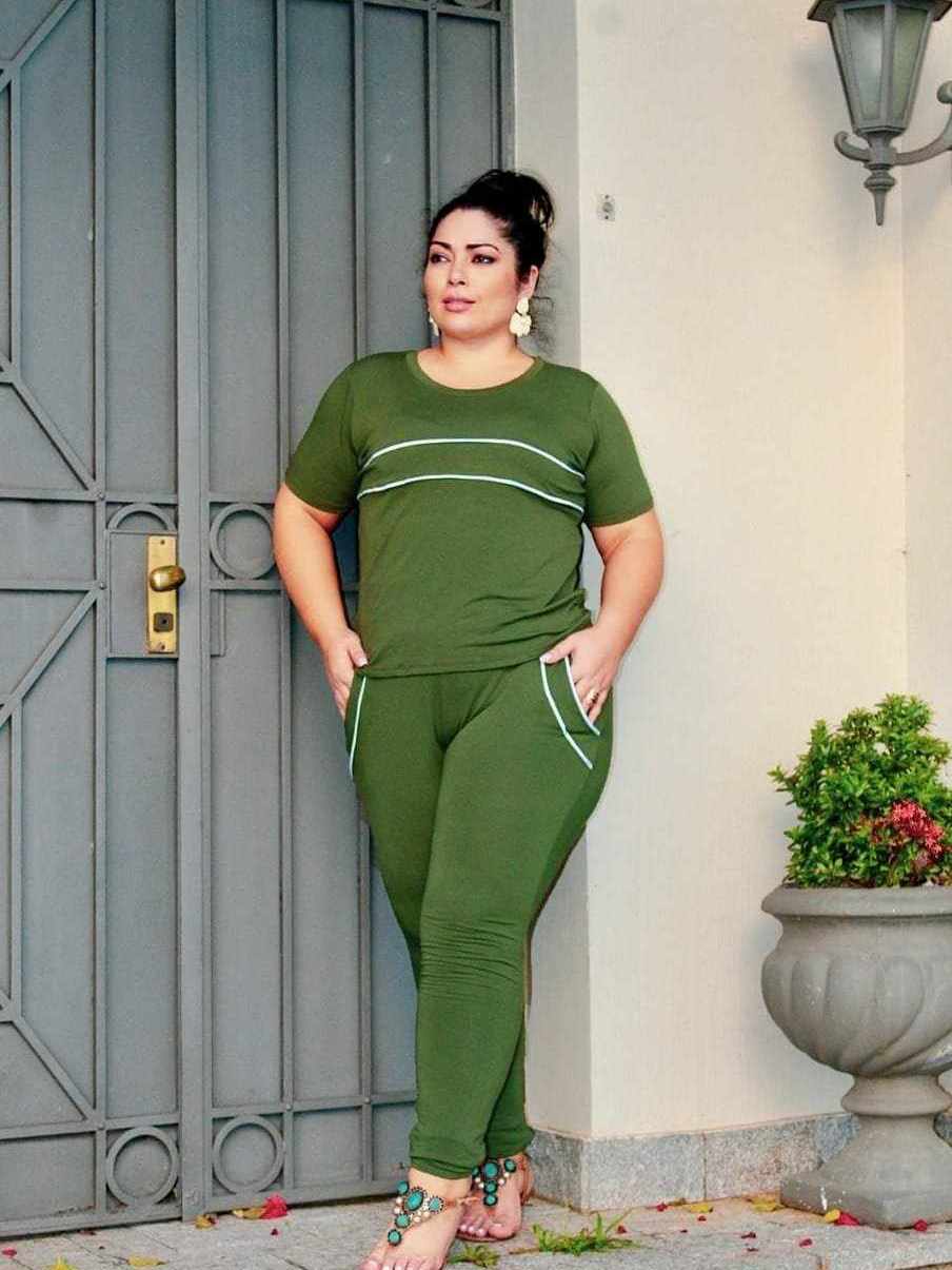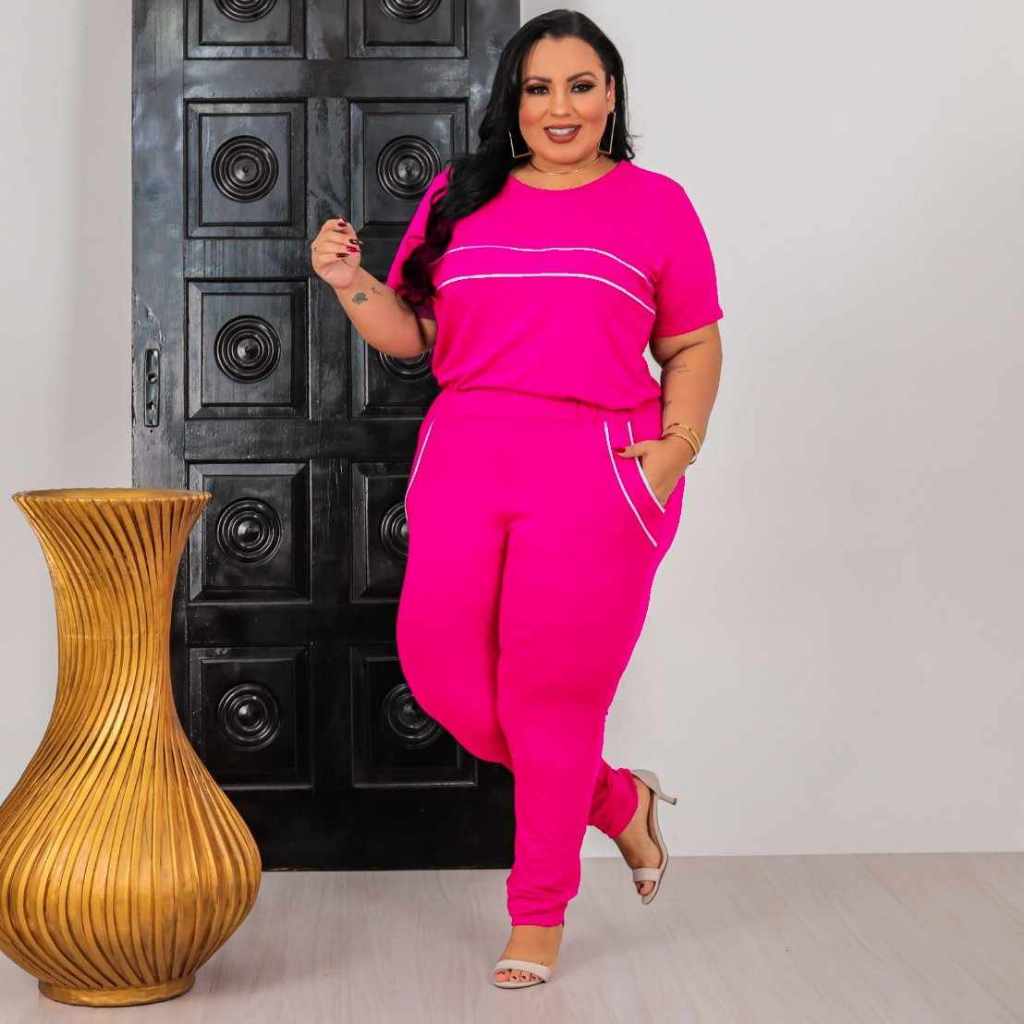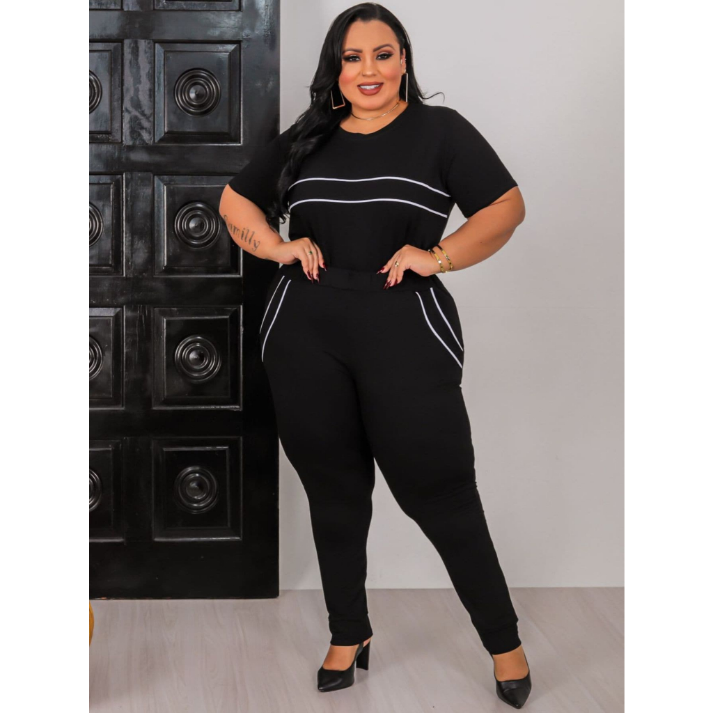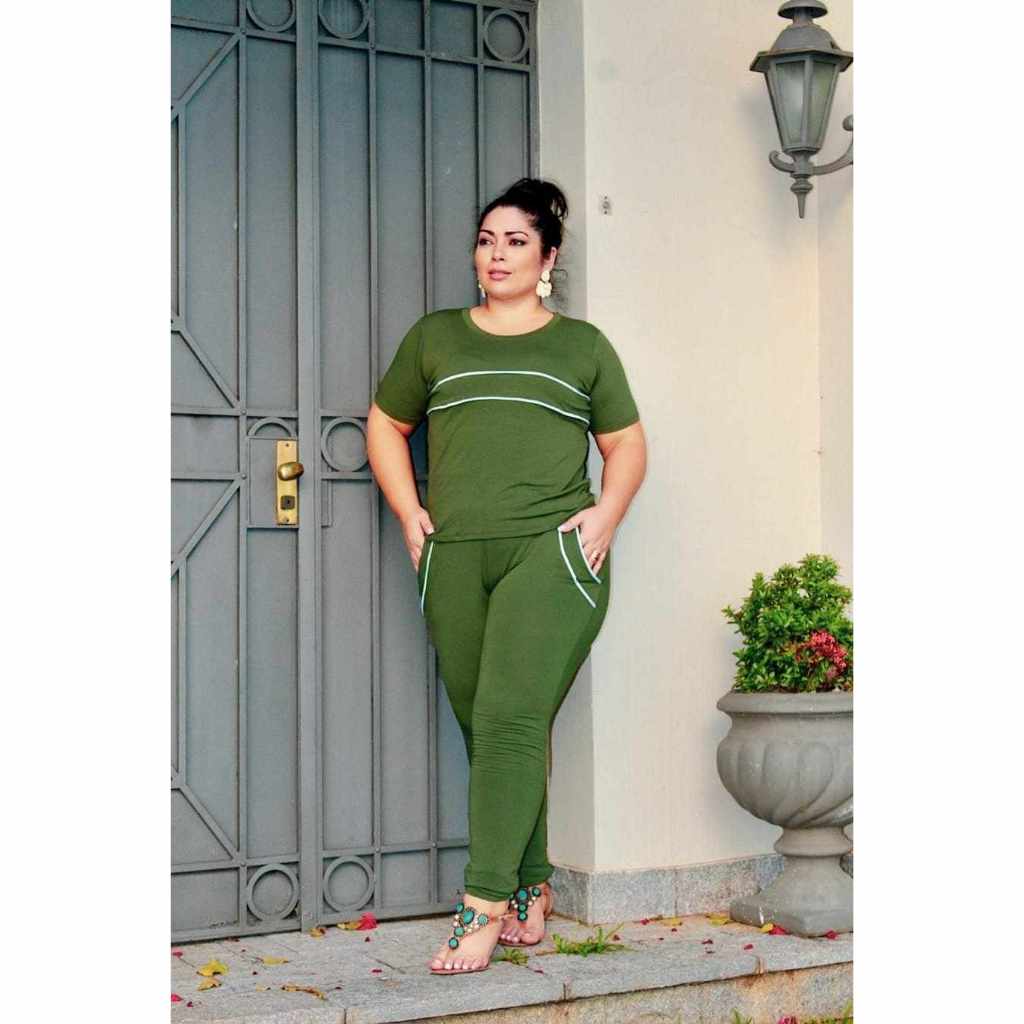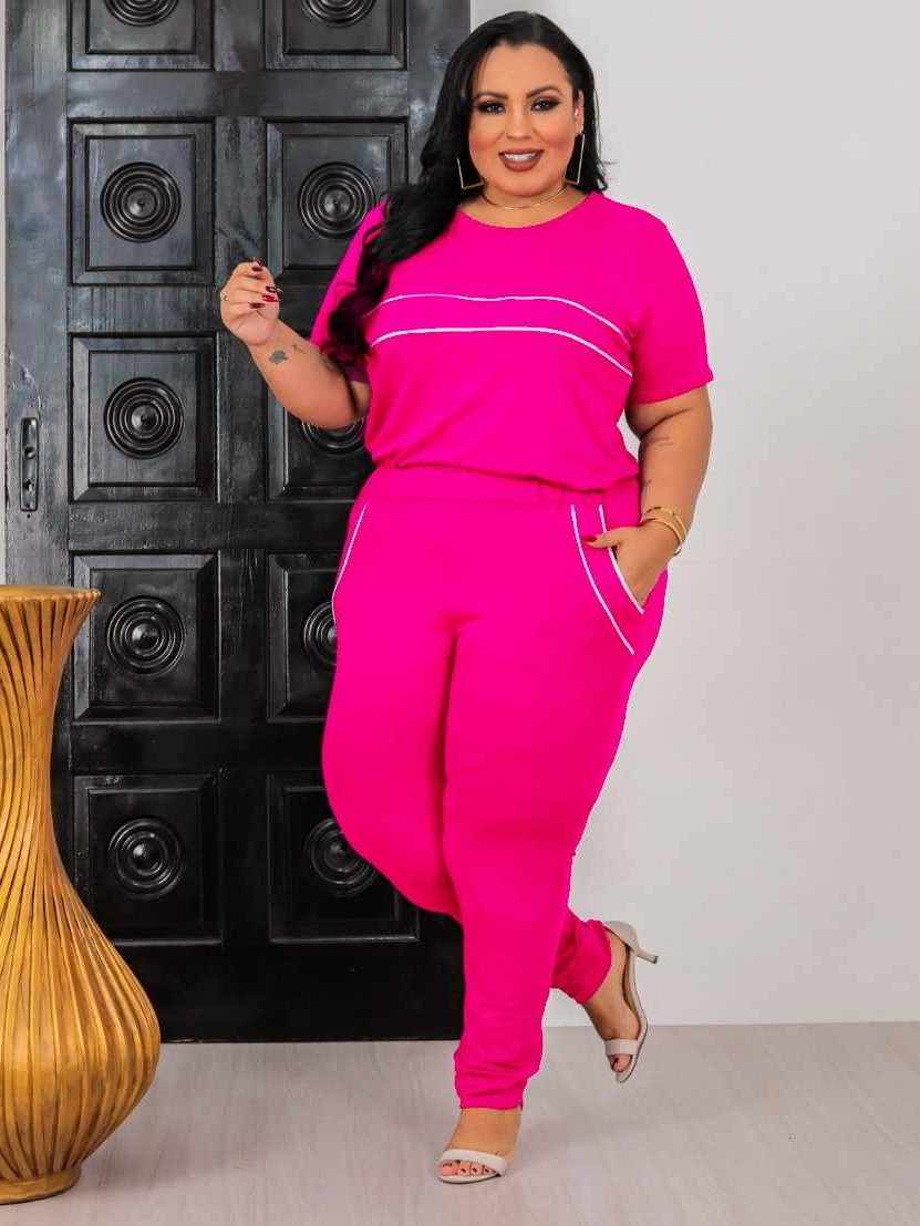 Conjunto Feminino Plus Size de Calça e Blusa de Manga Curta no Moletinho de Viscose Premium