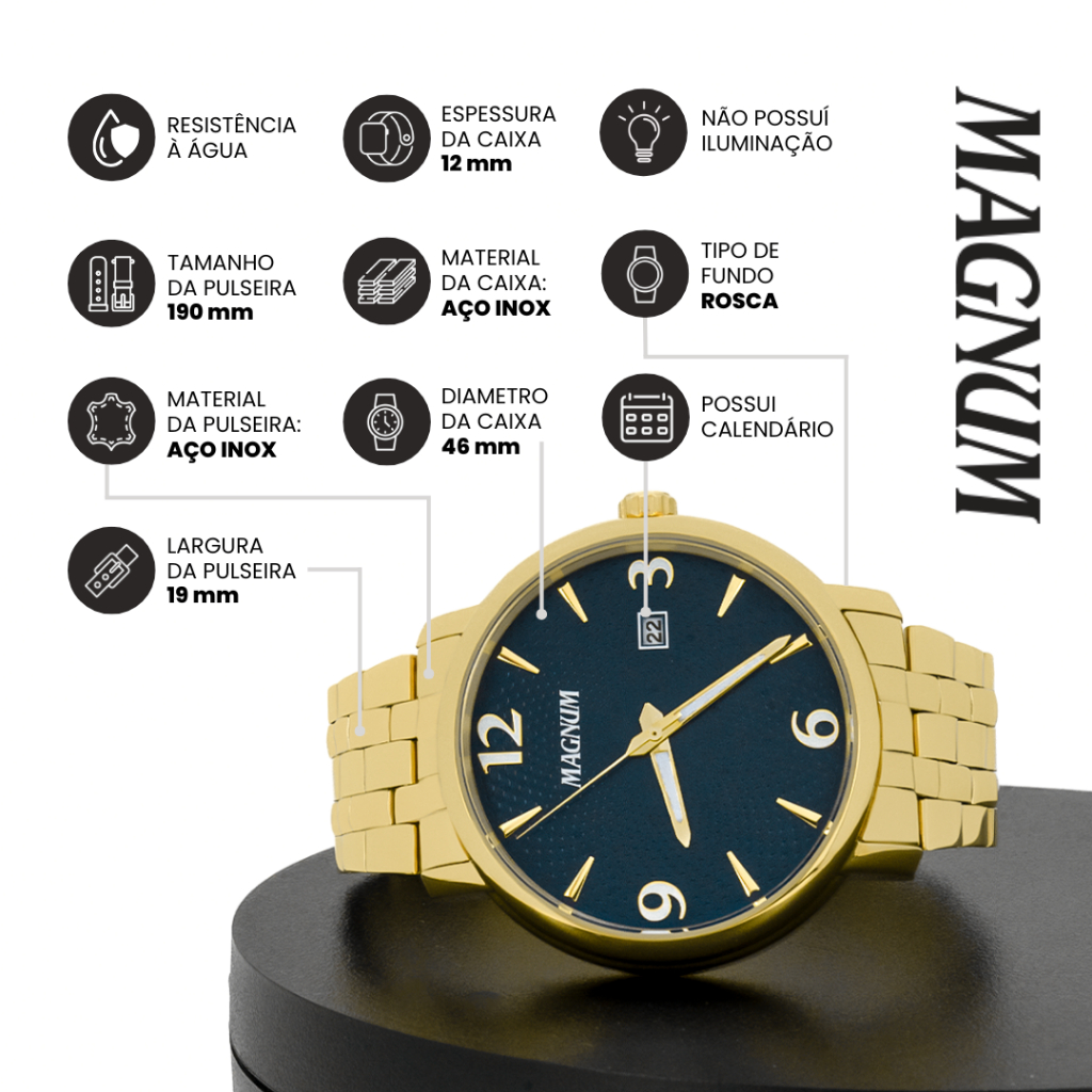 Relogio Magnum Original Masculino Aço Inoxidavel Dourado Resistente a Agua Original 2 Anos Garantia