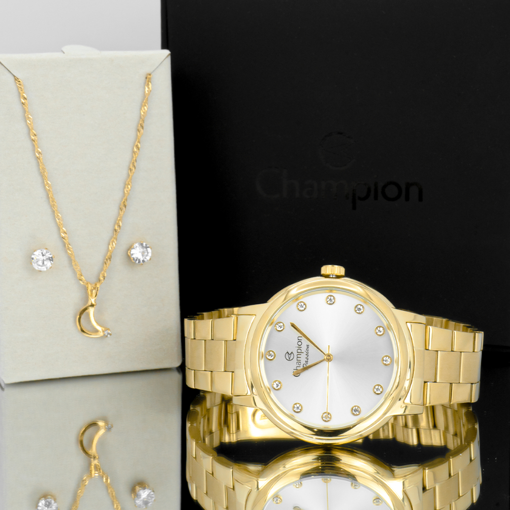 Relógio Feminino Champion Dourado Casual Original Garantia 1 ano + Kit Colar e Brinco