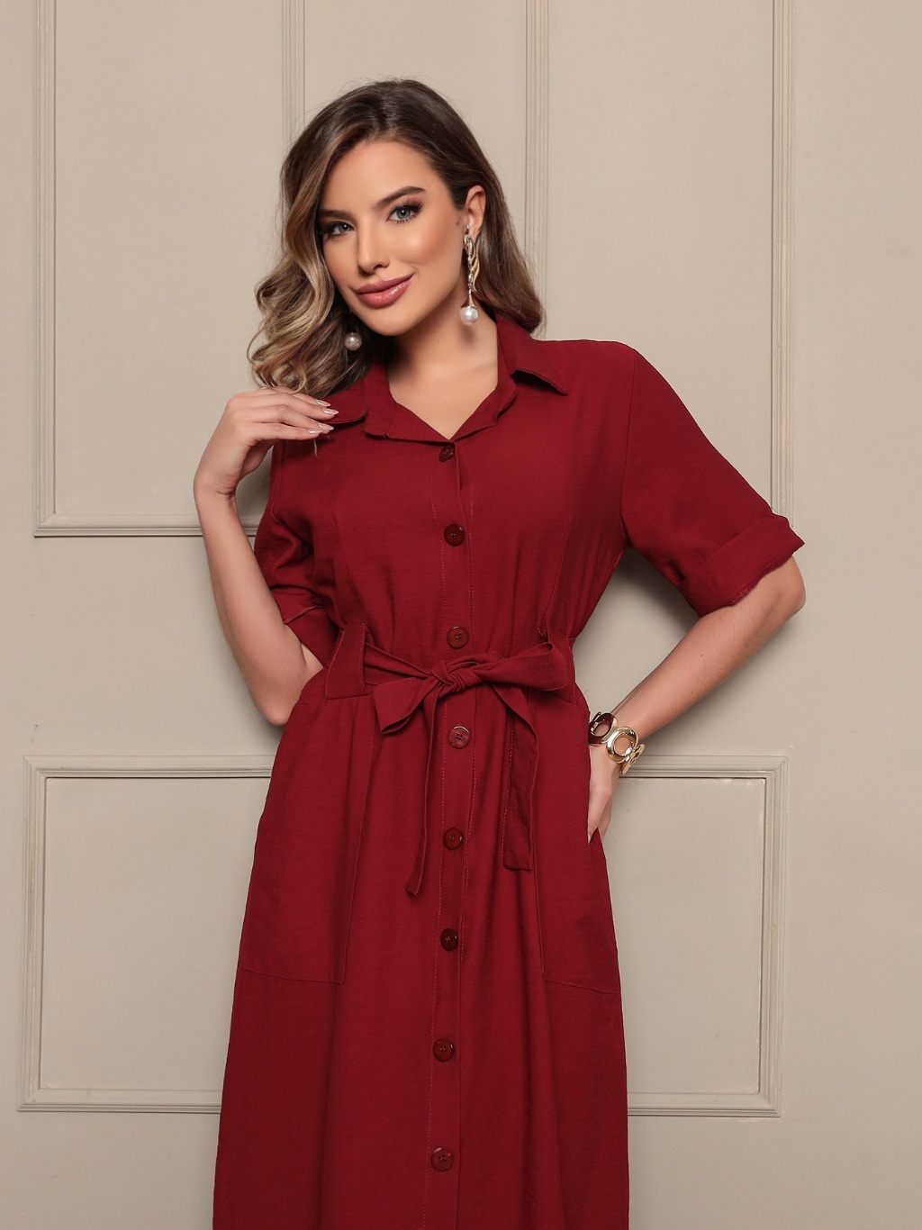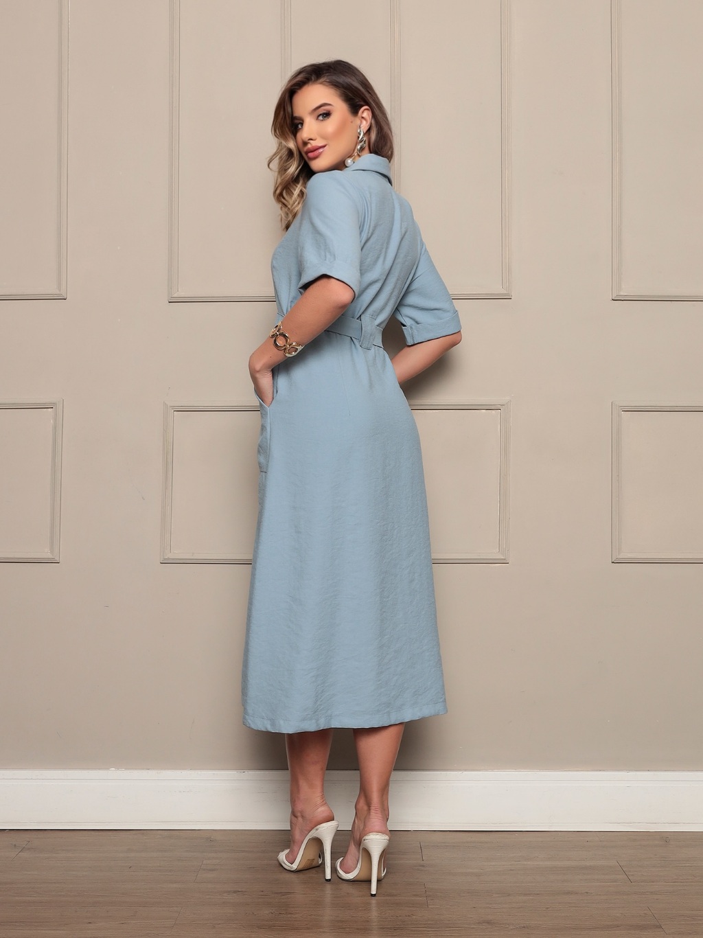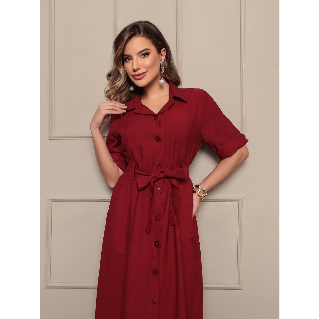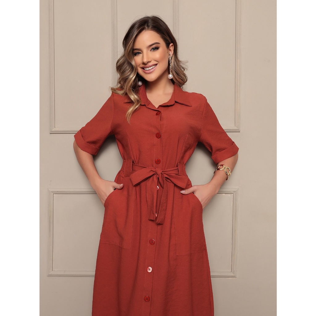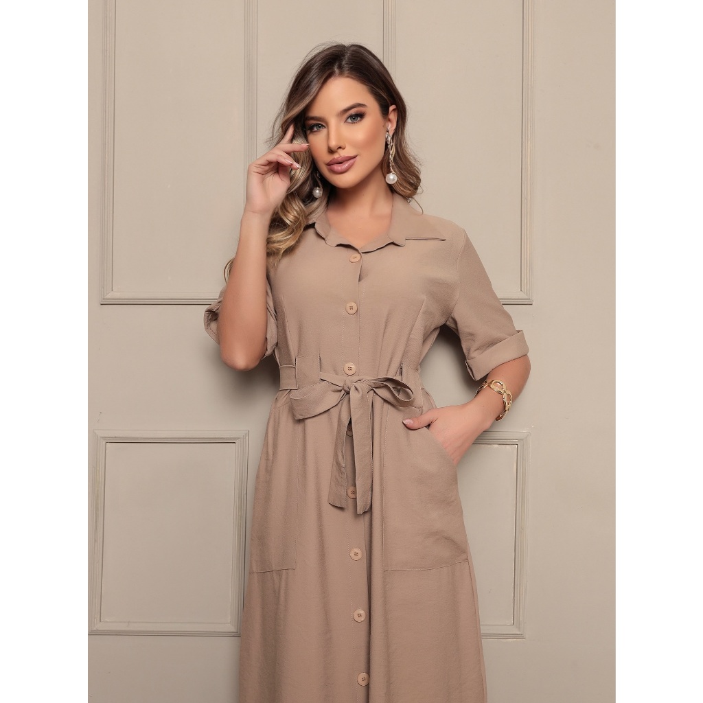 Buscamoda Vestido comprido Lançamento 2025 sensorial com cinto com bolsas botões gola social