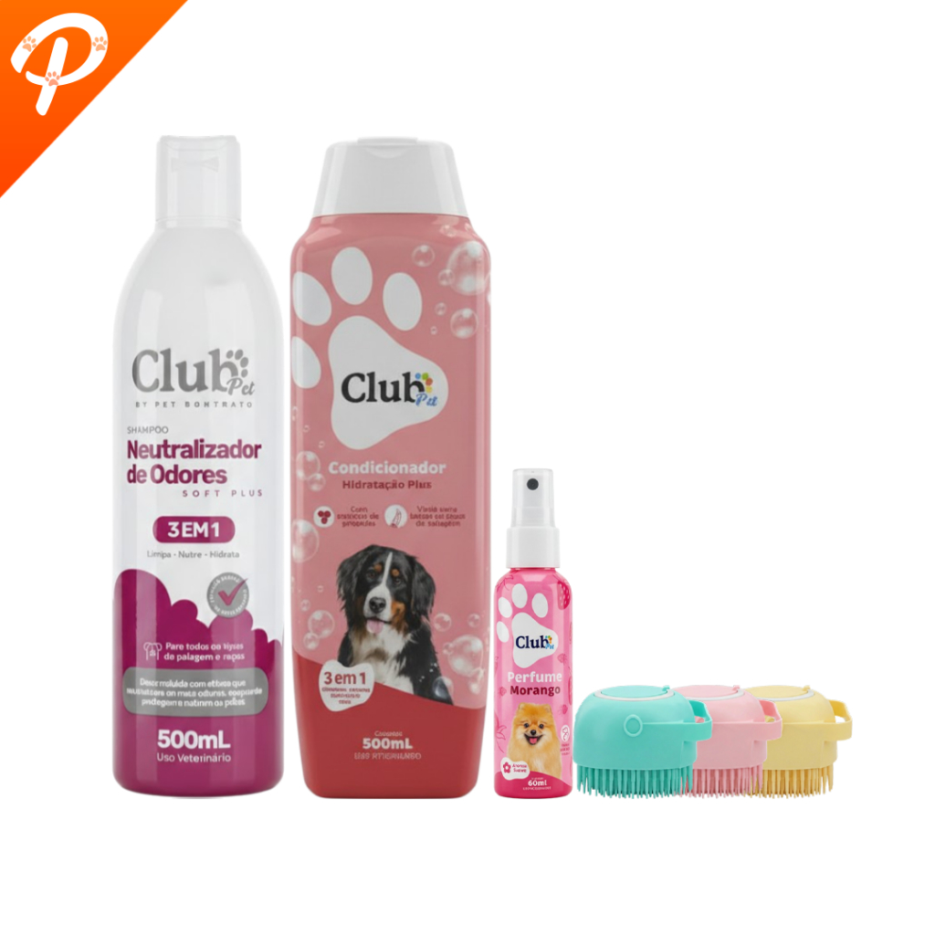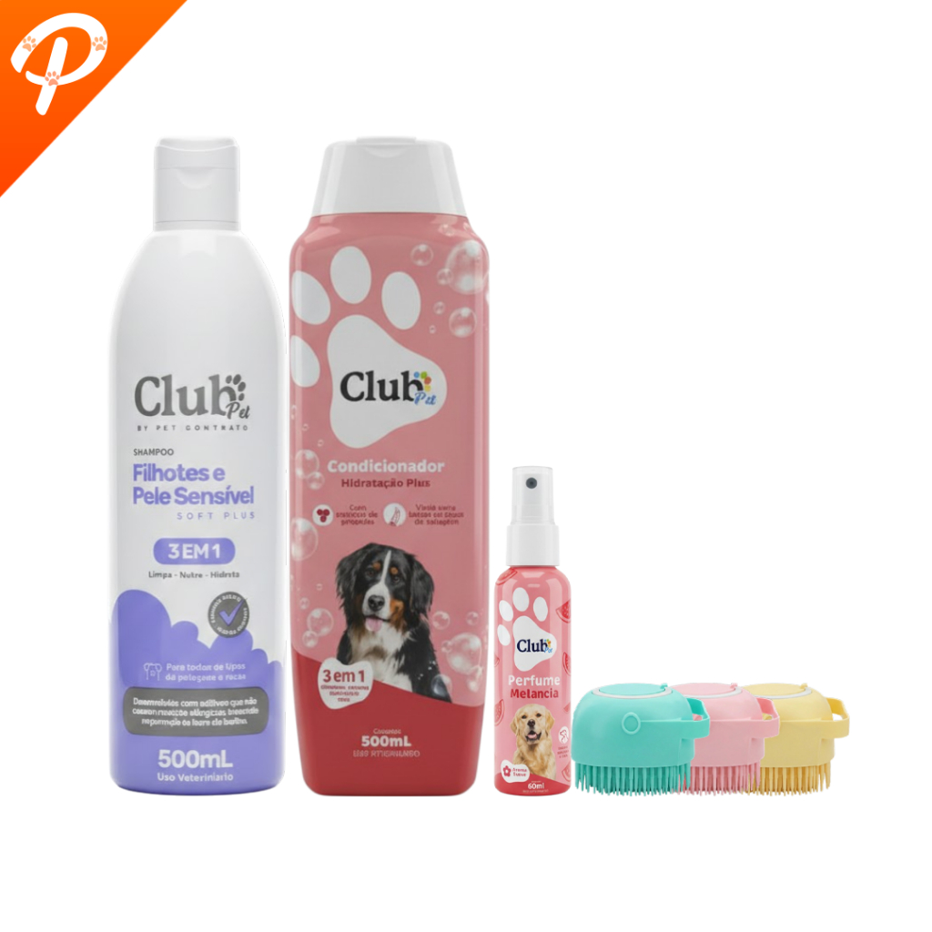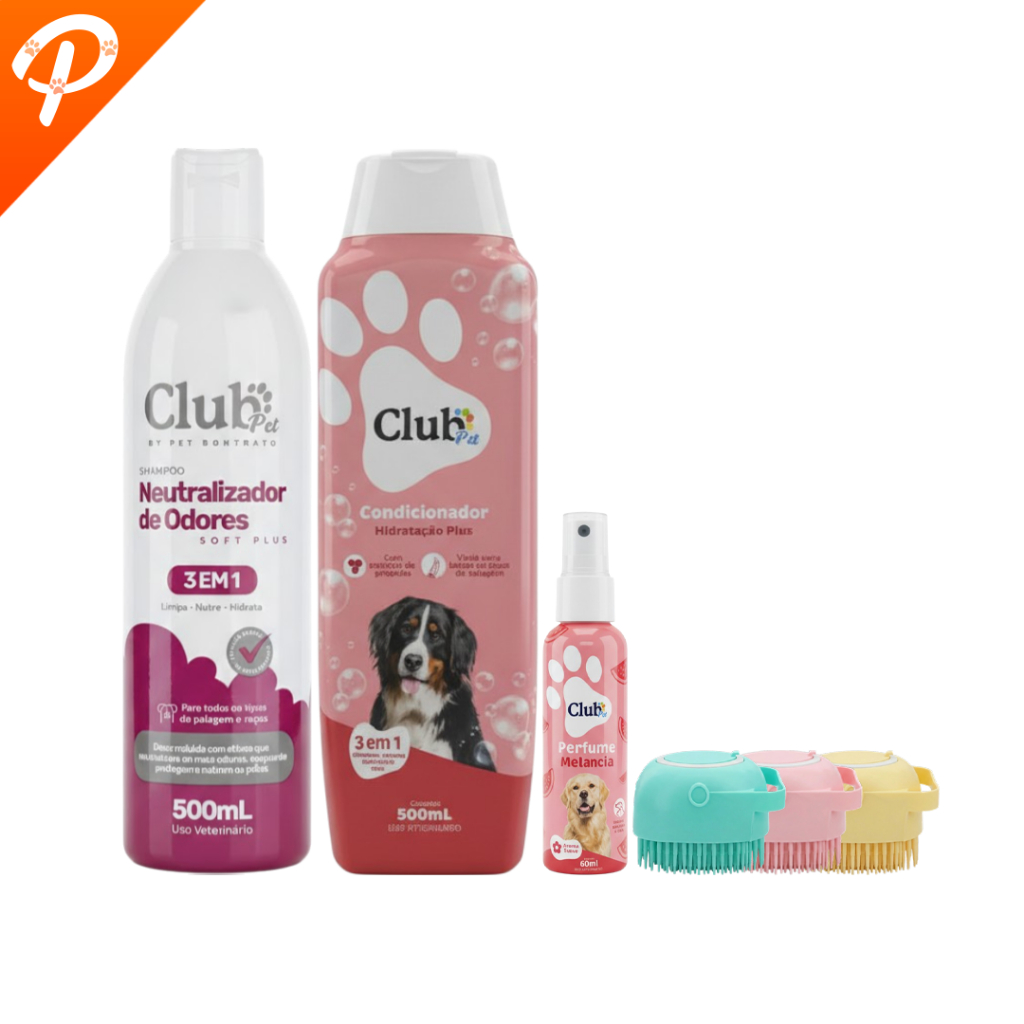 Kit Higiene Pet 3 em 1 Banho Com Escova Massageadora Dispenser Shampoos Condicionador e Perfumes