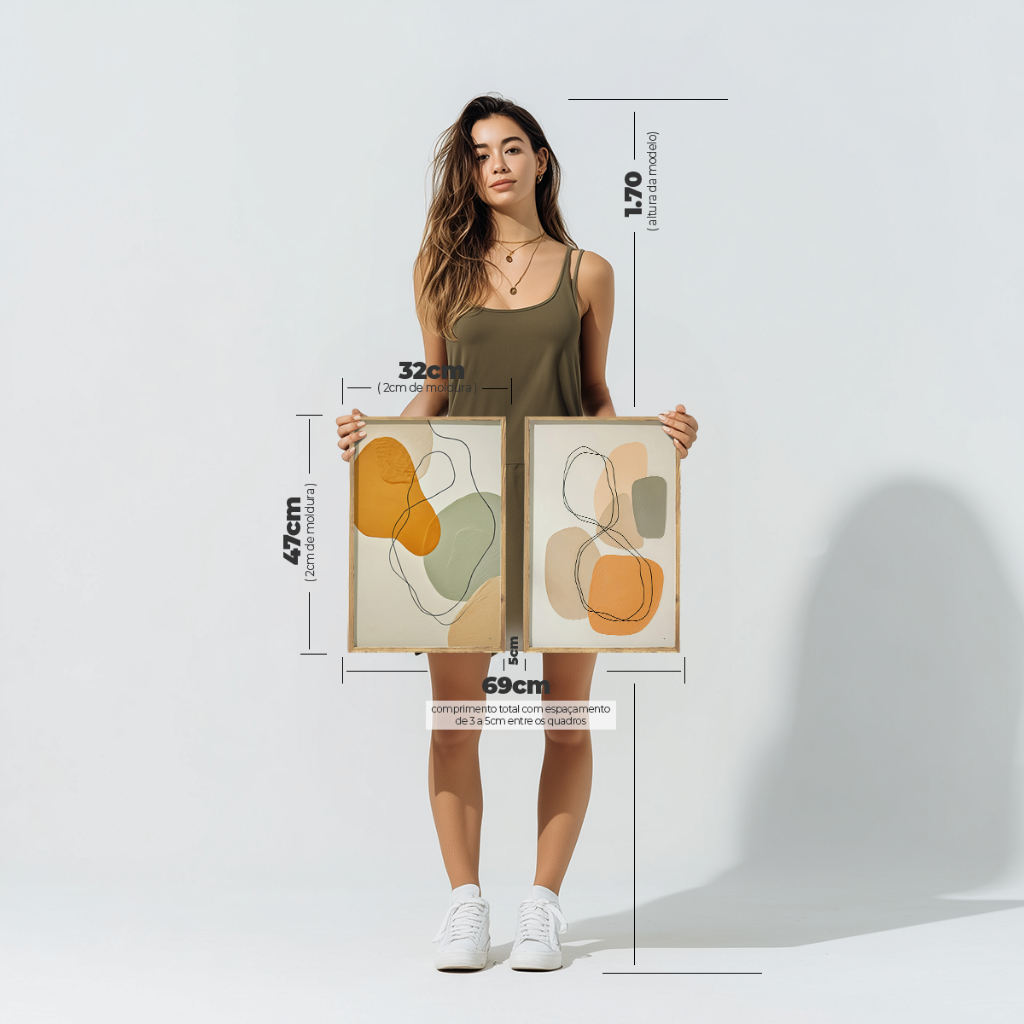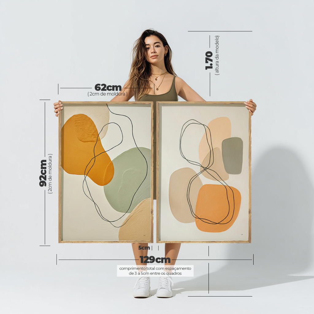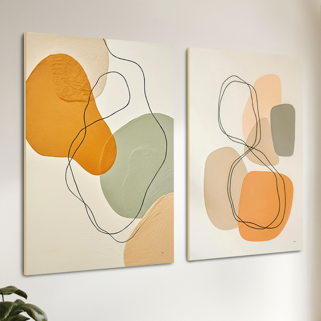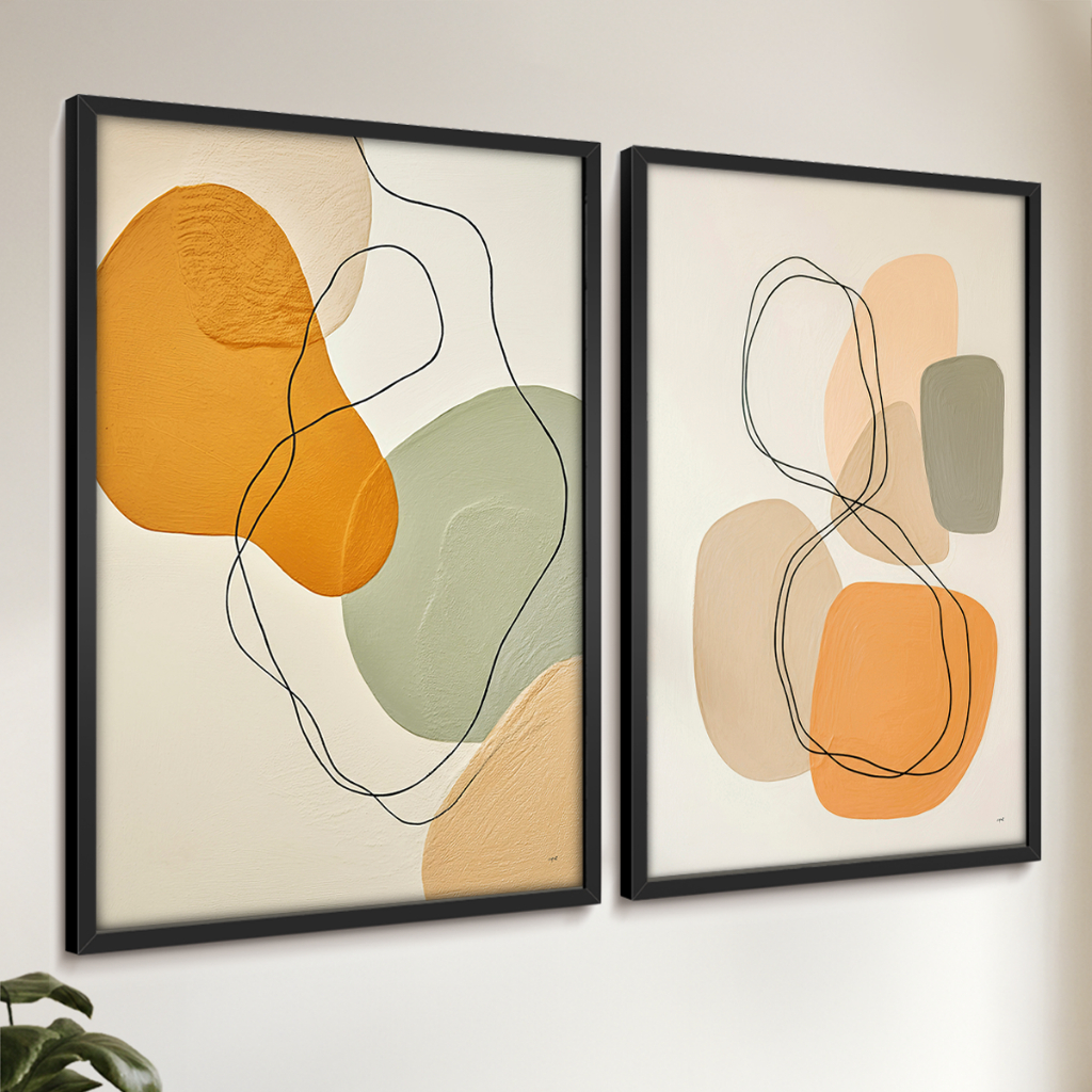 2 Quadros Decorativos COM/SEM Moldura Sala Quarto Escritório Abstrato Orgânico Linhas Laranja Verde