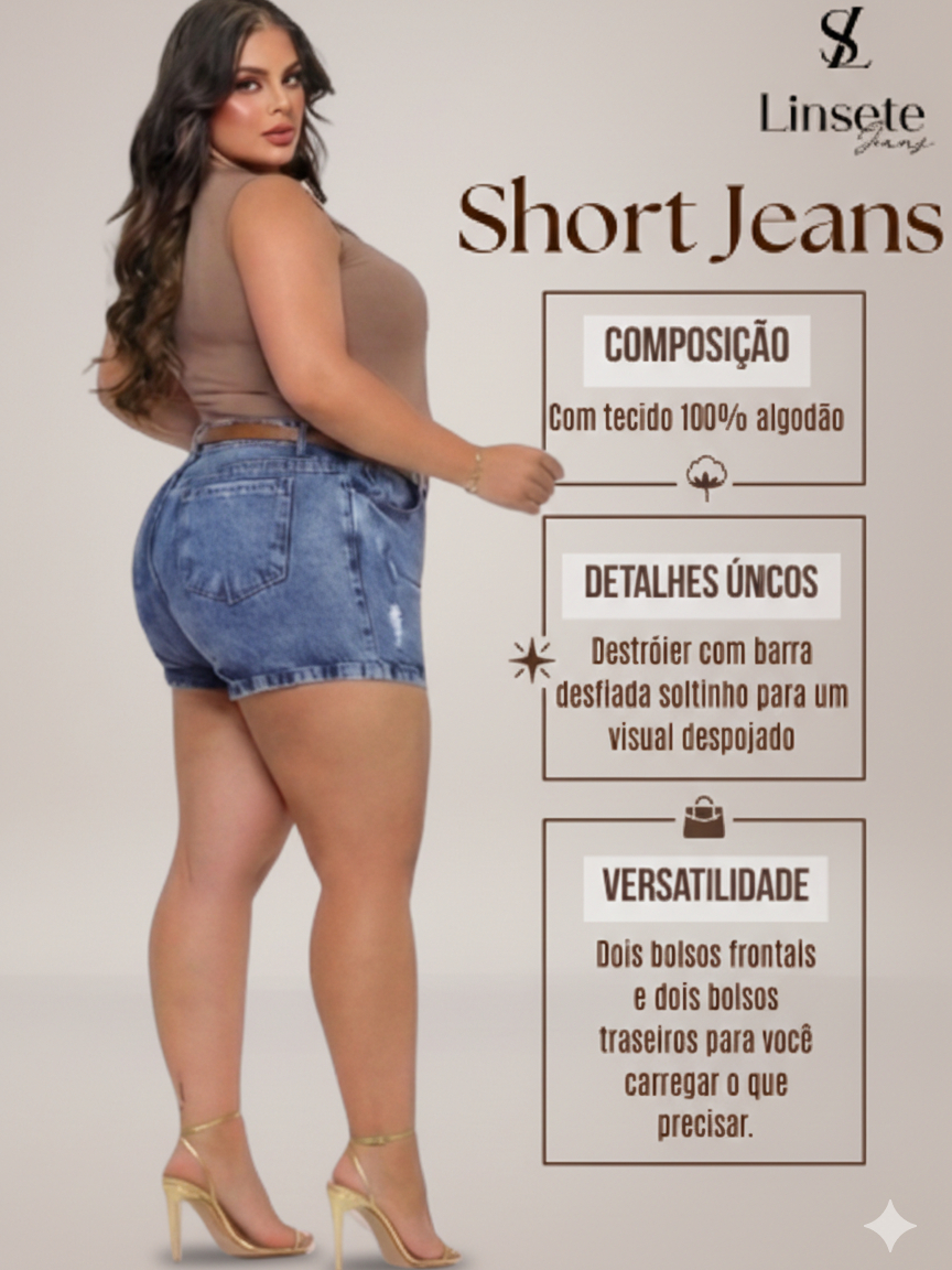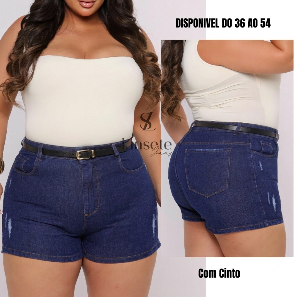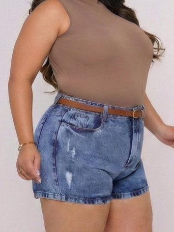 Short Plus Size Jeans Feminino Cintura Alta Com Cinto 100% Algodão