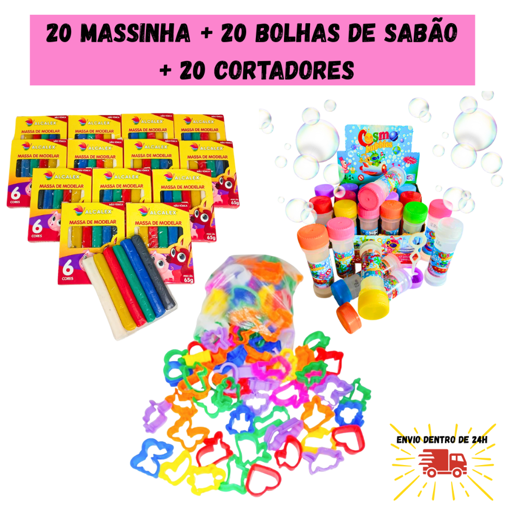 Kit 20 Cx Massinha de Modelar + 20 Bolha de Sabão + 20 Cortador Molde Festa Lembrancinha Infantil