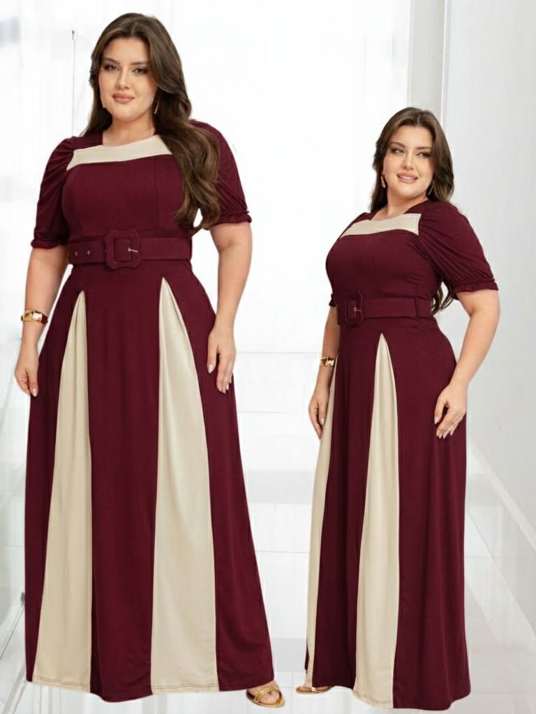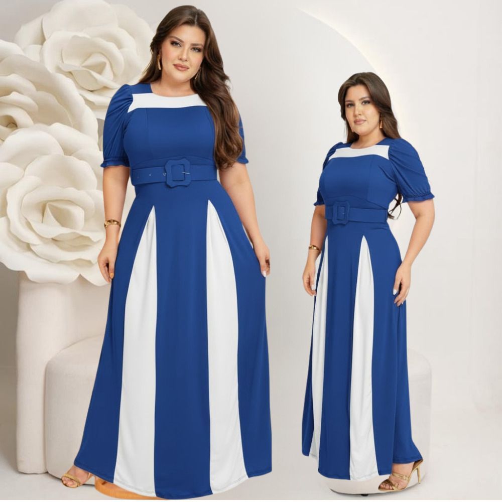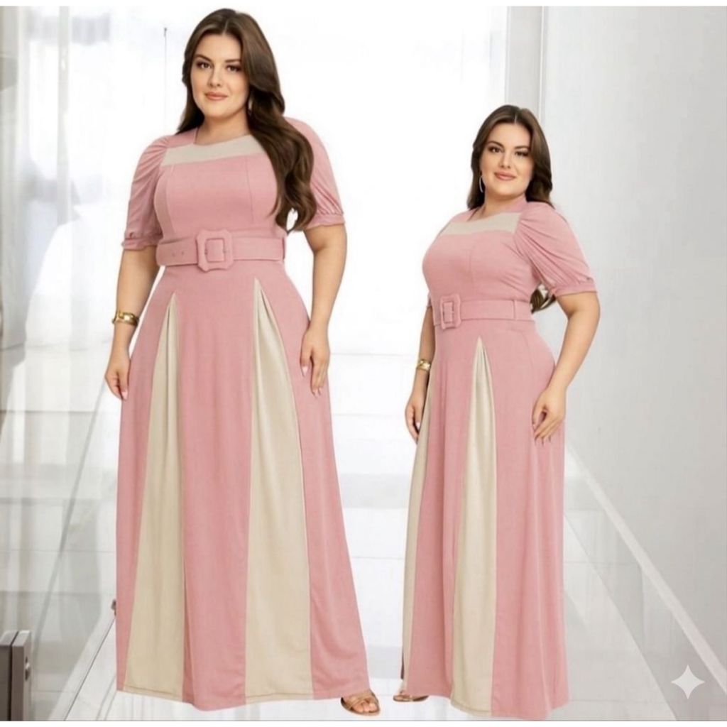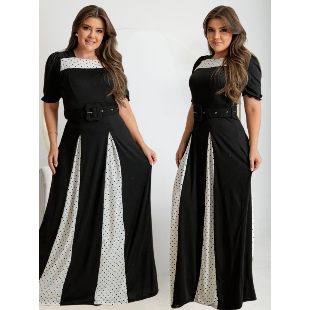Vestido Feminino Longo Bicolor Social Manga Estilosa Cinto Moda Evangélica Plus Size Congresso