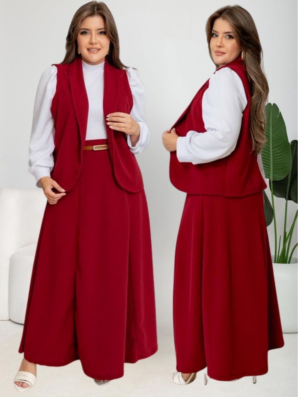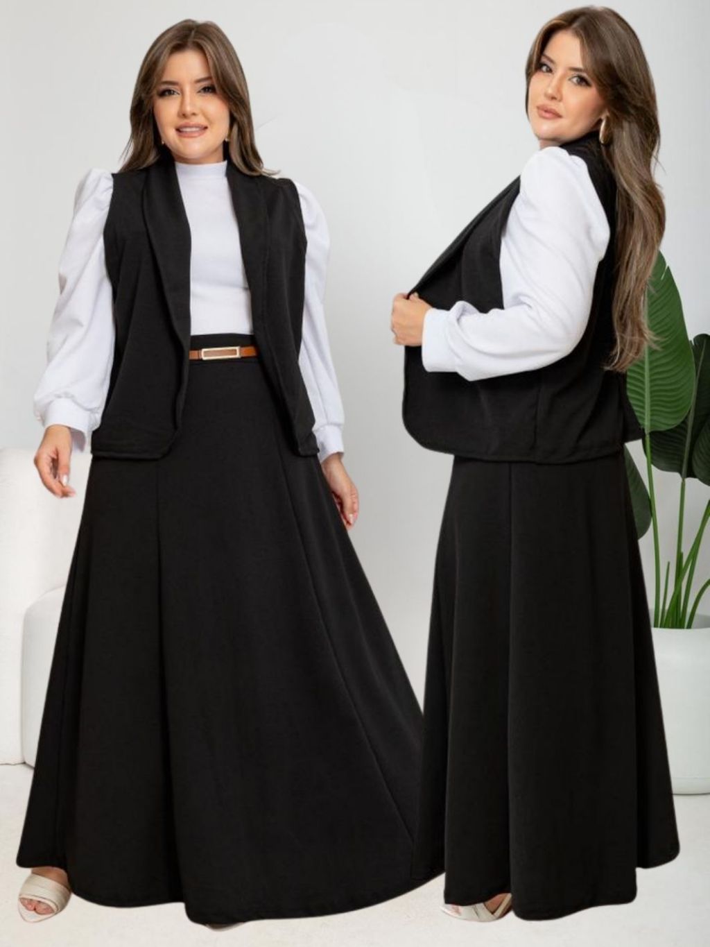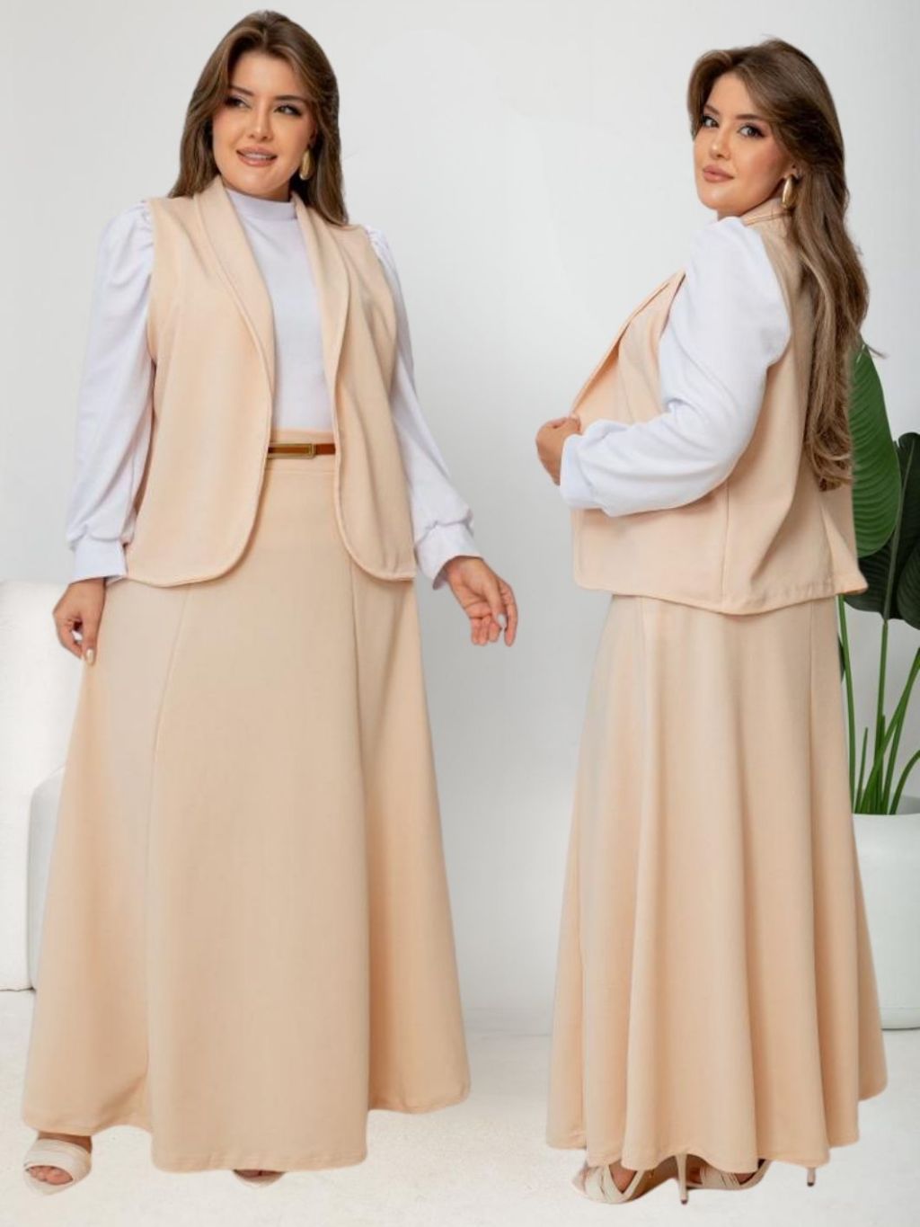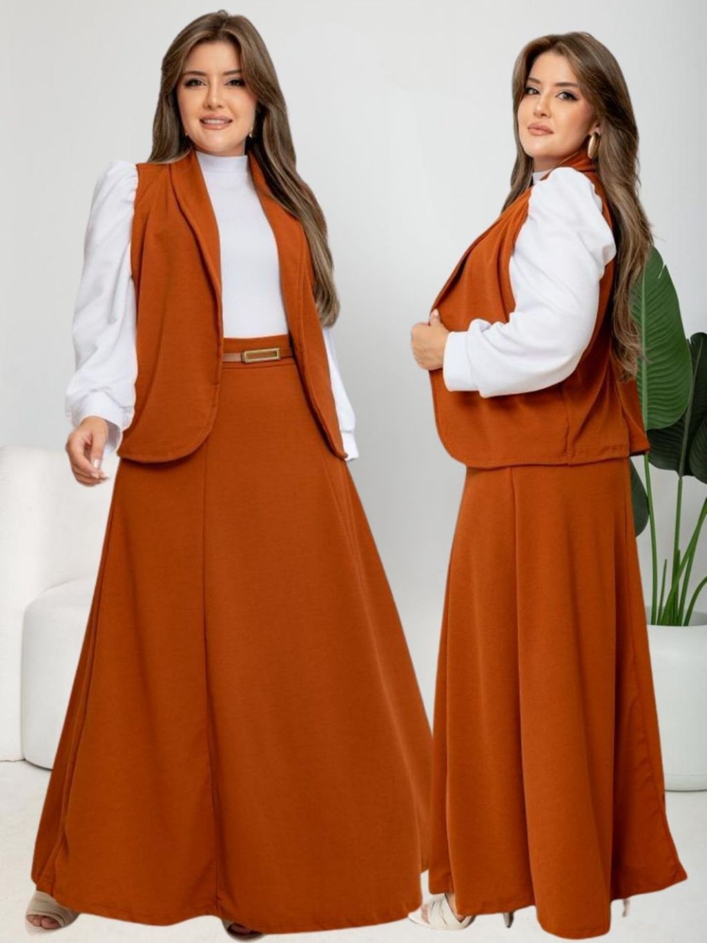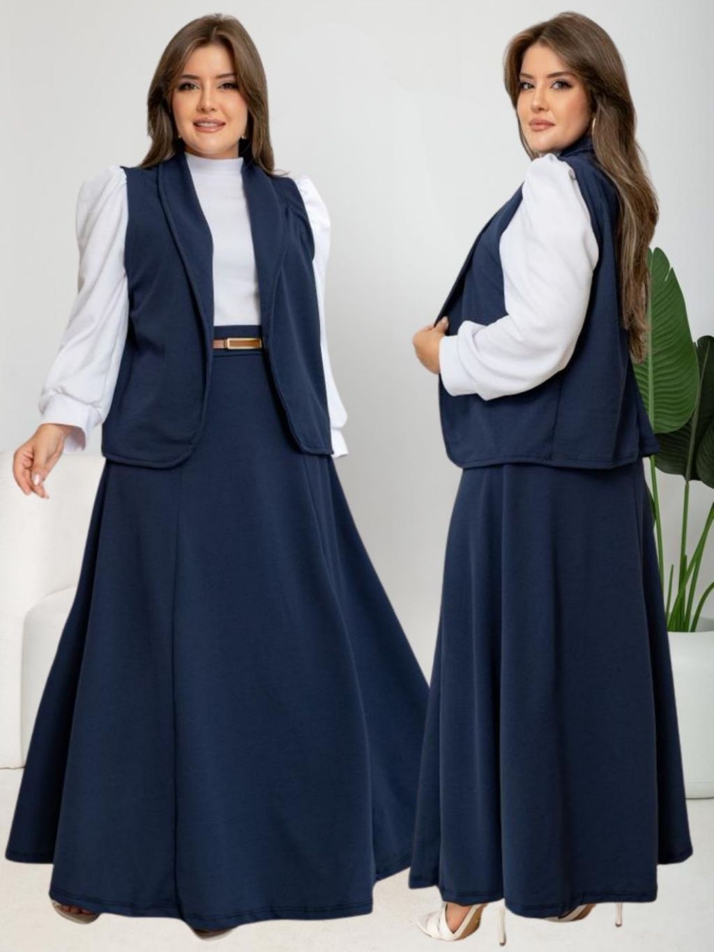 Conjunto 4 Peças Blazer Colete Blusa Feminina Estilosa Saia Longa Com Cinto Plus Size Para Congresso