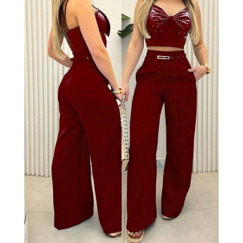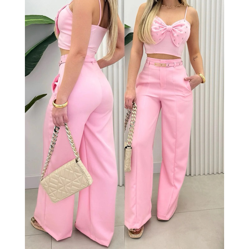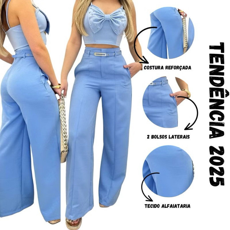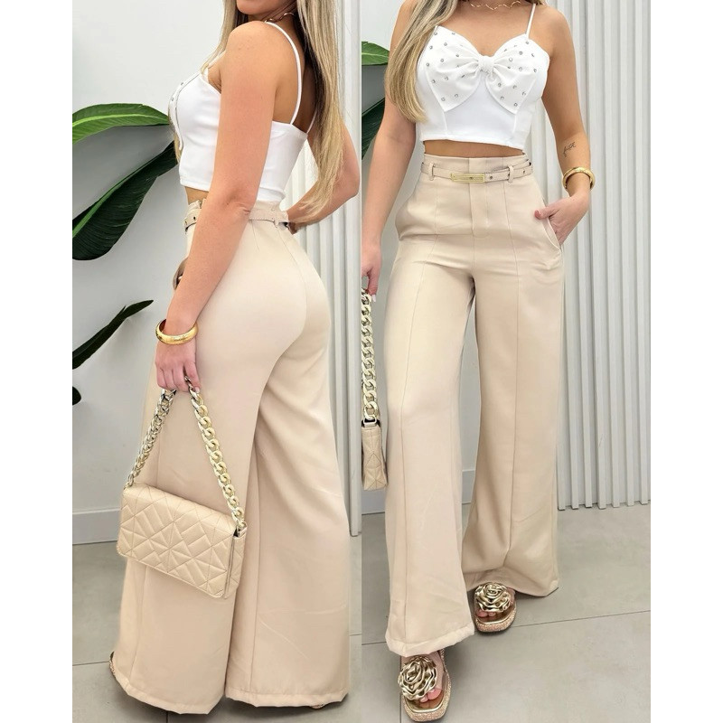 Calça Pantalona Feminina Alfaiataria Premium Social Com Cinto Luxo