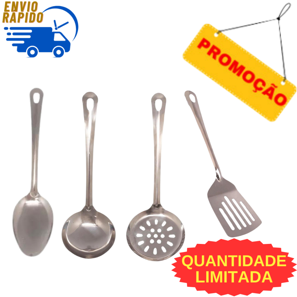 Kit Concha Escumadeira Colher de Arroz e Espátula Vazada Inox para Cozinha Casa Restaurante Buffet