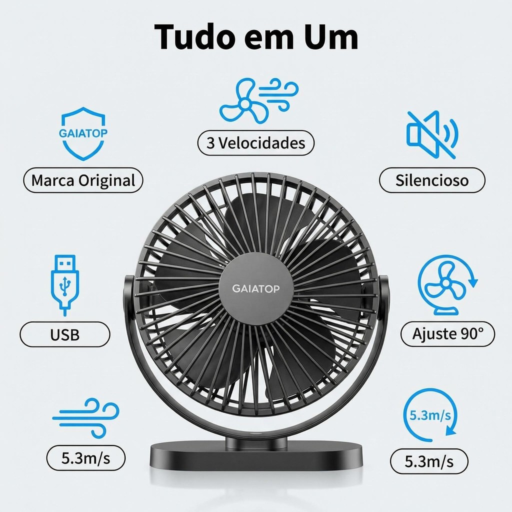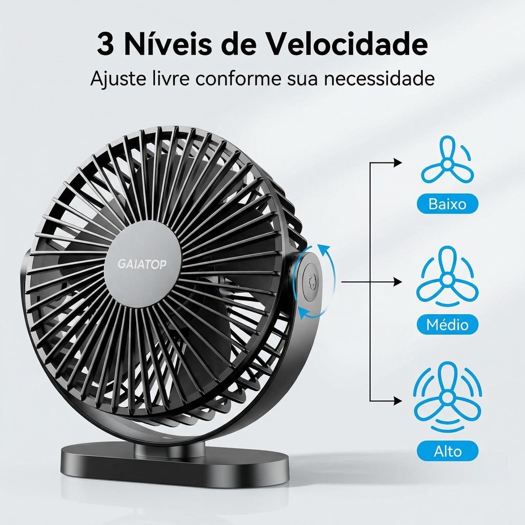 Ventilador Portátil de Mesa Gaiatop TF55 3 Velocidades com Cabo USB Ultra Silencioso