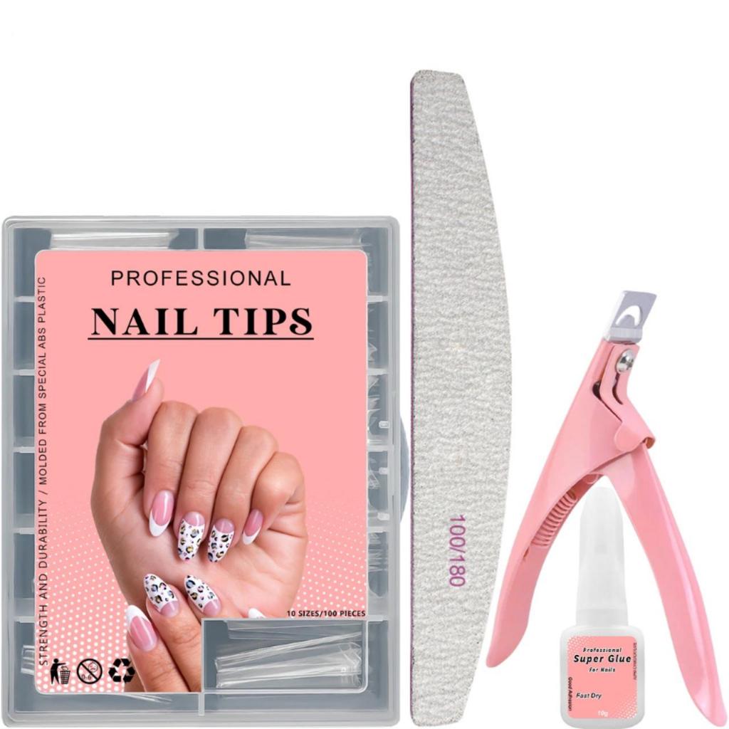 Kit Unha de Gel Completo Manicure 100 Tips + Top Coat e Primer + Alicate Cortador De Tips + Lixa Bumerang+ Gel + Cola