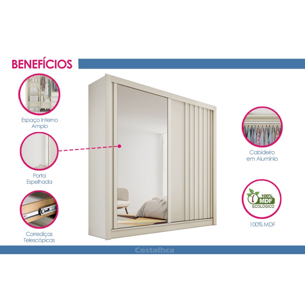 Guarda Roupa Solteiro 2 Portas de Correr (1 Ripada e 1 c/ Espelho) e 4 Gavetas Lugano Off White - Europa