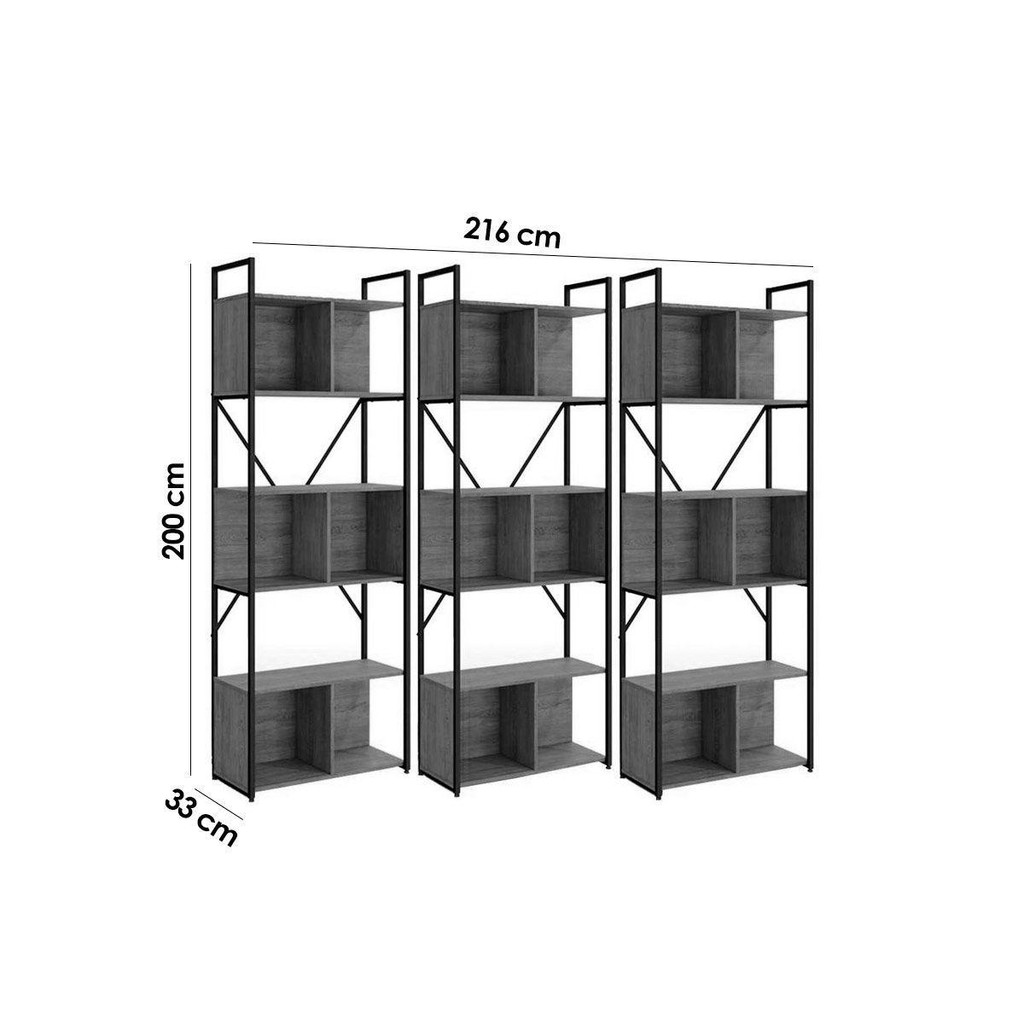Estante p/ Sala Industrial LI014 Kit 3 Un Aço Madeirado 72x200cm Freijo/Preto - Kappesberg