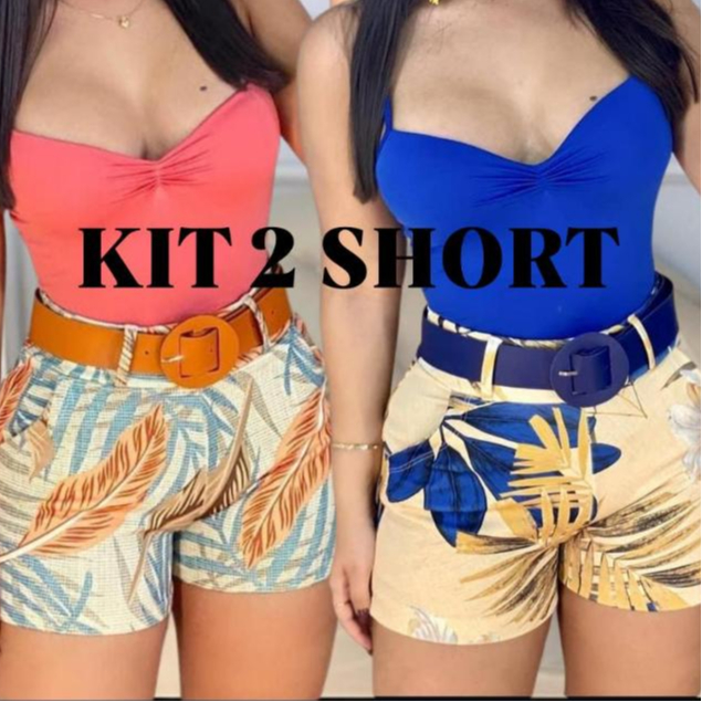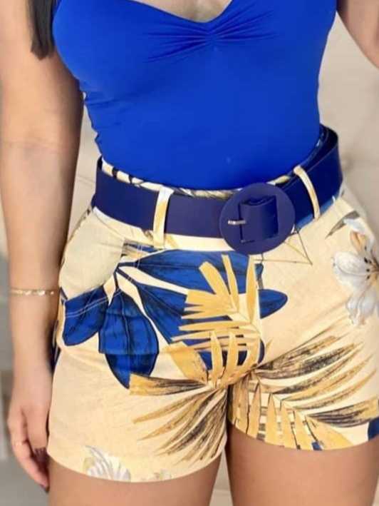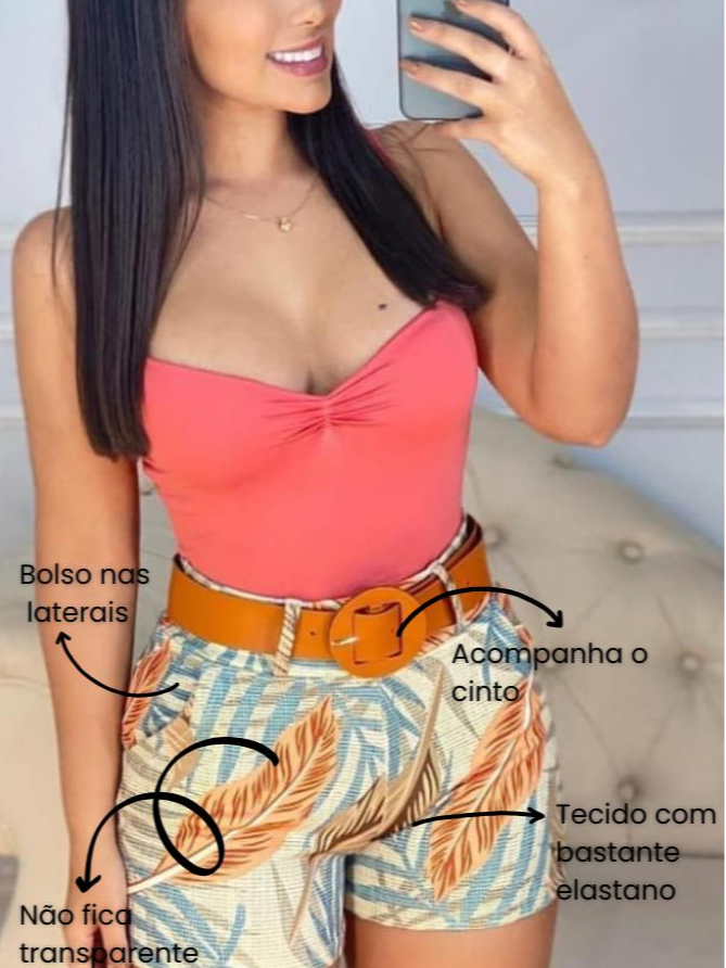 Short com Cinto Bermuda Feminina Estampada com Elastano Moda Praia Verão